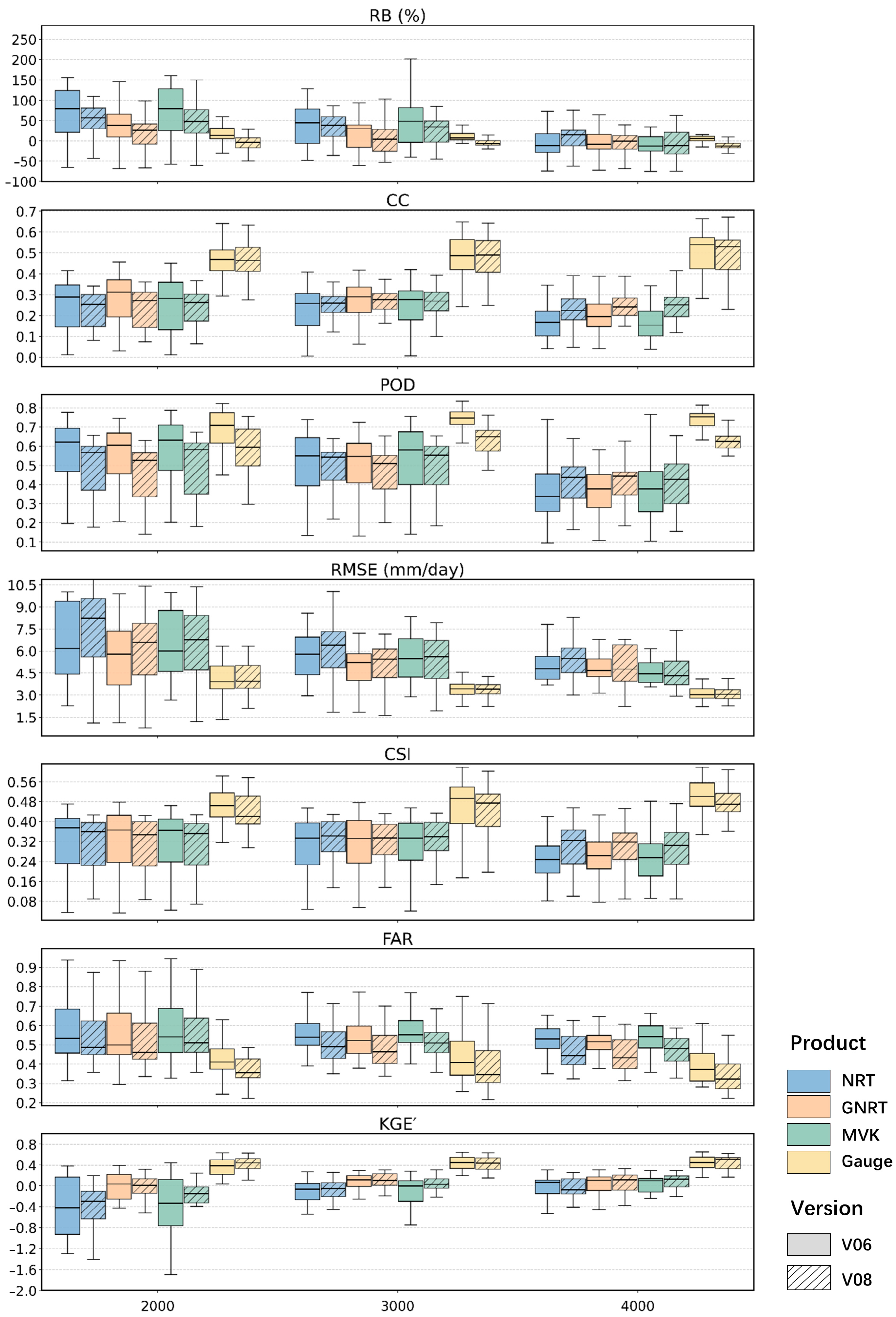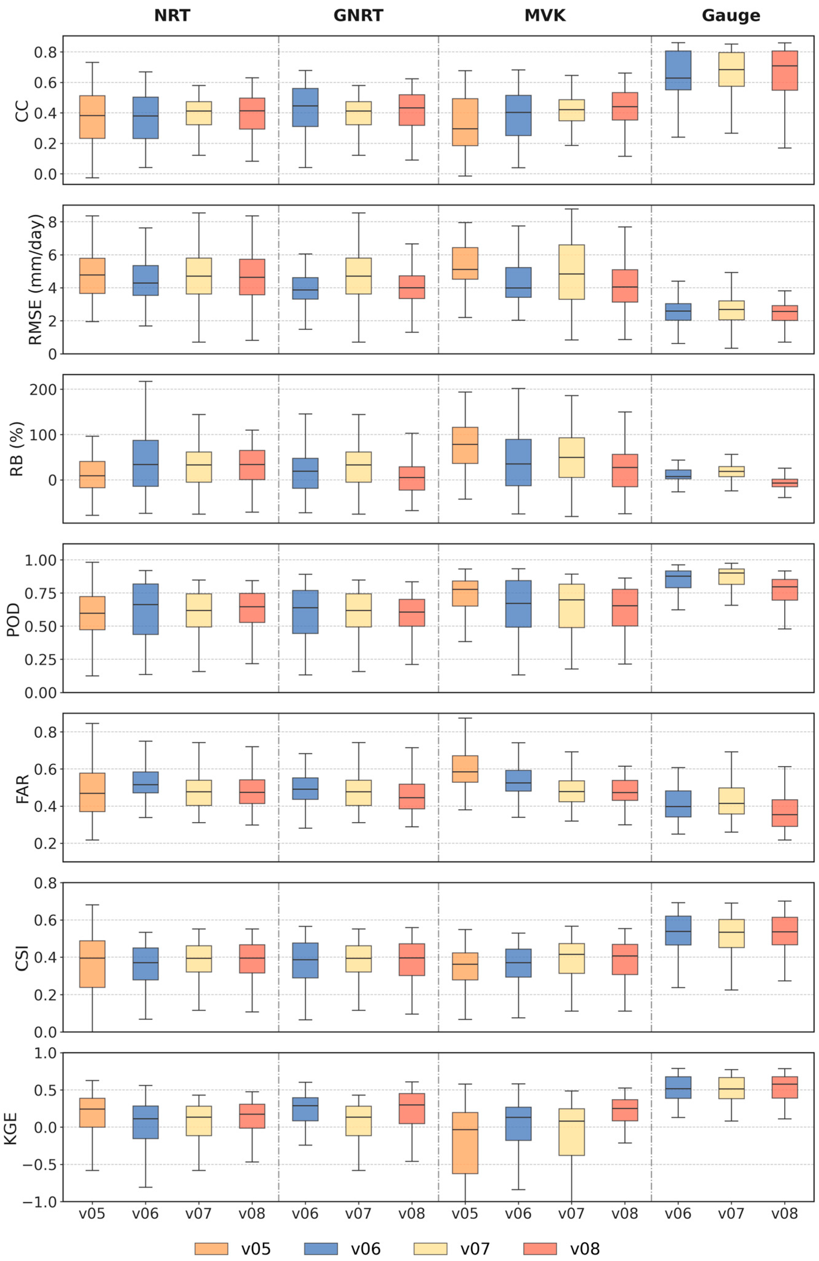 Figure S1). For consistency-related metrics, median KGE values in v08 are generally higher than those in v06 and v07 for most products, while the CC is mostly stable or shows a slight increase, with relatively clearer improvement for MVK and Gauge. For error-related metrics, the median RMSE in v08 is generally lower than, or close to, that in the earlier versions, suggesting some reduction in error levels. RB values in v08 are also more concentrated overall, and extreme biases appear less pronounced. This may indicate more stable bias behavior at the station scale, although it does not necessarily imply uniform improvement under all rainfall conditions.