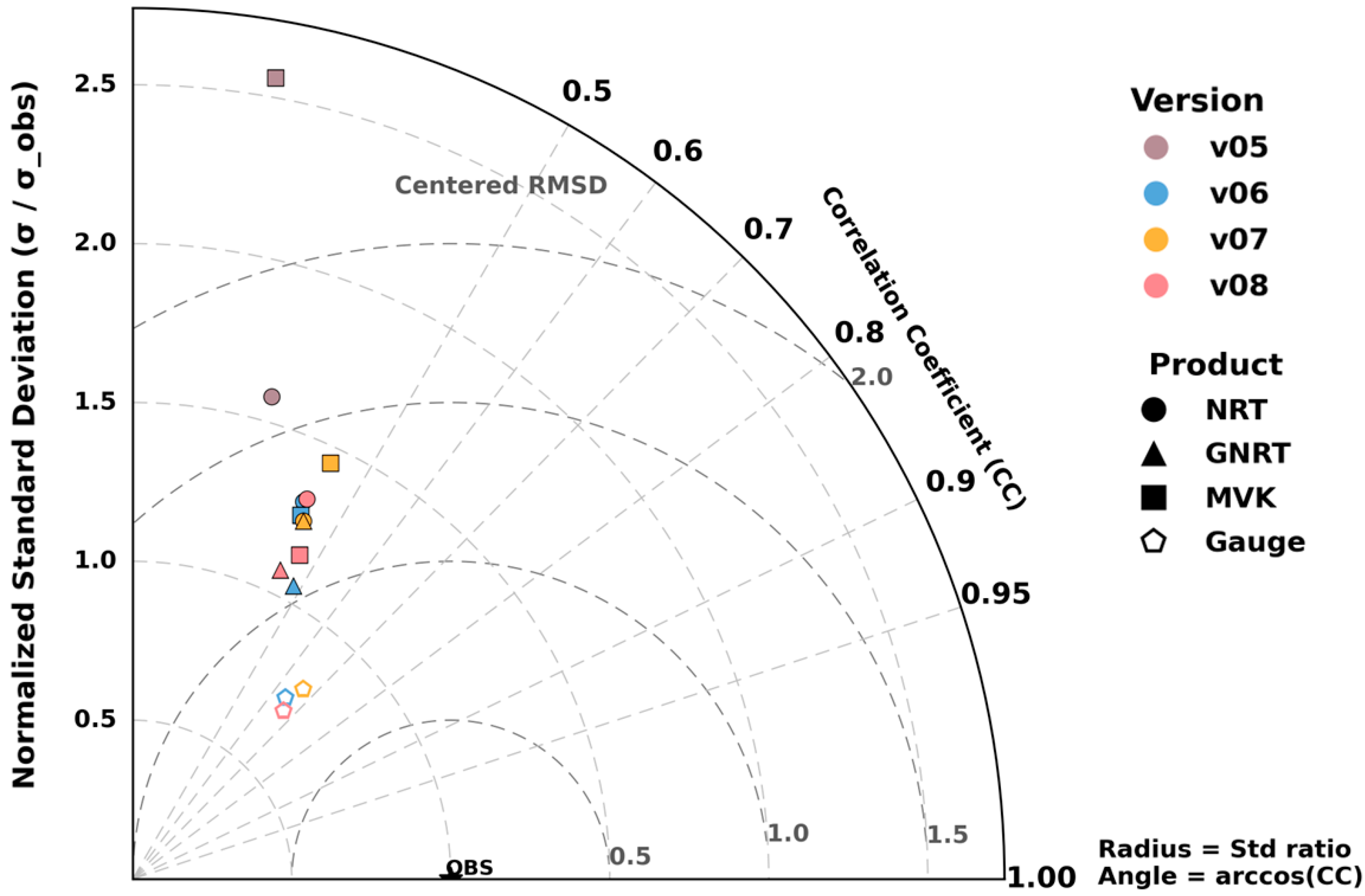 Figure 4 further illustrates the differences among GSMaP products and versions in terms of correlation, variability representation and centered error [