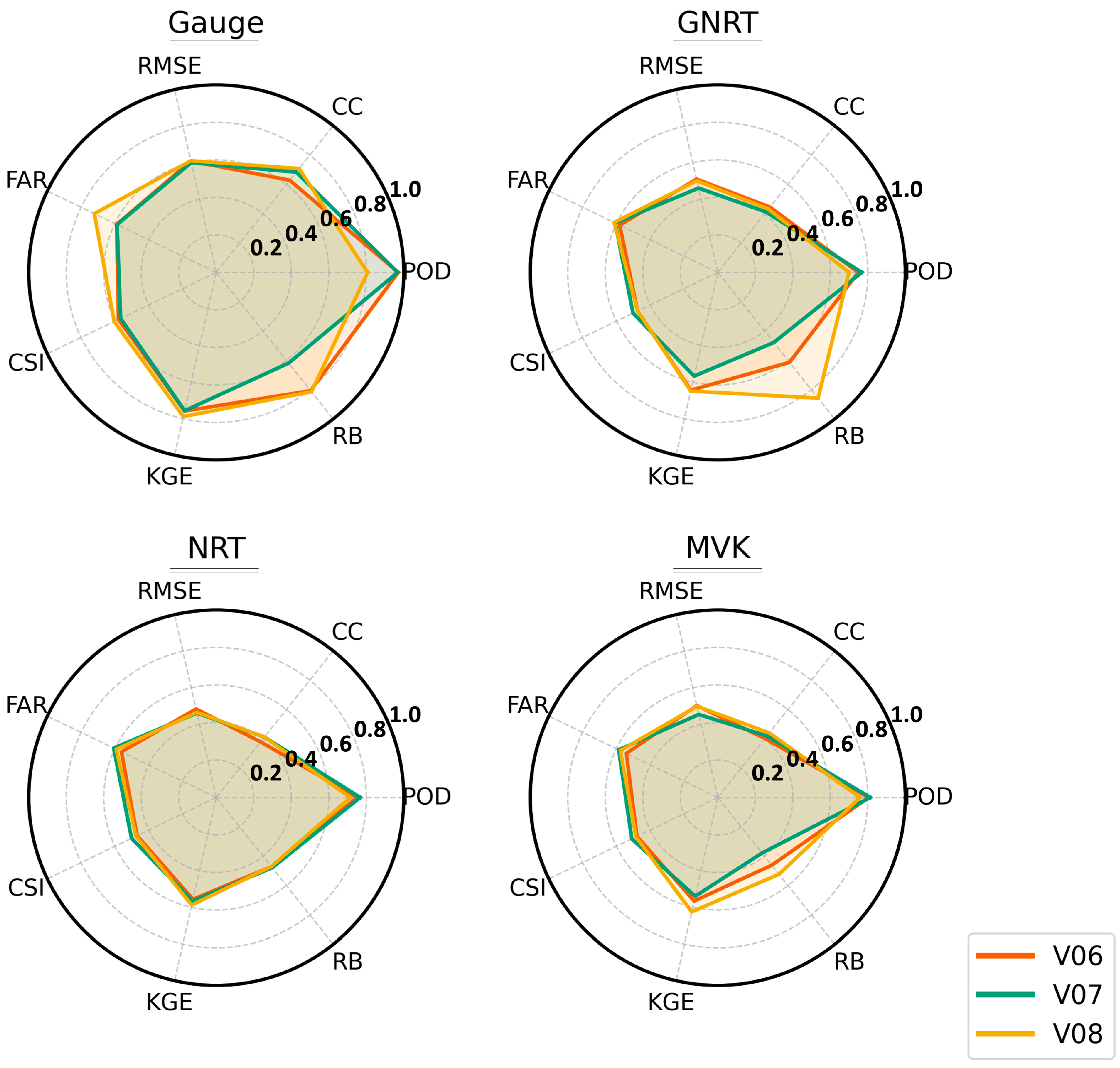 In terms of version changes, v08 shows a larger radar area for most products, although this improvement is not uniform across all metrics and varies by product. For GNRT and MVK, the increases in KGE and the CC are more evident in v08 and the normalized RB and RMSE values are also generally improved, which may indicate better consistency and reduced error at the station scale in the newer version. NRT also shows some improvement from v06 to v08, mainly in KGE, the CC and RMSE, although the magnitude of change remains relatively limited. In contrast, the POD and CSI do not increase consistently across all products, and for some non-gauge products, the differences between v07 and v08 are small, with a few metrics in v07 remaining comparable to, or slightly better than, those in v08. These version-related differences may be associated with algorithm refinements and updates in data processing, but their effects are clearly product-dependent.
