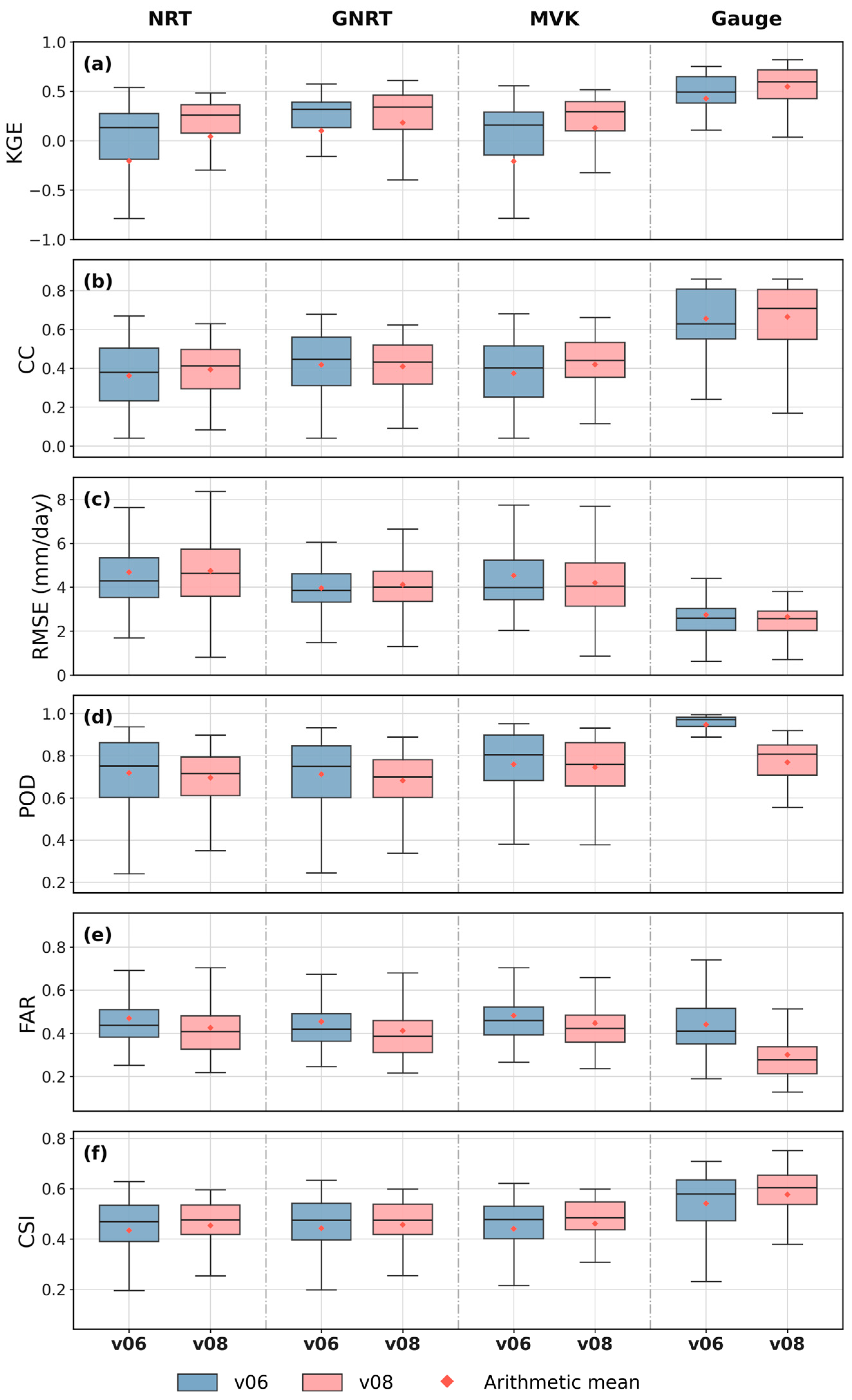 Figure 6 compares the differences in several station-based evaluation metrics among the four GSMaP products in v06 and v08. Overall, the changes associated with the version update are not entirely consistent across products, but most metrics suggest that v08 shows improvement over v06 in several respects. Among the four products, Gauge still exhibits the best overall performance in both versions, maintaining relatively high levels in correlation, consistency and event detection. In v08, its KGE, CC and CSI increase further, while the FAR decreases markedly, suggesting that its overall performance and stability have both improved. MVK also shows relatively clear improvement, especially in KGE and the CSI, where the gains are more evident. By contrast, the changes in GNRT and NRT are more limited. Some metrics show only slight improvement, and their overall gains are smaller than those of Gauge and MVK.
