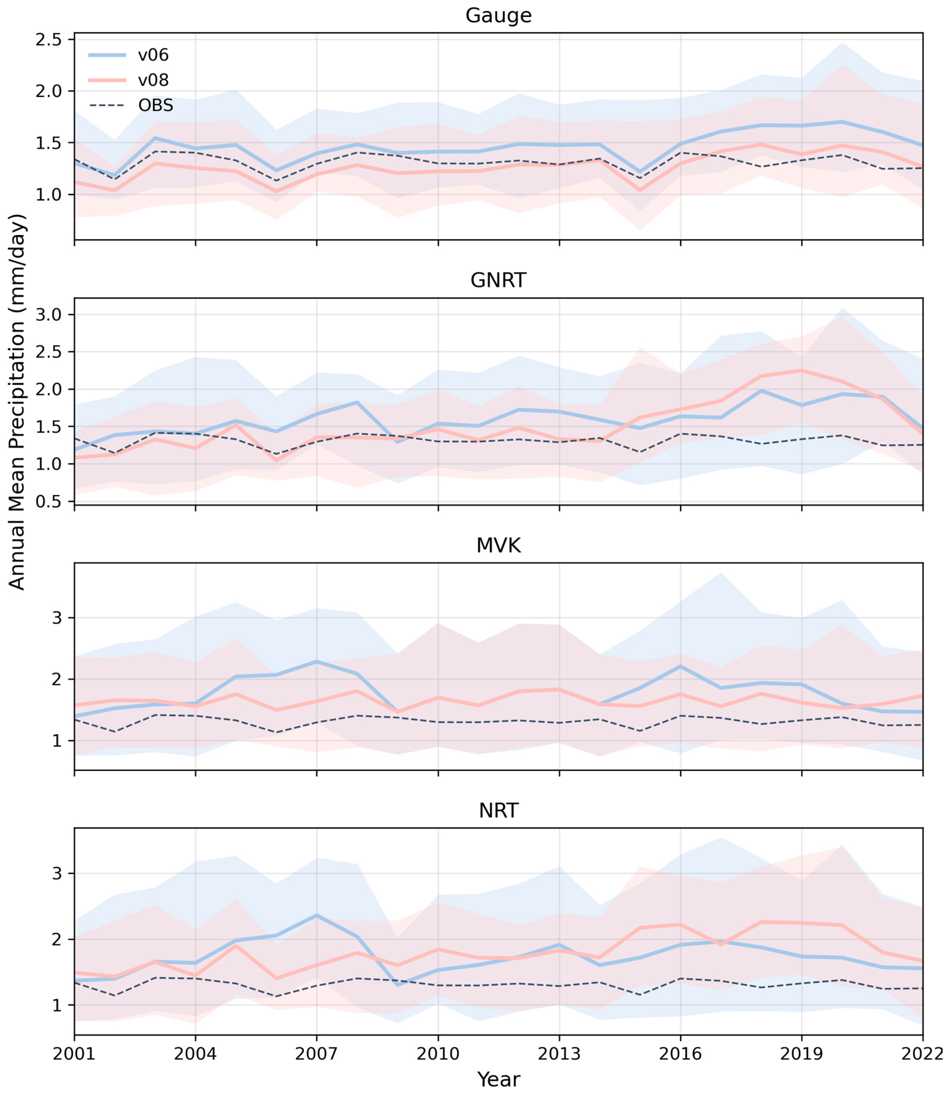 For the Gauge product, both versions follow the observed interannual variation relatively well. Annual mean precipitation is mostly within 1.1–1.6 mm/day. Compared with OBS, v06 is slightly higher in most years, whereas v08 is generally closer to the observations and has a narrower uncertainty range, indicating better long-term consistency. Version differences are more evident for GNRT. Compared with v06, v08 generally follows the observed interannual pattern more closely, suggesting improved temporal consistency. However, noticeable overestimation still appears in some later years, indicating that the improvement is more evident in temporal tracking than in magnitude control. MVK also shows clear version differences. In v06, some years show stronger fluctuations and higher peaks, with values clearly above the observations. By contrast, v08 is smoother, with weaker peaks and values closer to the long-term observed mean, suggesting improved long-term stability. Even so, MVK remains generally higher than the observations in both versions. NRT shows the strongest interannual fluctuation and the widest spread among the four products, indicating the weakest long-term stability. In both v06 and v08, its annual mean precipitation is generally higher than the observations and its variability is clearly larger than that of the other products.