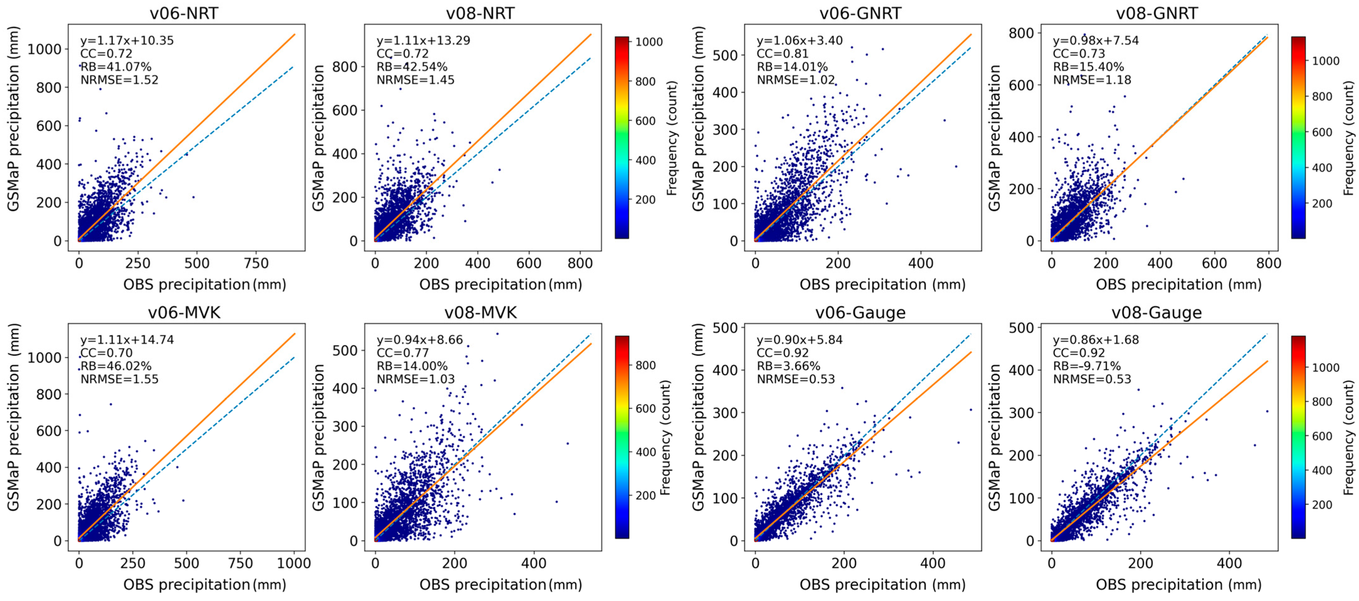 Figure S2) further shows that, with version progression, the point clouds of GNRT and MVK become more compact and move closer to the 1:1 line. Gauge maintains the most stable scatter structure across versions, whereas NRT shows the largest dispersion in all versions, especially under high precipitation conditions.