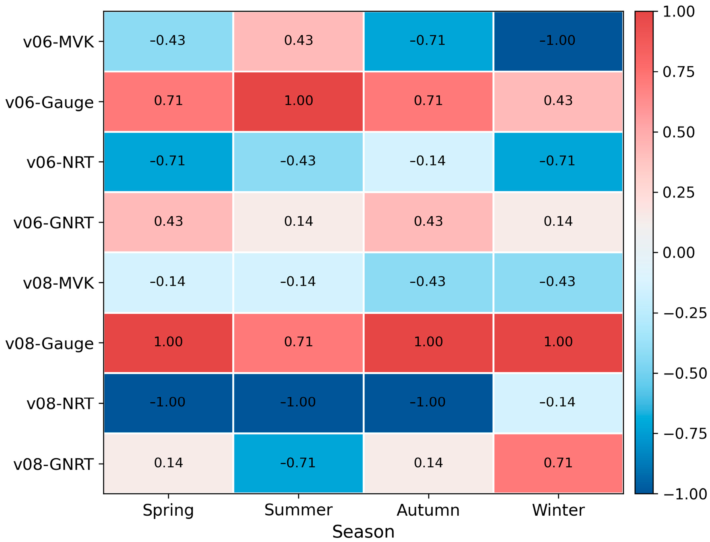 More specifically, spring precipitation is generally weak and unevenly distributed, so consistency remains relatively low for all products. The CC is mostly in the range of 0.1–0.4, while the POD and CSI are often below 0.4 and the FAR remains comparatively high. Gauge still performs best overall, with the CC reaching about 0.7, but the differences between versions are small, suggesting that version updates provide only limited improvement under light-precipitation conditions. Summer is the best-performing season. The POD is usually above 0.6 and the CSI increases to about 0.4–0.6, indicating that warm-season precipitation is more effectively detected by satellite and shows the strongest agreement with observations. Gauge remains the most stable product in terms of correlation and event detection and GNRT and MVK also show some improvement in v08. However, RMSE and RB remain relatively high in summer, with RMSE commonly in the range of 30–60 mm/day, suggesting that magnitude errors during heavy rainfall are still not fully resolved. Autumn is a transition season, and its performance generally lies between summer and winter. Some non-gauge-adjusted products show increases of about 0.05–0.10 in the CC and CSI in v08, but RB does not decrease accordingly, and bias still exceeds 20% for some products. Winter shows the weakest overall performance. For most products, the CC falls below 0.2, the CSI and ETS approach 0, and the FAR and RB increase markedly; RB can even exceed 100% for some unadjusted products. Overall, Gauge remains the most stable product across all seasons, GNRT and MVK show some improvement in the warm season, and NRT still exhibits relatively large uncertainty in winter and overall. More detailed seasonal metric values are provided in