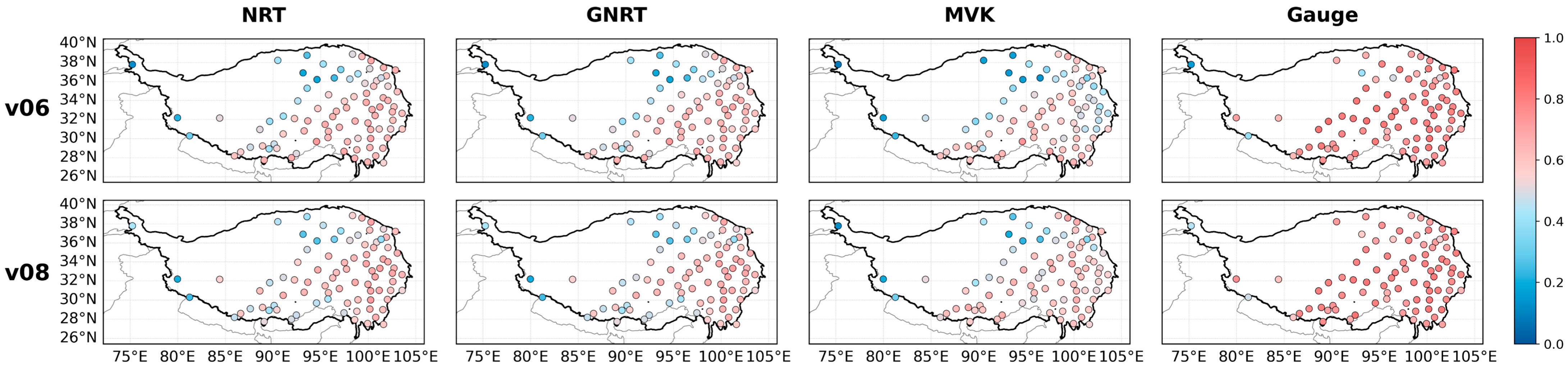 Figure 11 presents the spatial distribution of the differences in the individual metrics between v08 and v06, so as to illustrate the relative improvement or decline of different products at the station scale and to provide additional explanation for the overall spatial pattern reflected in