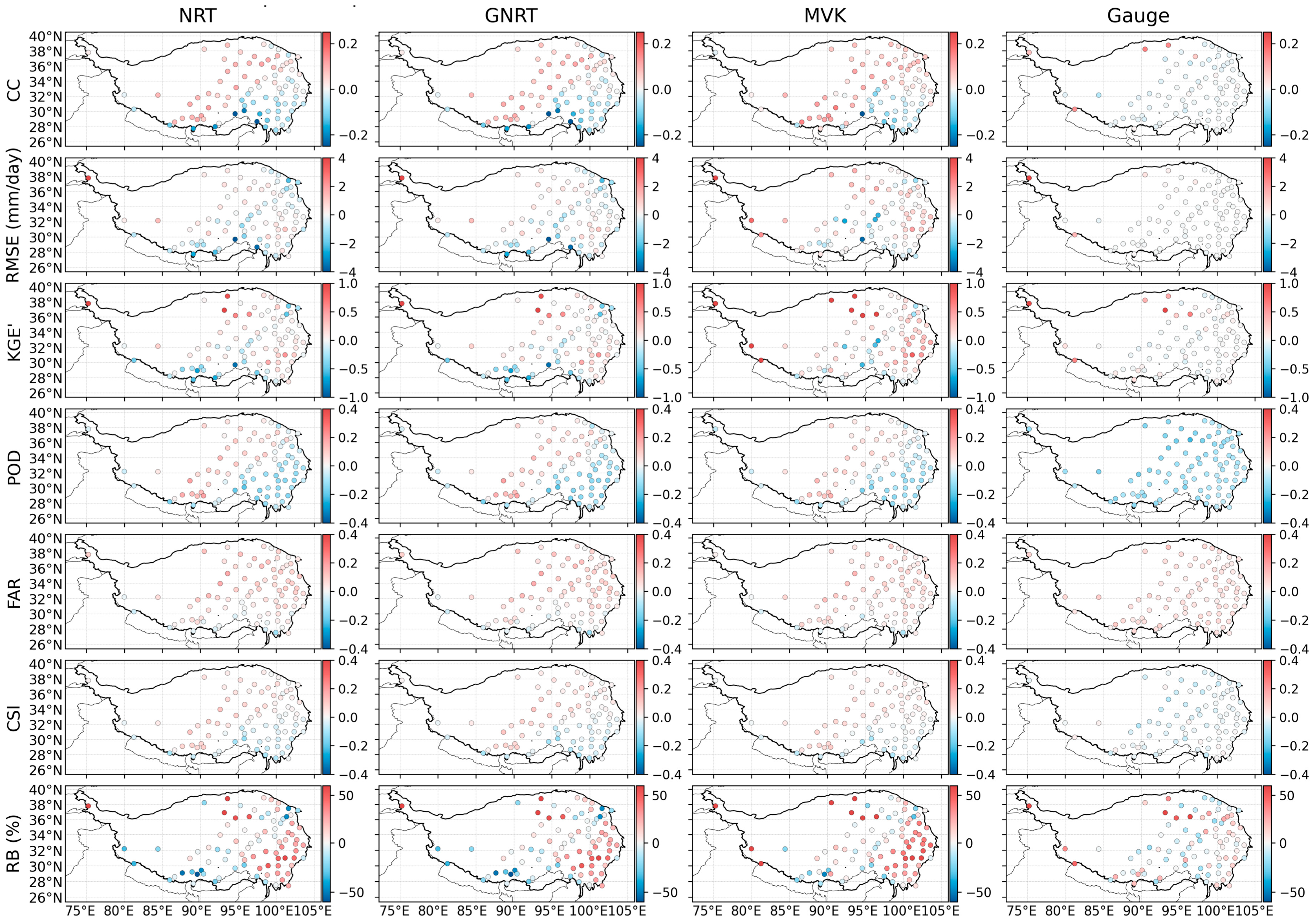 Differences among products are also apparent. Gauge and GNRT show relatively smaller biases across all intervals, suggesting that their rainfall intensity structures are closer to the observations. By contrast, MVK and NRT show larger positive bias in the 0 ≤ p ≤ 1 mm/day interval and stronger negative bias in the p > 10 mm/day interval, suggesting that these two products are more likely to overestimate the contribution of weaker precipitation while underestimating the contribution of the highest-intensity precipitation.