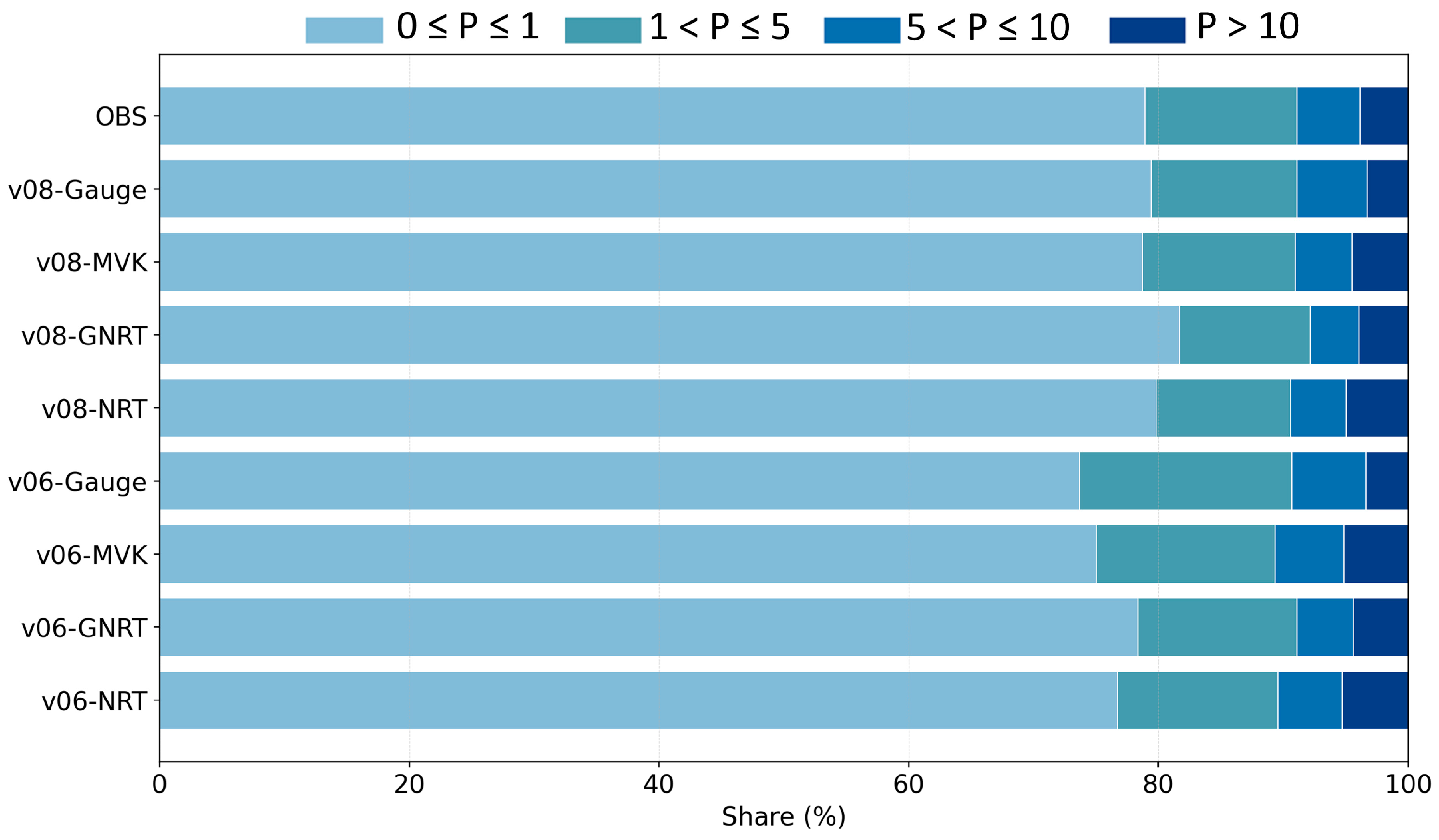 p > 10 mm/day intervals contribute much less. All GSMaP products reproduce this broad intensity structure, suggesting that they capture the main pattern of regional rainfall intensity distribution.