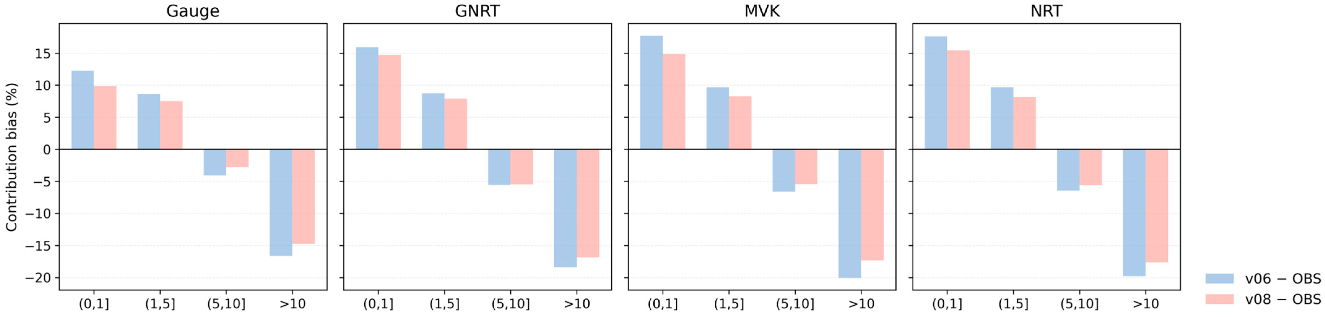 Overall, the response to version updates differs among products from v06 to v08. Gauge shows the most stable improvement, while GNRT and MVK also improve to some extent. In contrast, NRT still shows strong fluctuations and persistent positive bias, suggesting limited long-term stability.