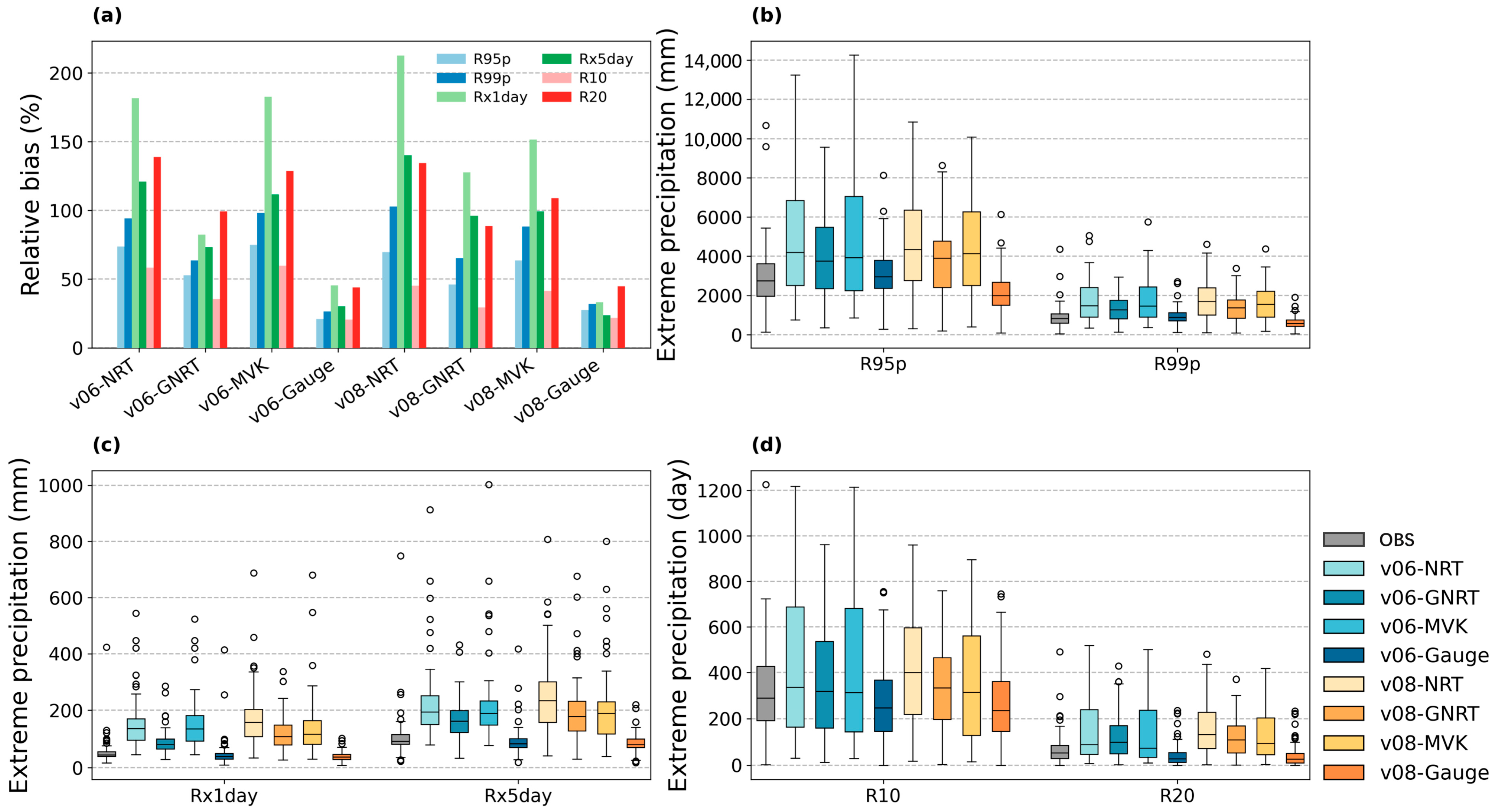 Panel (c) shows the station distributions of Rx1day and Rx5day. For all products, Rx5day has higher medians and larger spread than Rx1day, with median values often 2–3 times larger, indicating stronger spatial variability for persistent heavy rainfall. Most satellite products overestimate both indices relative to OBS and show many high-value outliers, while GNRT and Gauge have tighter boxes. Compared with v06, v08 shows slightly lower medians and smaller interquartile ranges, but uncertainty for persistent heavy rainfall remains relatively high.