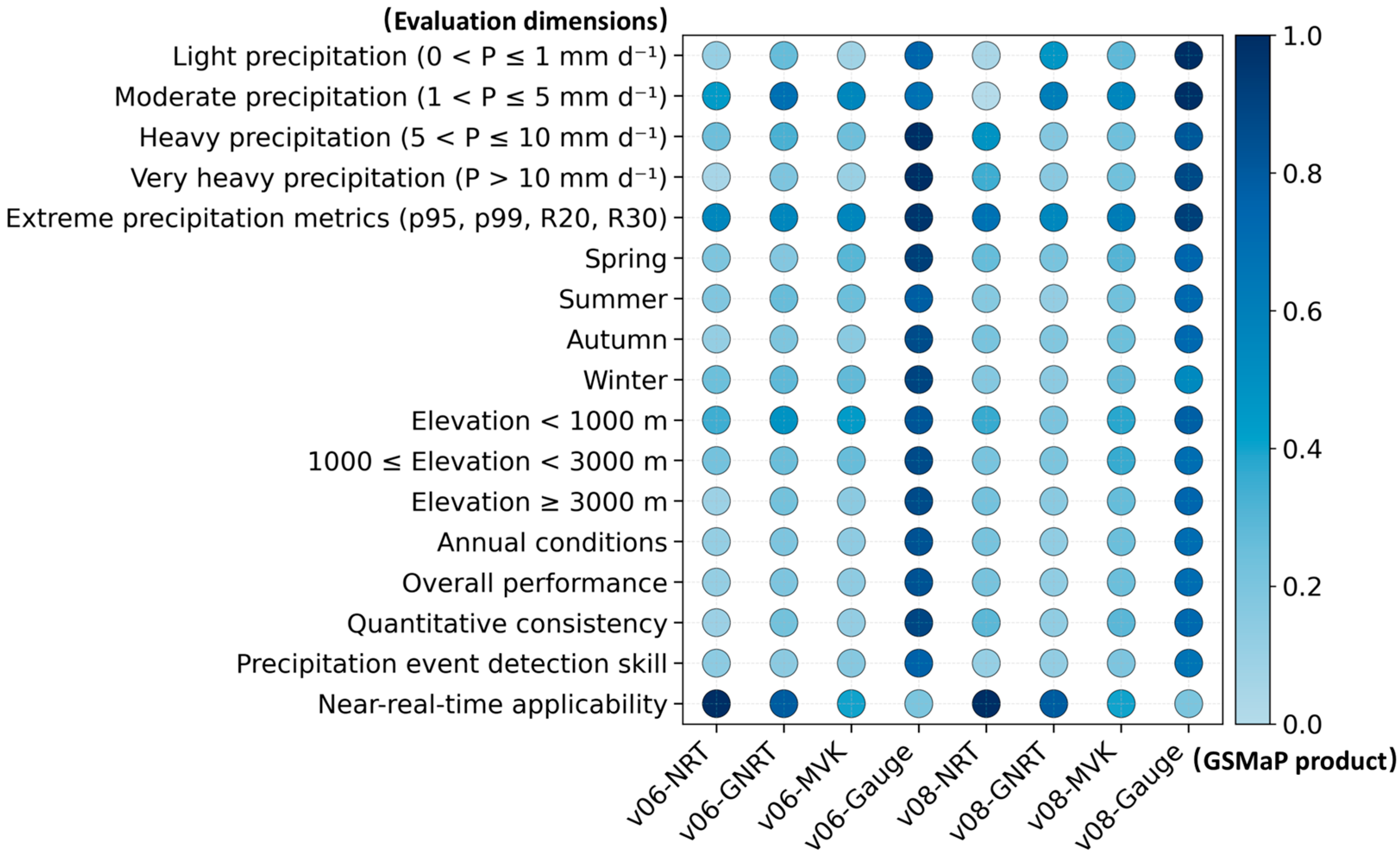Figure 16. Clear differences appear among GSMaP versions and products across the evaluated dimensions. This result shows that no single product performs best under all conditions. Gauge-adjusted products perform well in most categories, especially for extreme precipitation, seasonal scales and different elevation ranges. This indicates improved quantitative agreement and enhanced stability. Among the products, v08-Gauge attains the highest scores and shows the strongest performance in general evaluation, extreme precipitation detection and across different environmental conditions.