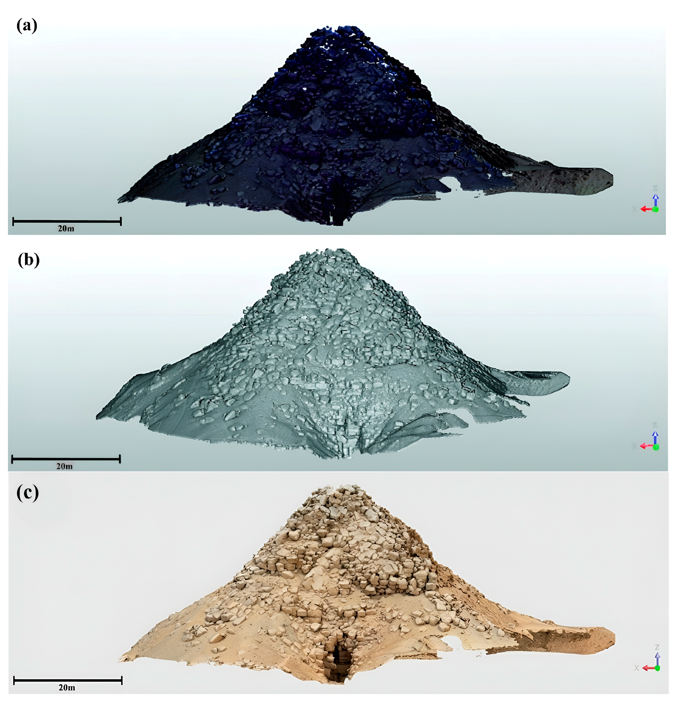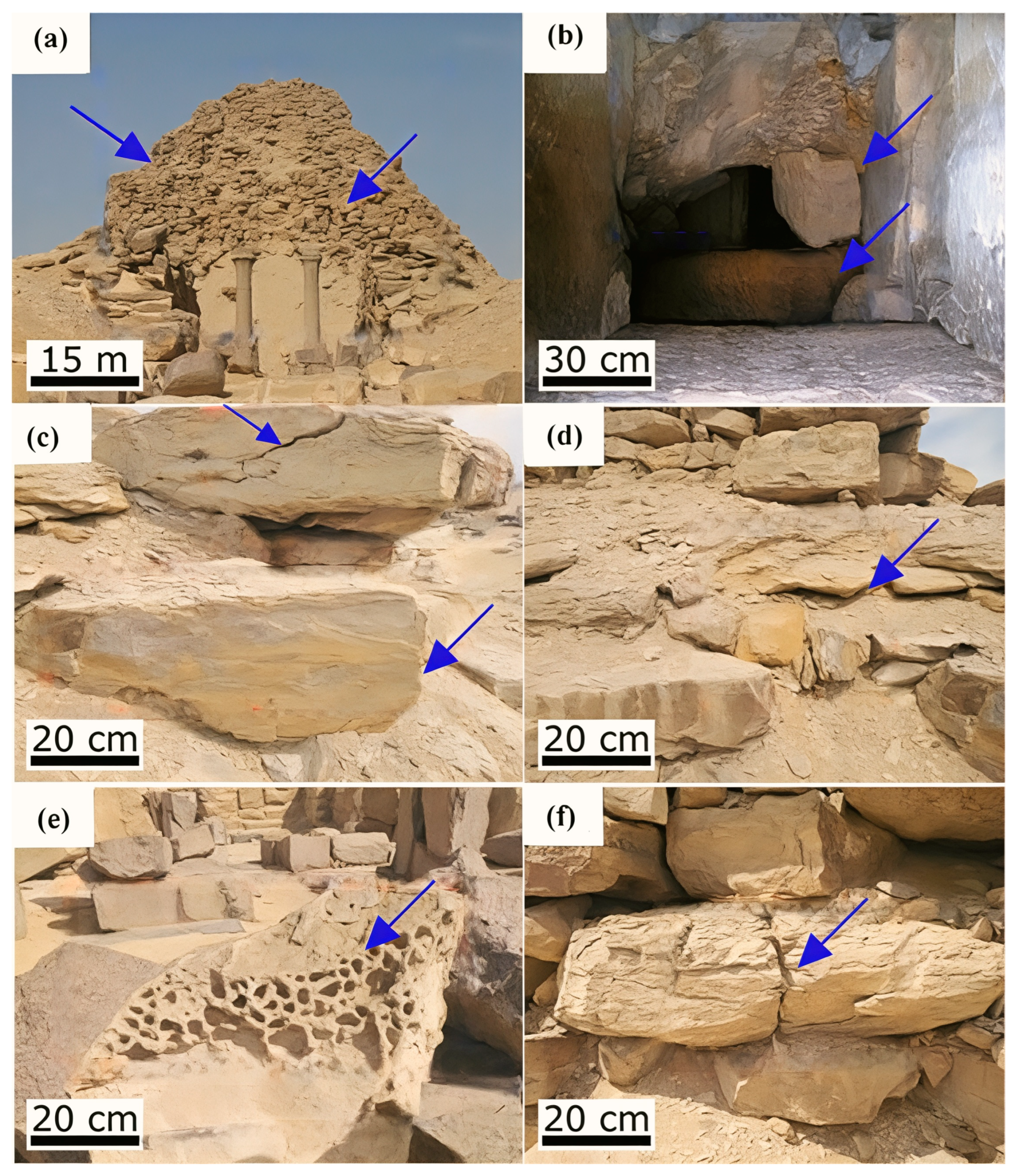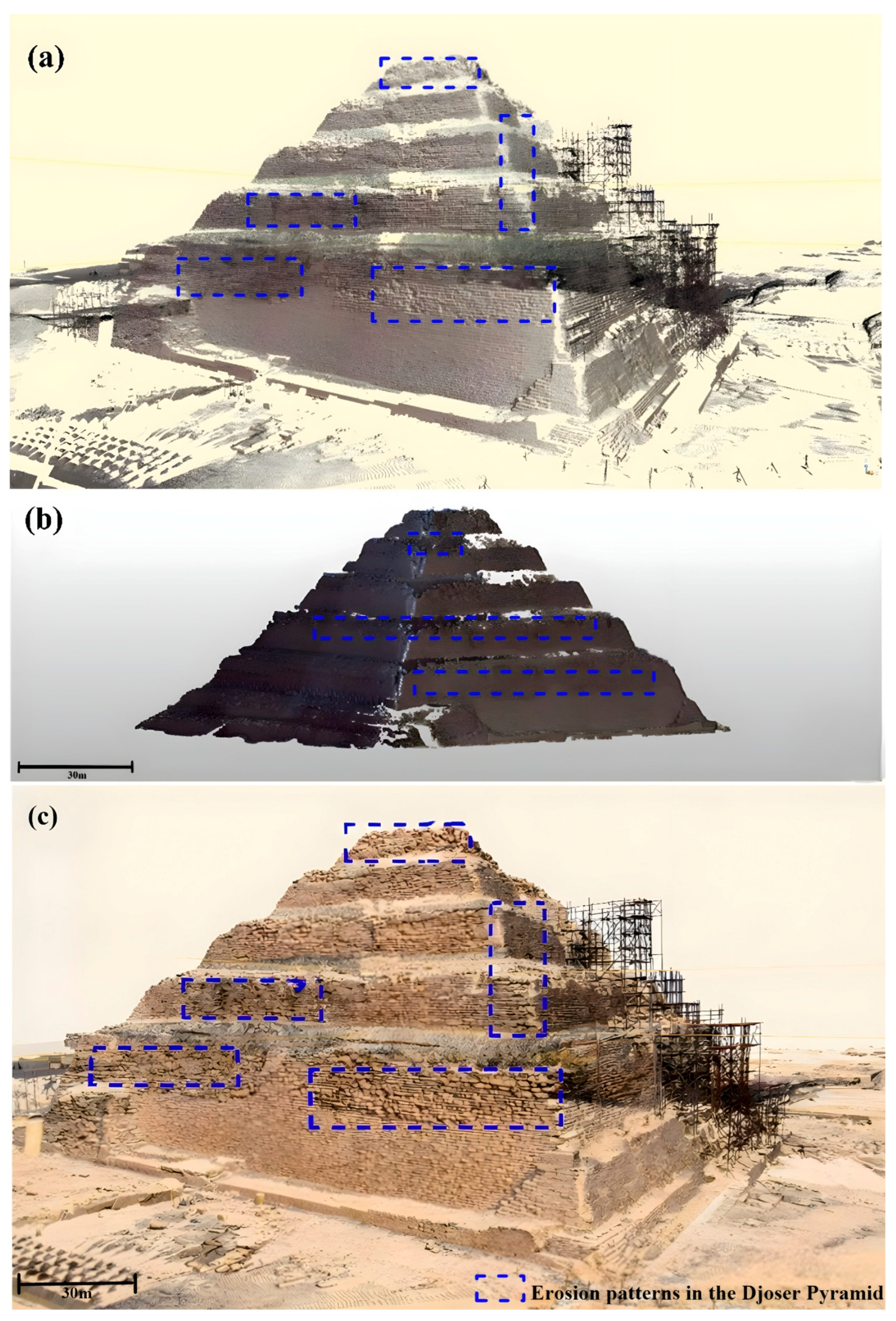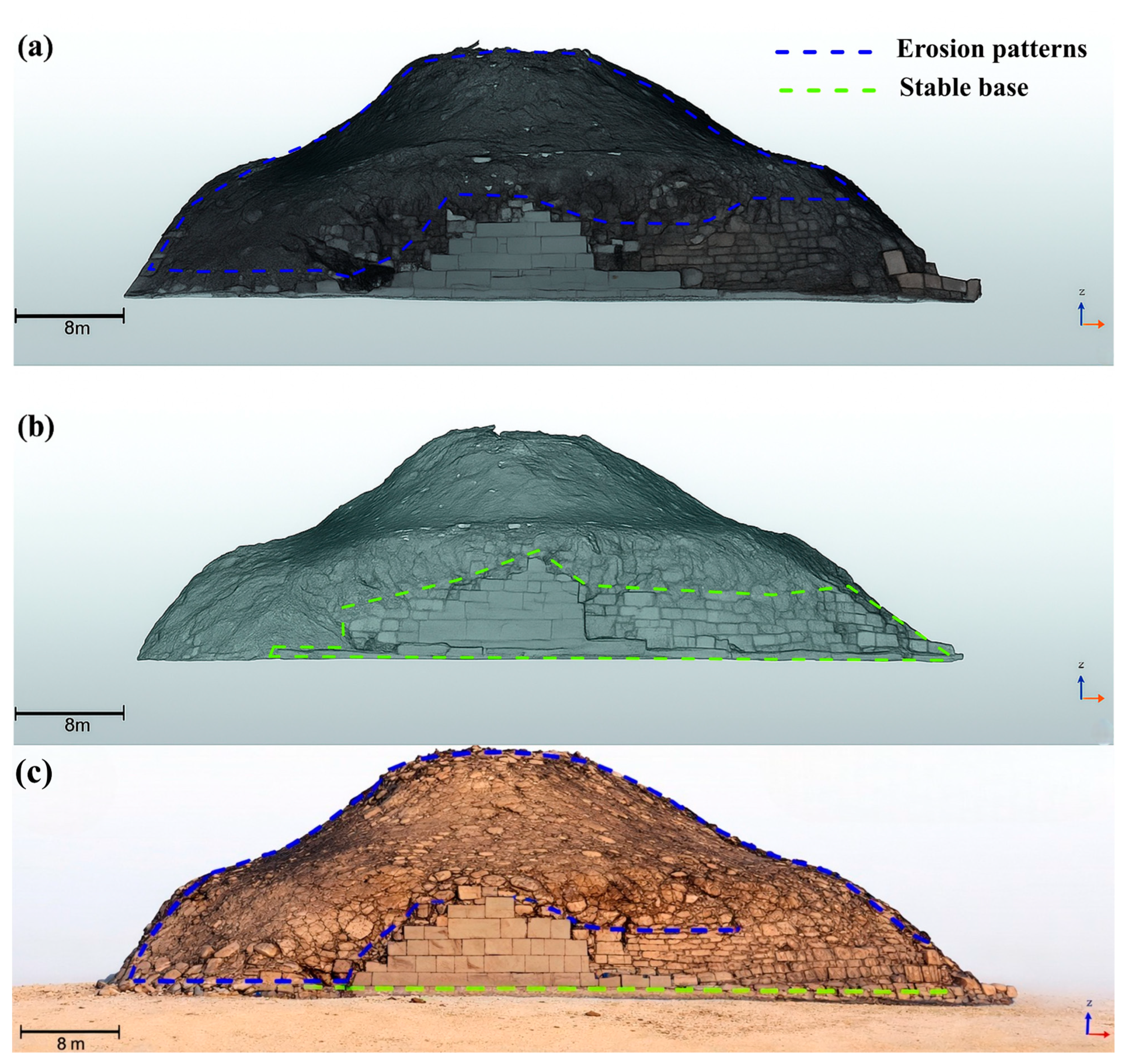 - Quantitative analysis revealed major structural degradation, including height losses of ~53% (Unas), ~66% (Teti), and ~63% (Userkaf), and localized deformation up to 4.2 cm at Teti’s southern flank.
