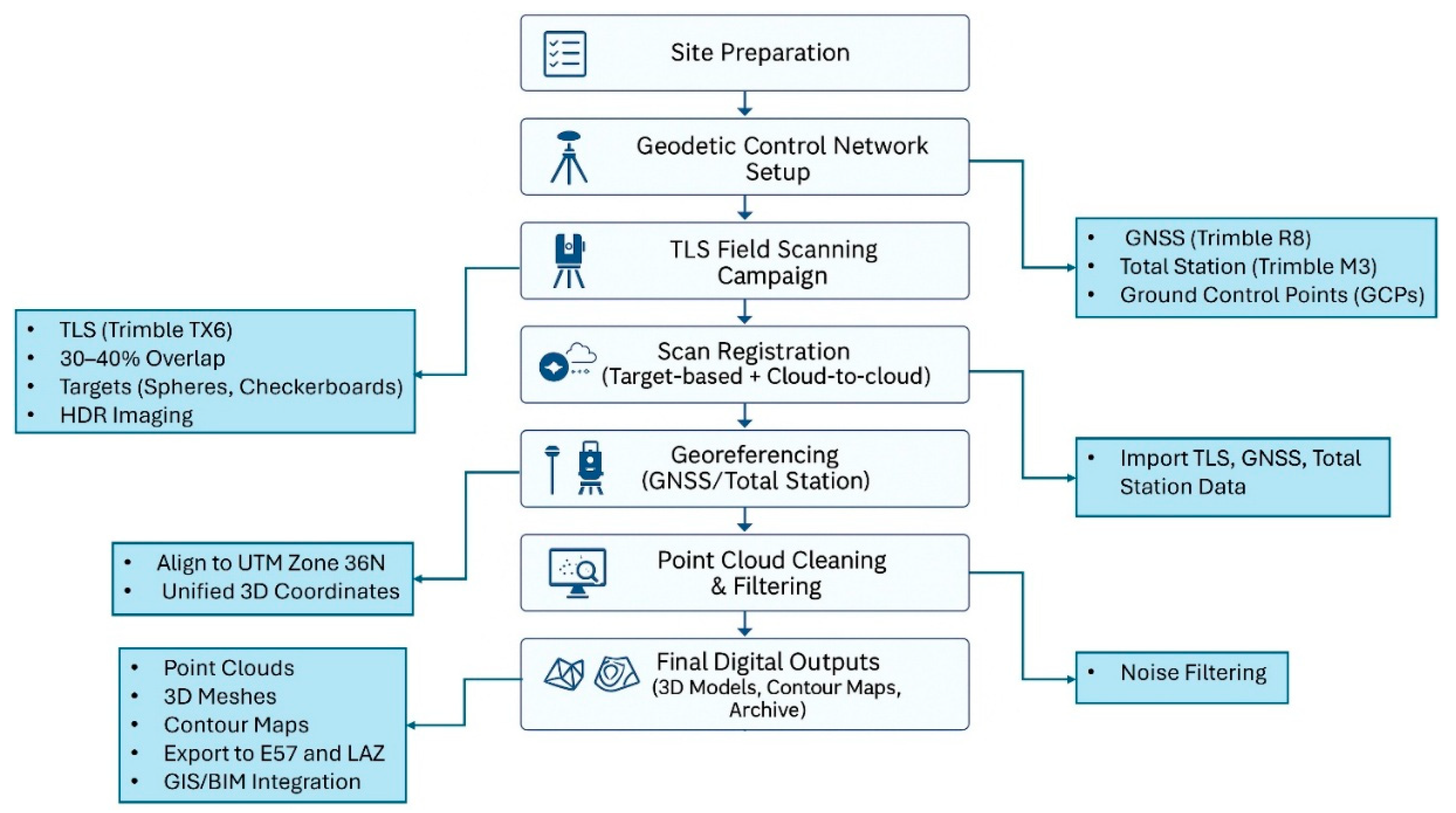 | Positioning and Integration | Integrated with GNSS and Total Station control points (for georeferencing) |