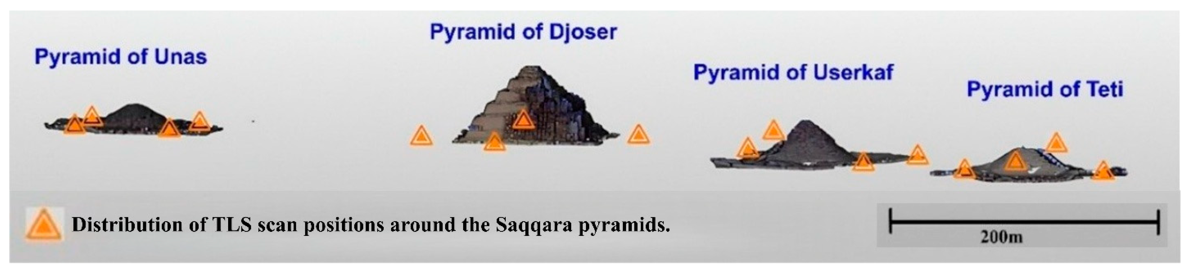 APA StyleElbshbeshi, A., Mohamed, A., & Ibraheem, I. M. (2026). High-Resolution 3D Structural Documentation of the Saqqara Pyramids, Egypt, Using Terrestrial Laser Scanning and Integrated Geomatics Techniques for Heritage Preservation. Remote Sensing, 18(8), 1138. https://doi.org/10.3390/rs18081138
