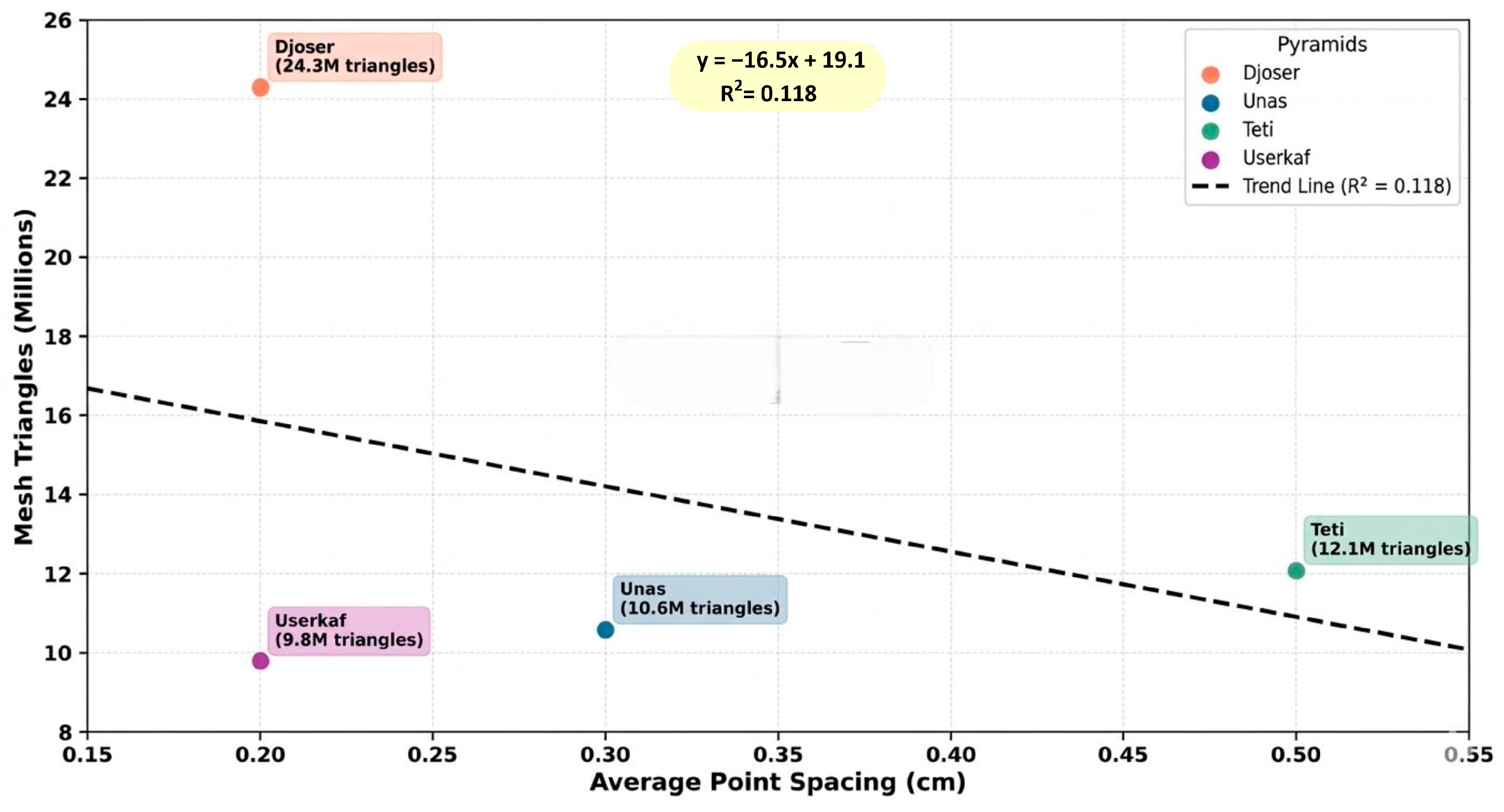 | Pyramid | Avg. Point Spacing (cm) | Approx. Triangles in Mesh Model (Million) | Notable Features Captured |