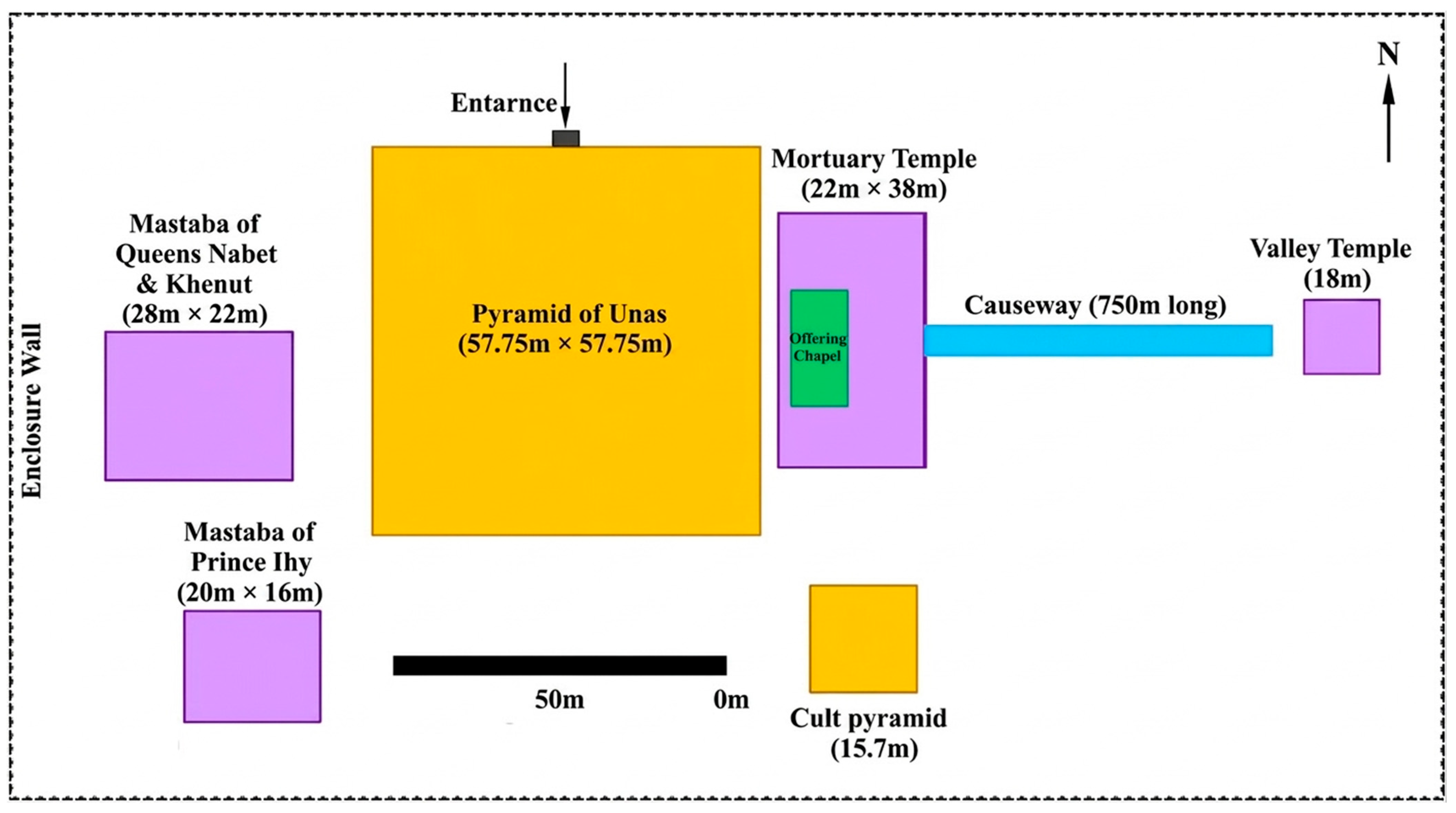 | Unas | 0.3 | ~10.6 | Collapsed sections, preserved core masonry courses, slope remnants |