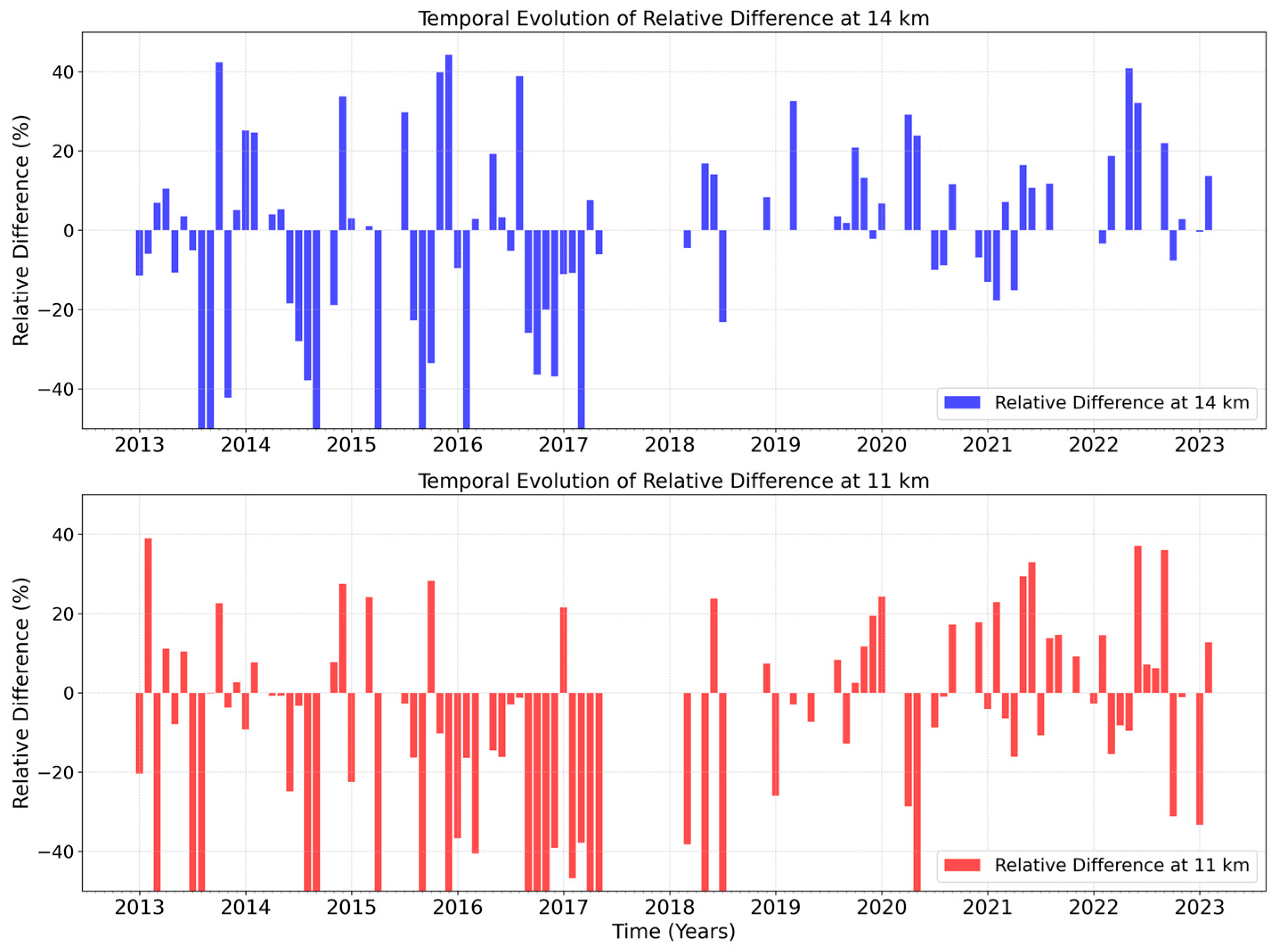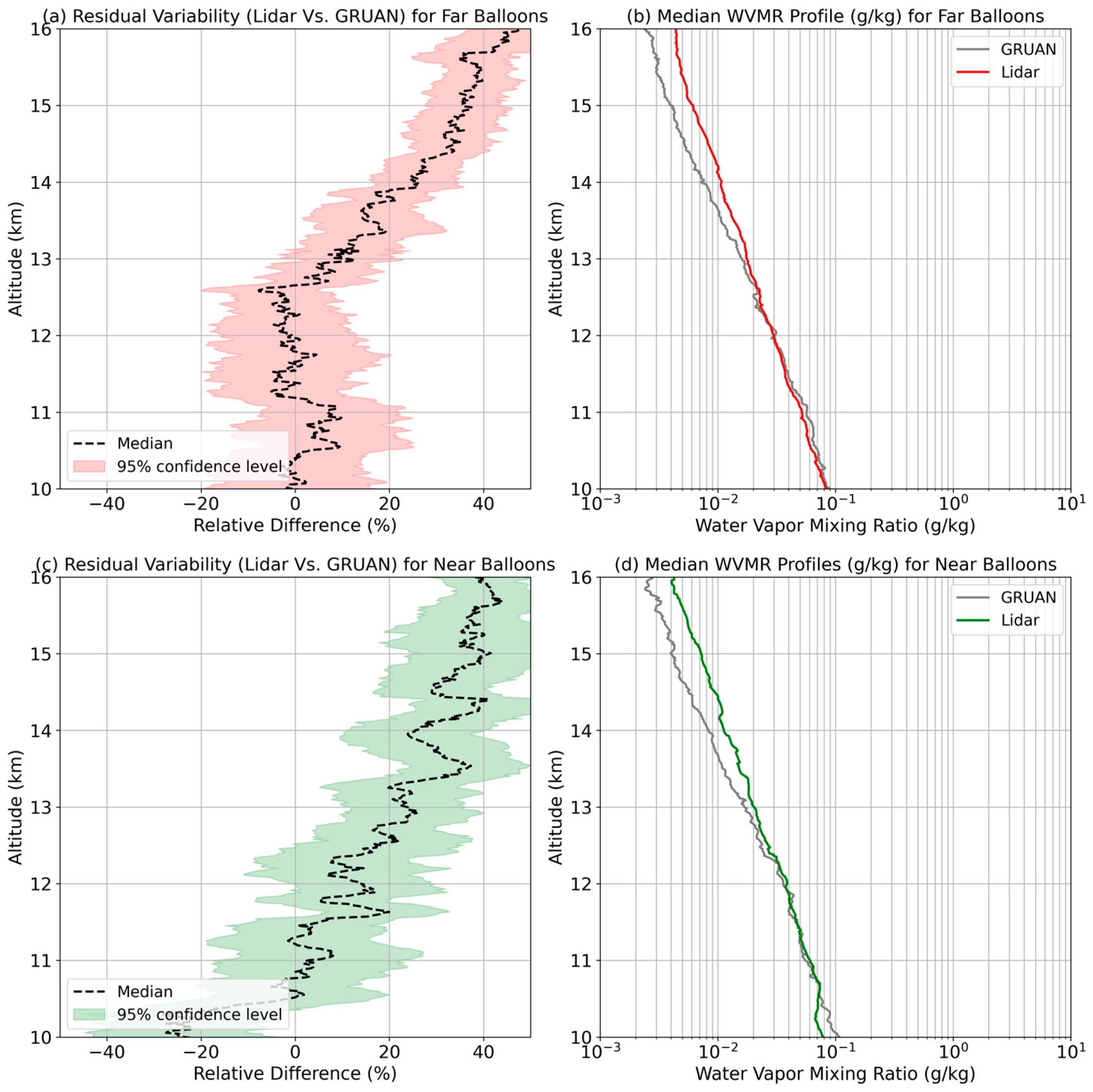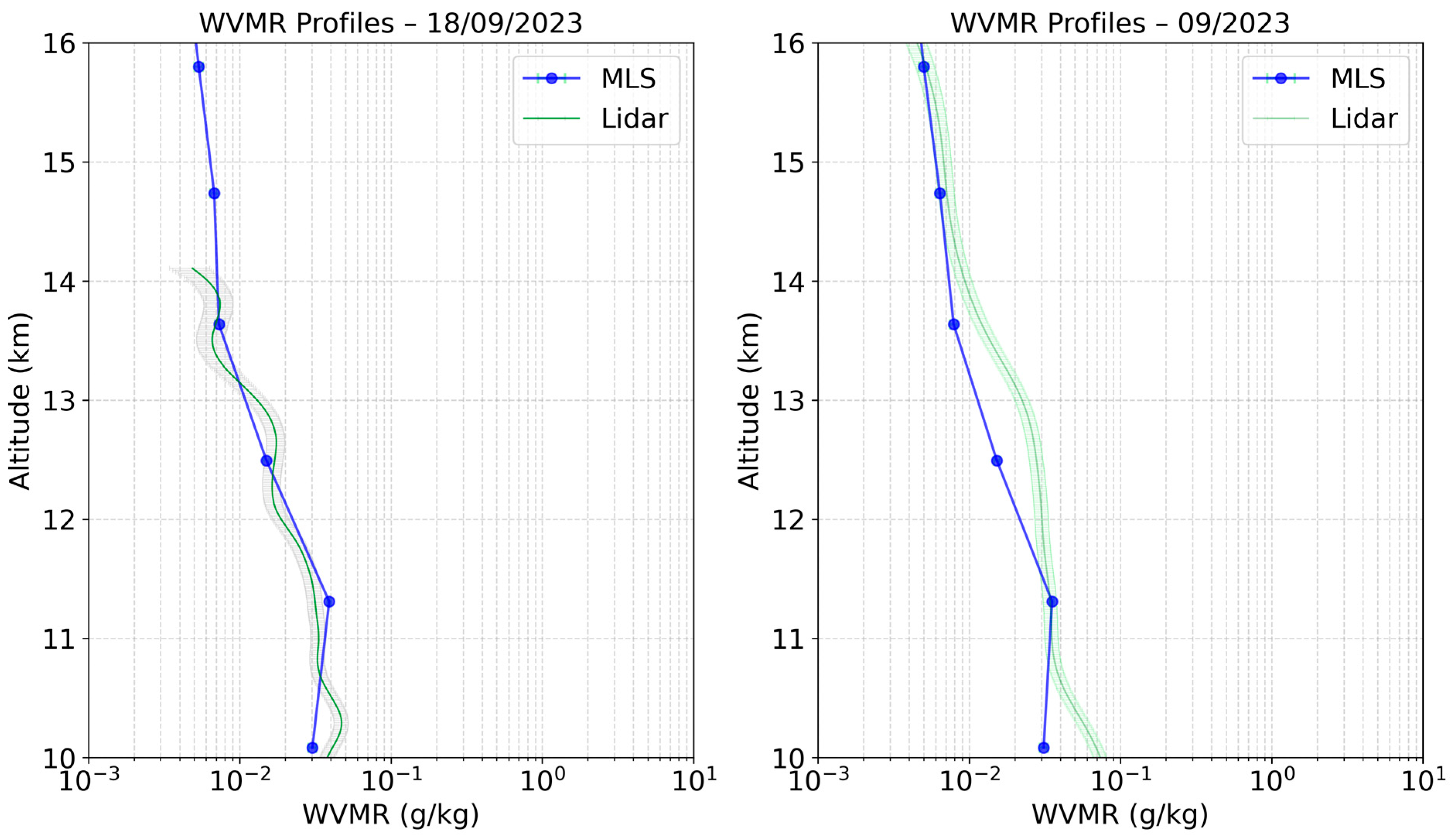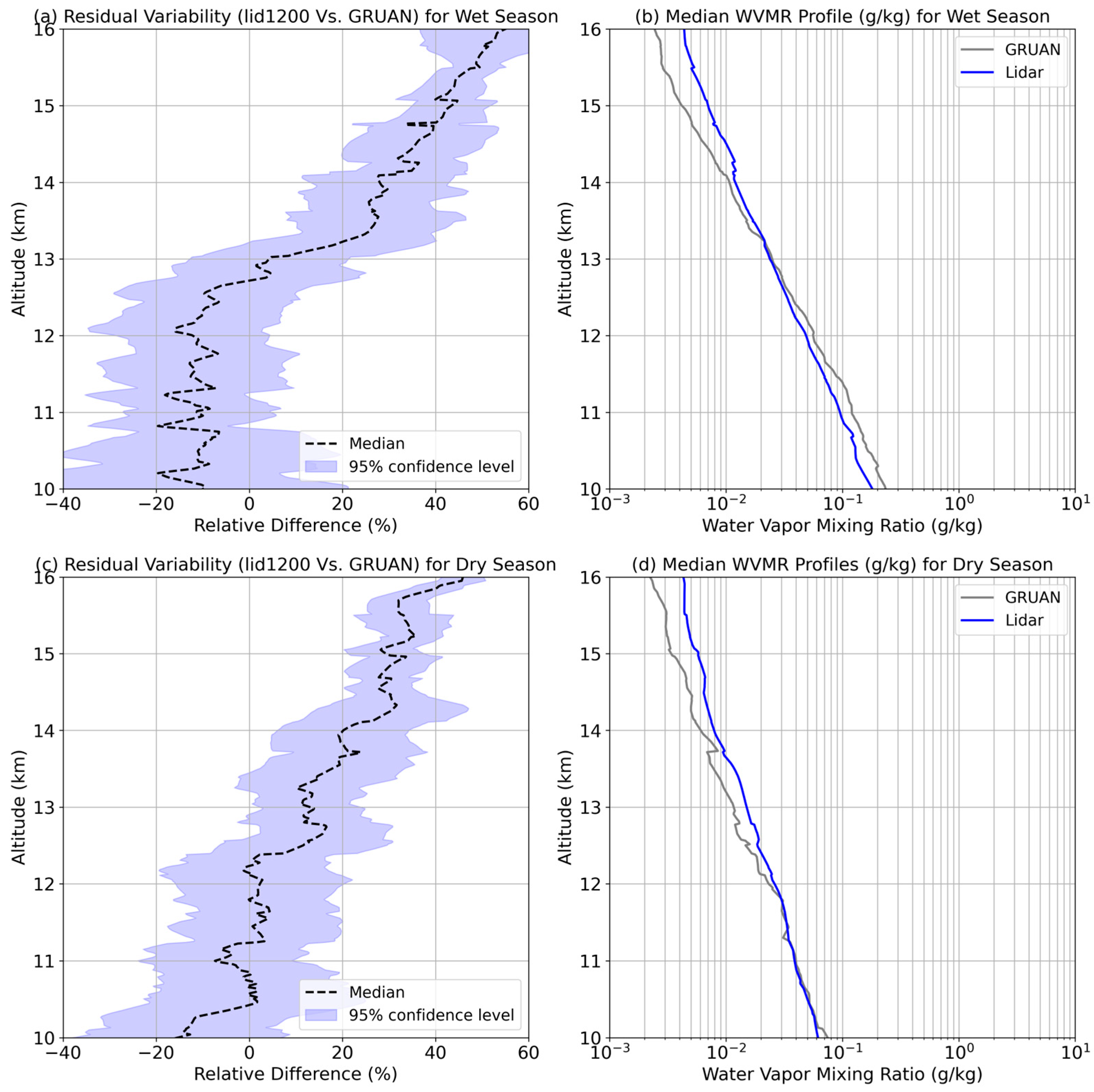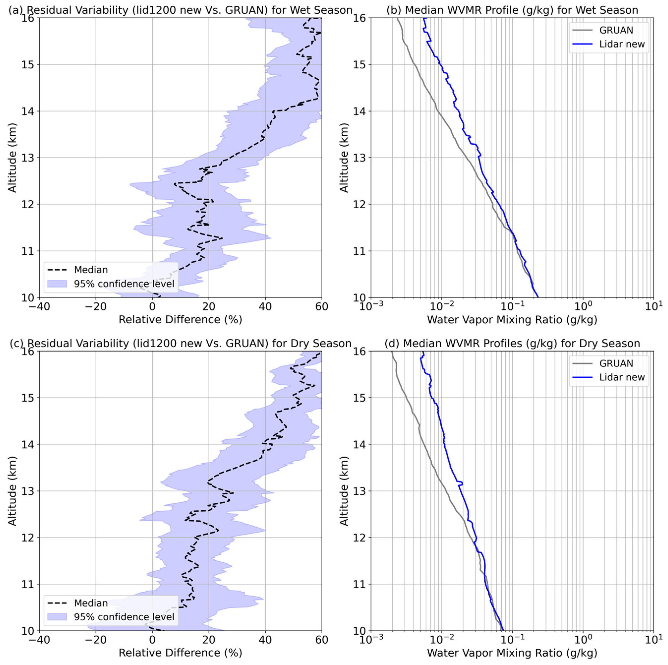 - MLS: A pronounced dry shift relative to lidar is observed, reaching up to 30% in the upper troposphere, particularly above 12 km and during the wet season. This dry bias aligns with previous studies [26,41], which also reported significant underestimation of upper-tropospheric WVMR by MLS compared to lidar.