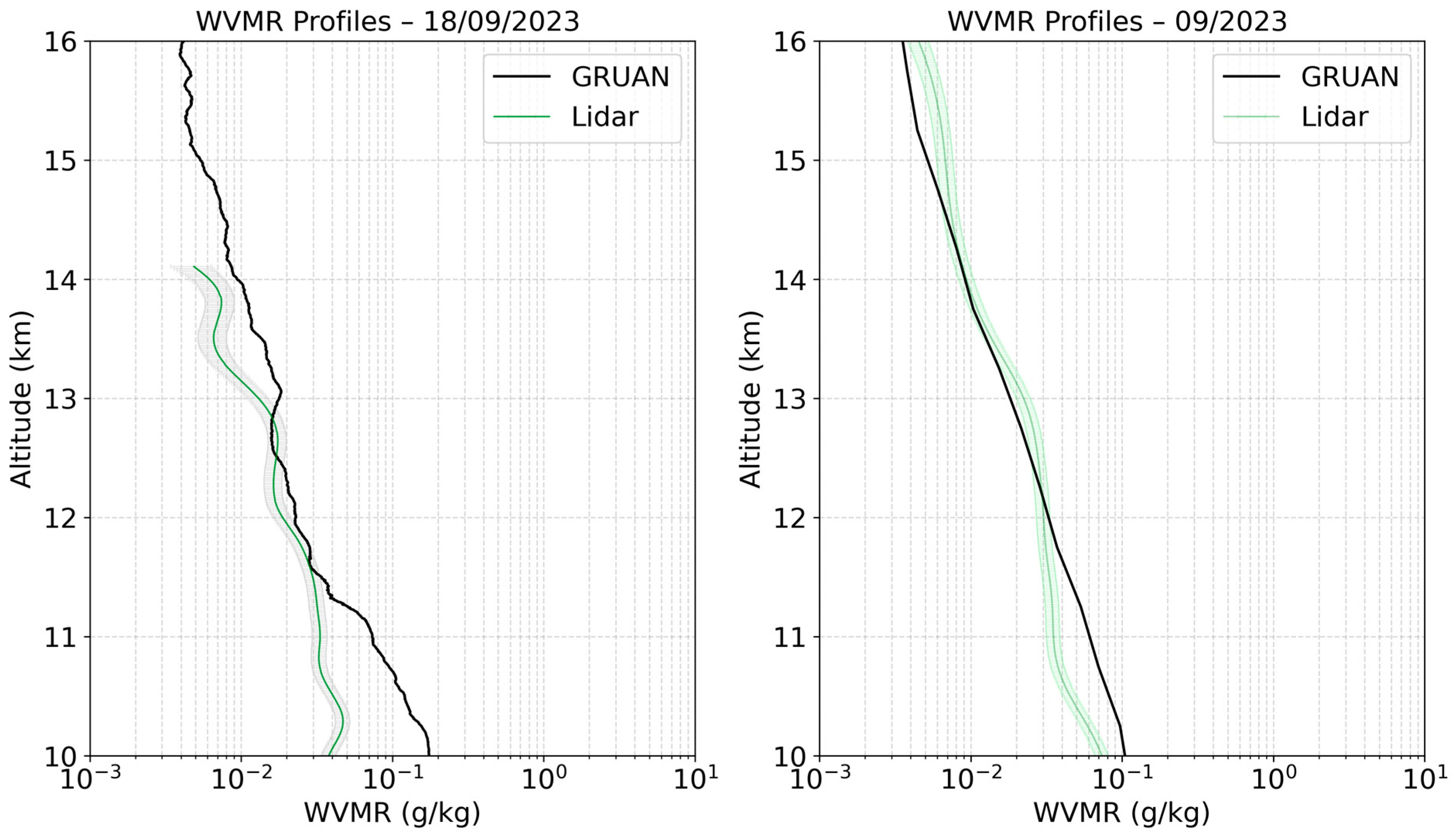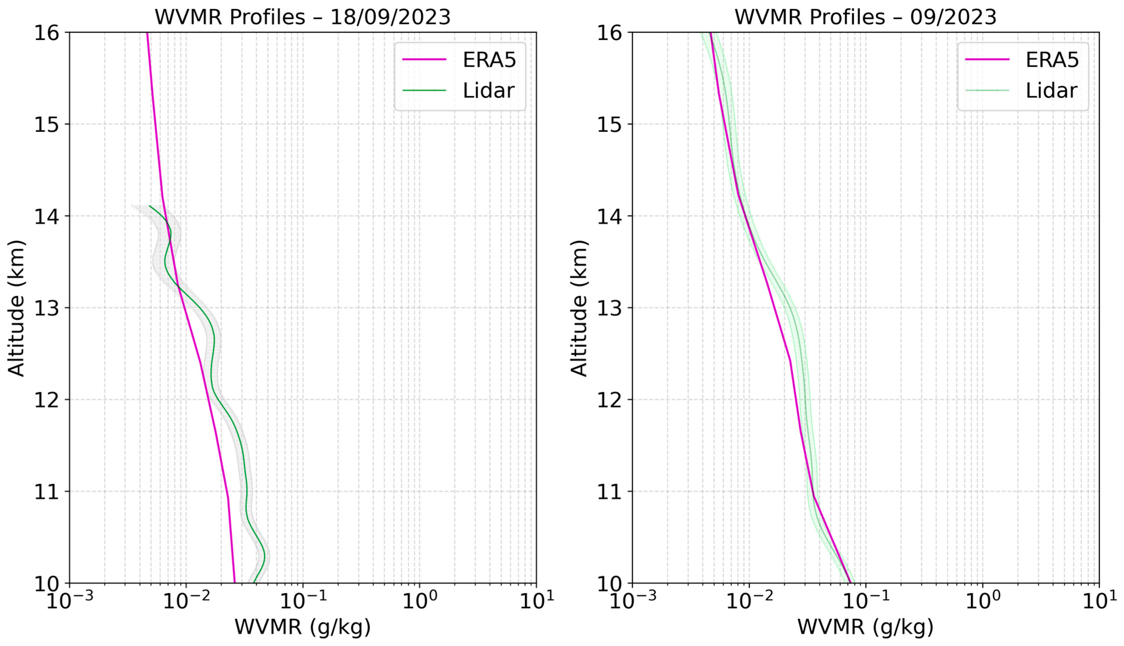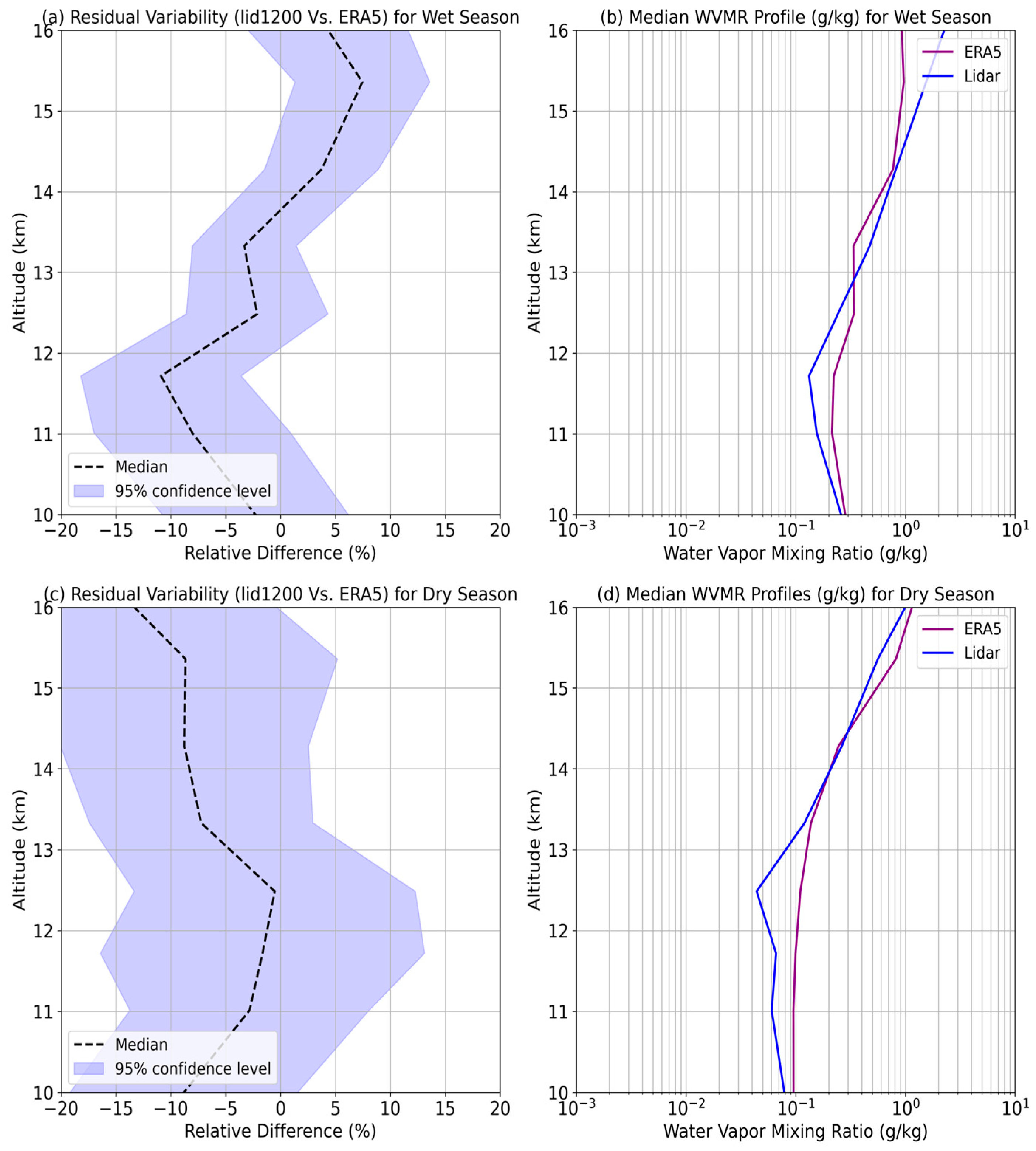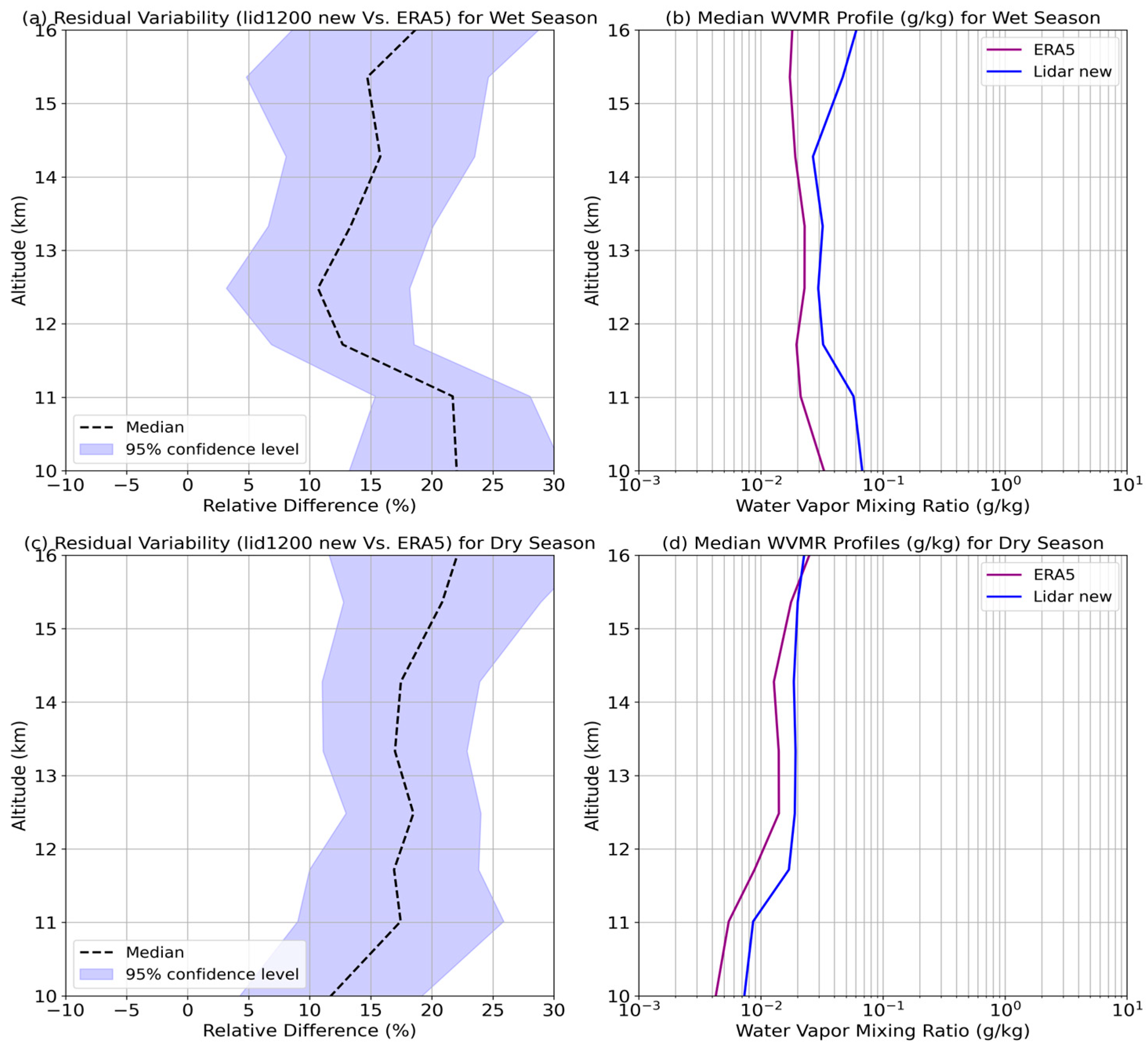 - ERA5: ERA5 shows better overall agreement with lidar. However, the operational Li1200 dataset [30] exhibits a small dry shift relative to ERA5, generally below 5% and up to 10% during the dry season. When using the newly calibrated Li1200 new dataset [47], ERA5 demonstrates a clear dry shift of up to 20% in the upper troposphere, particularly above 14 km. Similar dry biases in ERA5 have been previously reported over midlatitude regions [46,48,49].