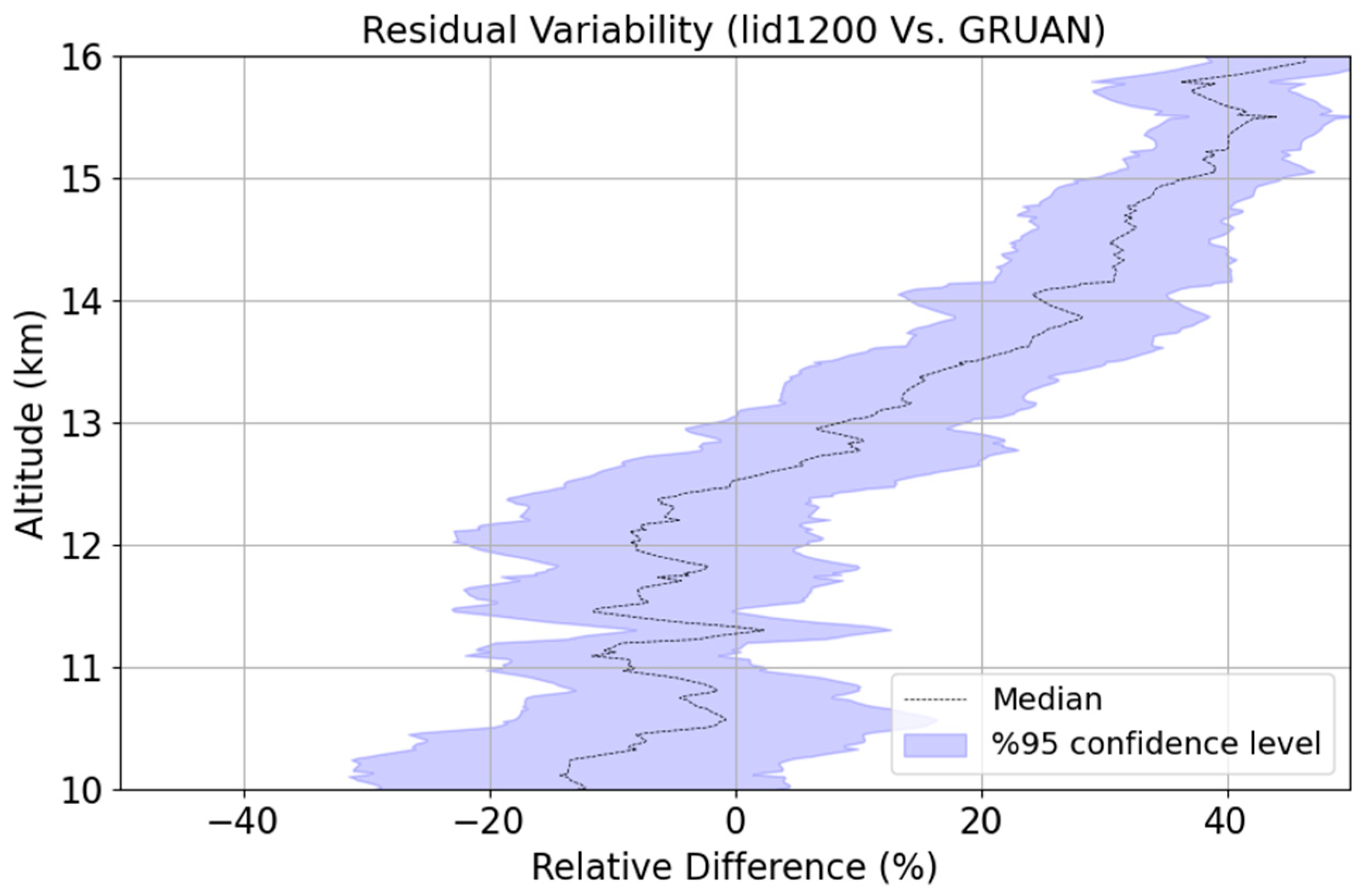 - GRUAN-processed M10 radiosondes: GRUAN-processed M10 radiosondes exhibit a pronounced dry shift relative to Li1200, particularly above 13 km. This shift does not appear to be affected by potential mismatches due to radiosonde drift, which can reach up to 100 km from the launch site. Below 13 km, lidar measurements are slightly drier, by 5–10%. This bias may be partially caused by the GNSS-based calibration, as GNSS-derived IWV measurements over Reunion Island have been previously reported to be drier than radiosonde measurements [51]. This hypothesis could further explain why no dry shift in lidar relative to GRUAN-processed M10 radiosondes is observed when comparing the Li1200 new dataset, which is calibrated using a different method.