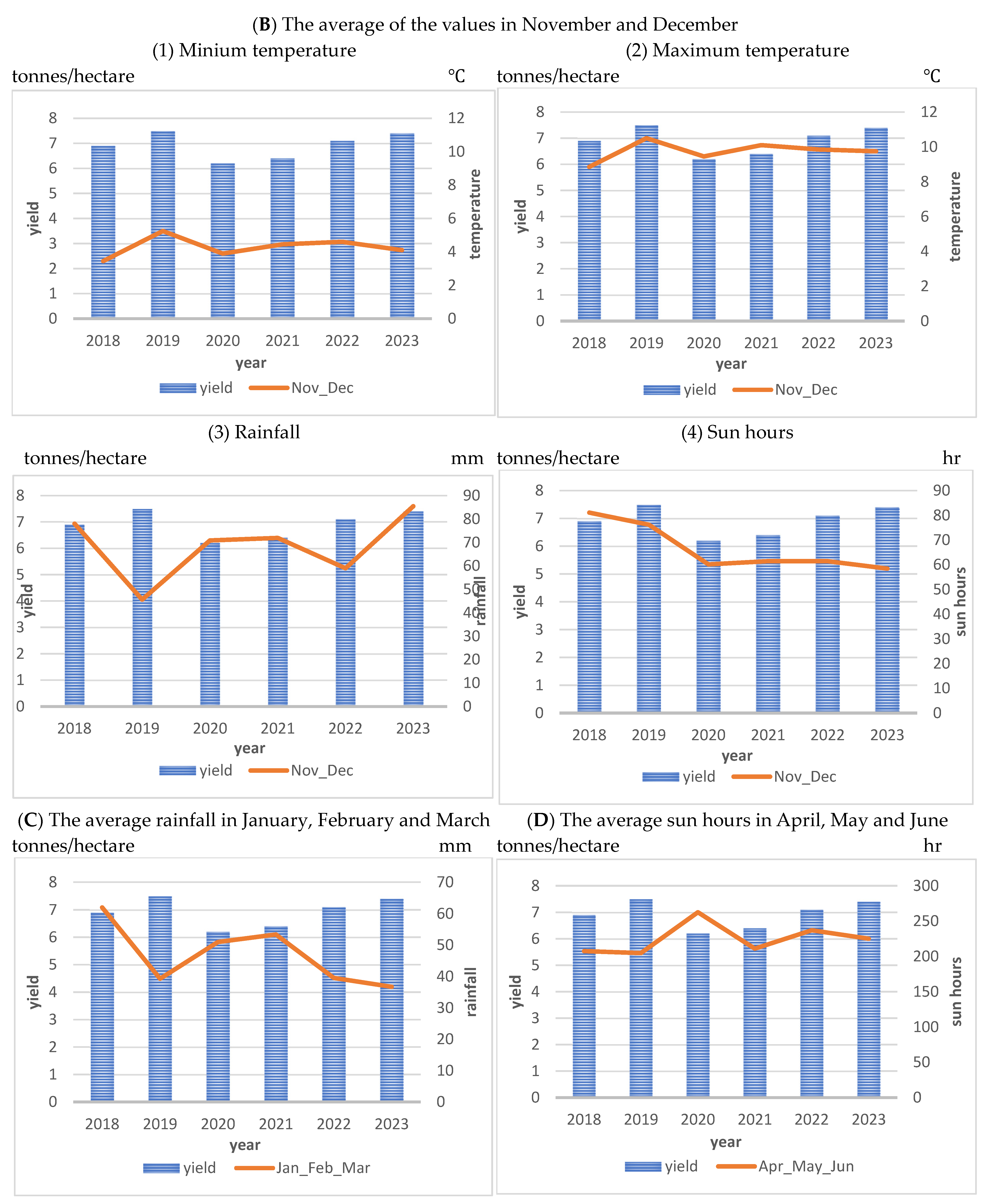 - Temperature and sun hours have significant impacts during the germination and seedling growth stages (November and December), with higher temperatures and sun hours improving germination and seedling growth and eventual yield of winter barley.