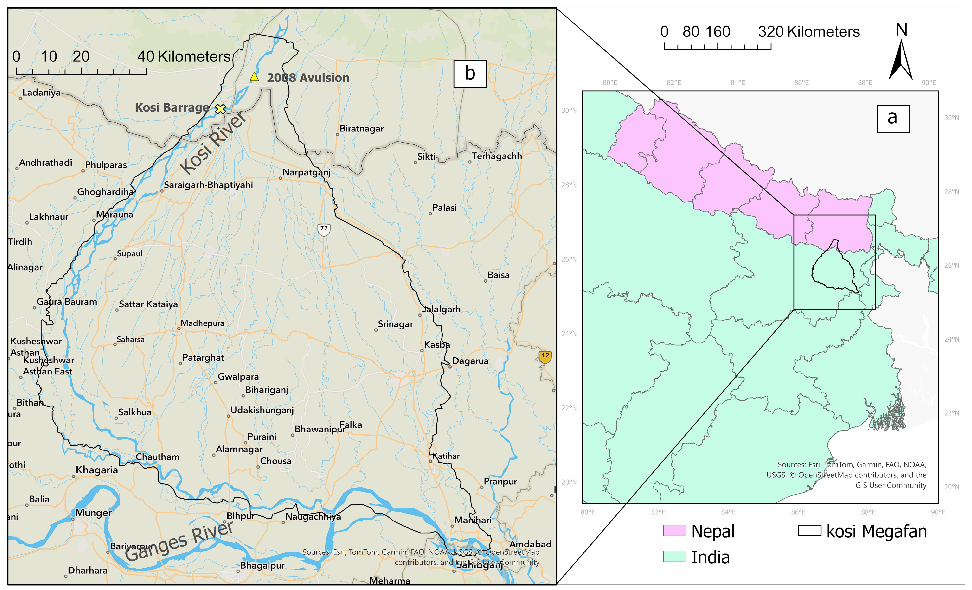 - Chakraborty, T.; Kar, R.; Ghosh, P.; Basu, S. Kosi megafan: Historical records, geomorphology and the recent avulsion of the Kosi River. Quat. Int. 2010, 227, 143–160. [Google Scholar] [CrossRef]