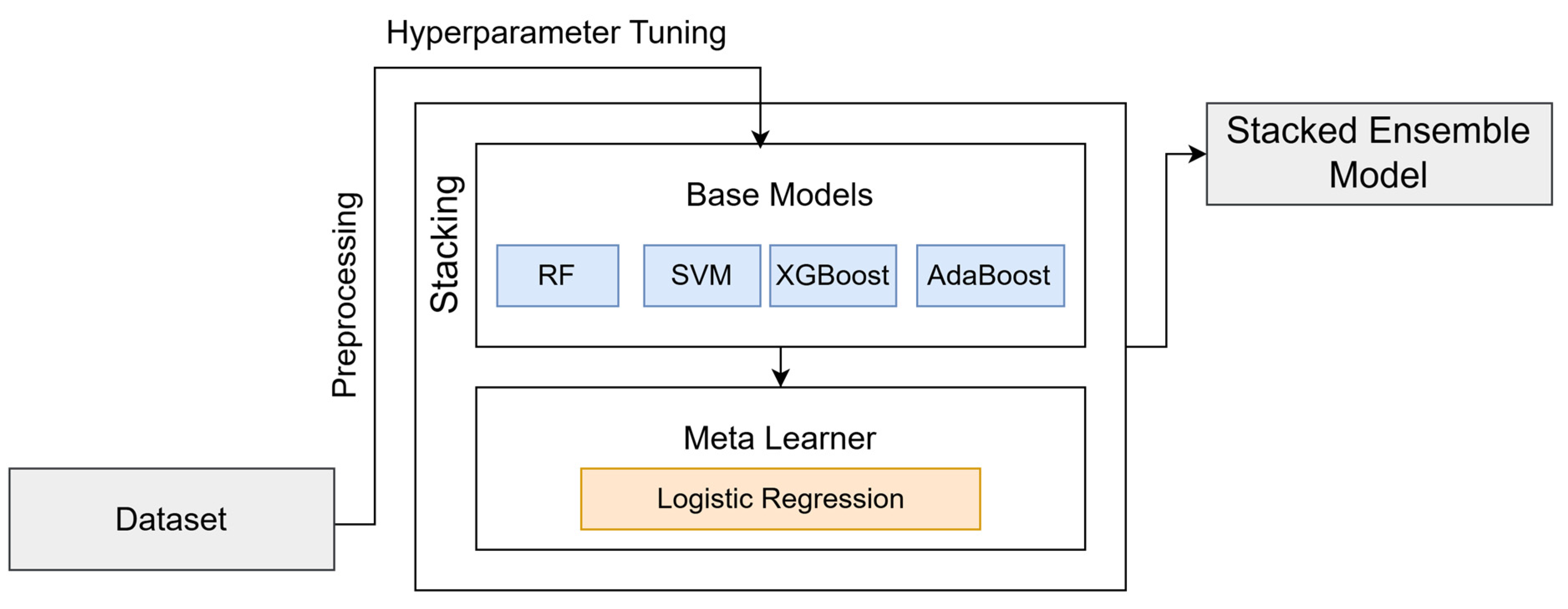 | Stacked Ensemble | Base learners: RF, SVM, XGBoost, AdaBoost; Meta-learner: logistic regression; uses predict_proba outputs in logistic-style stacking |