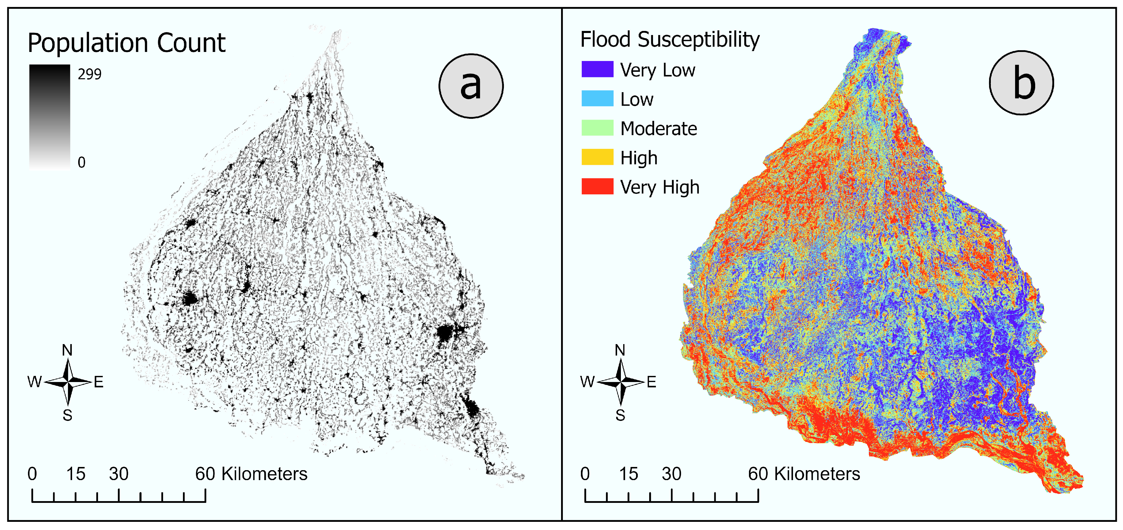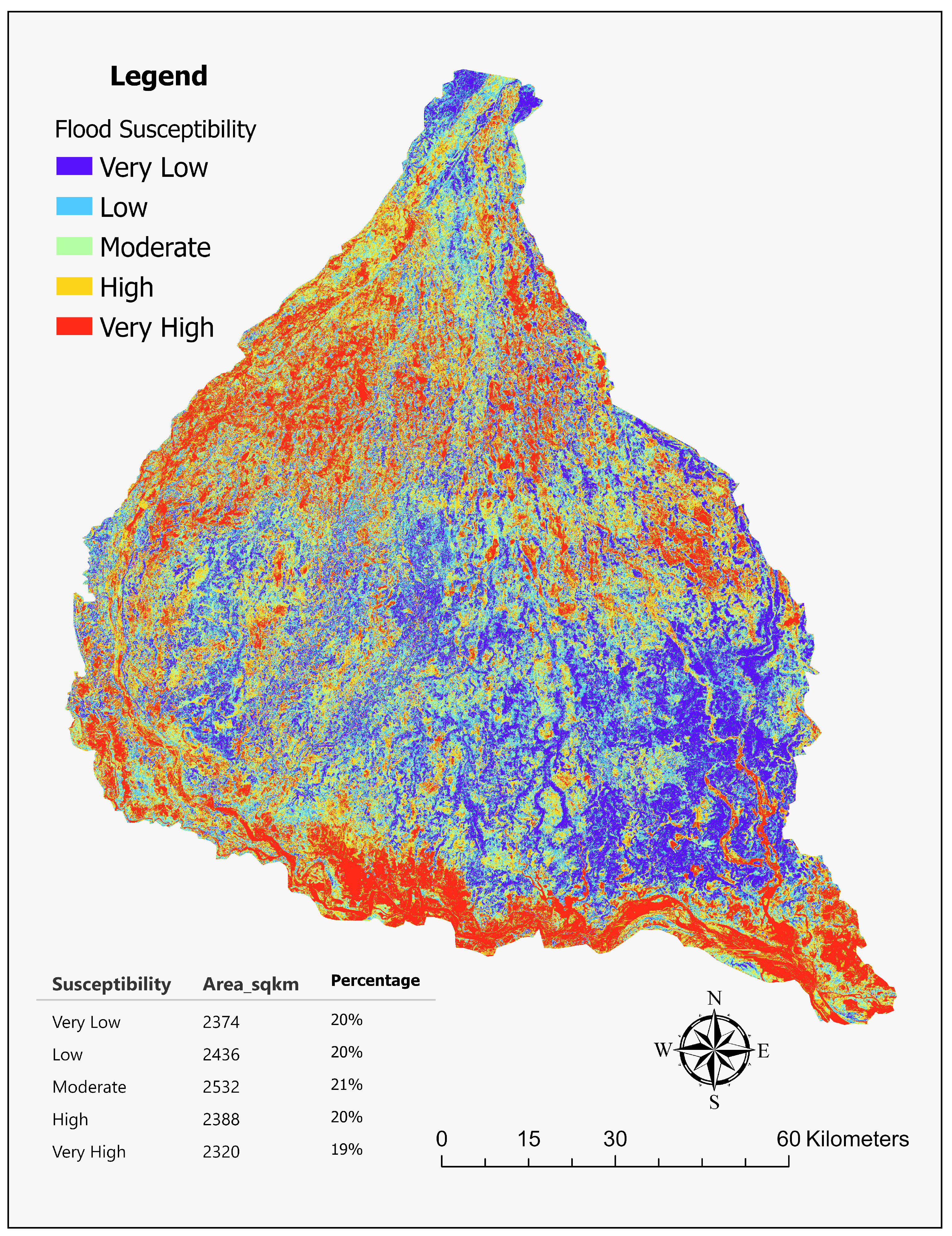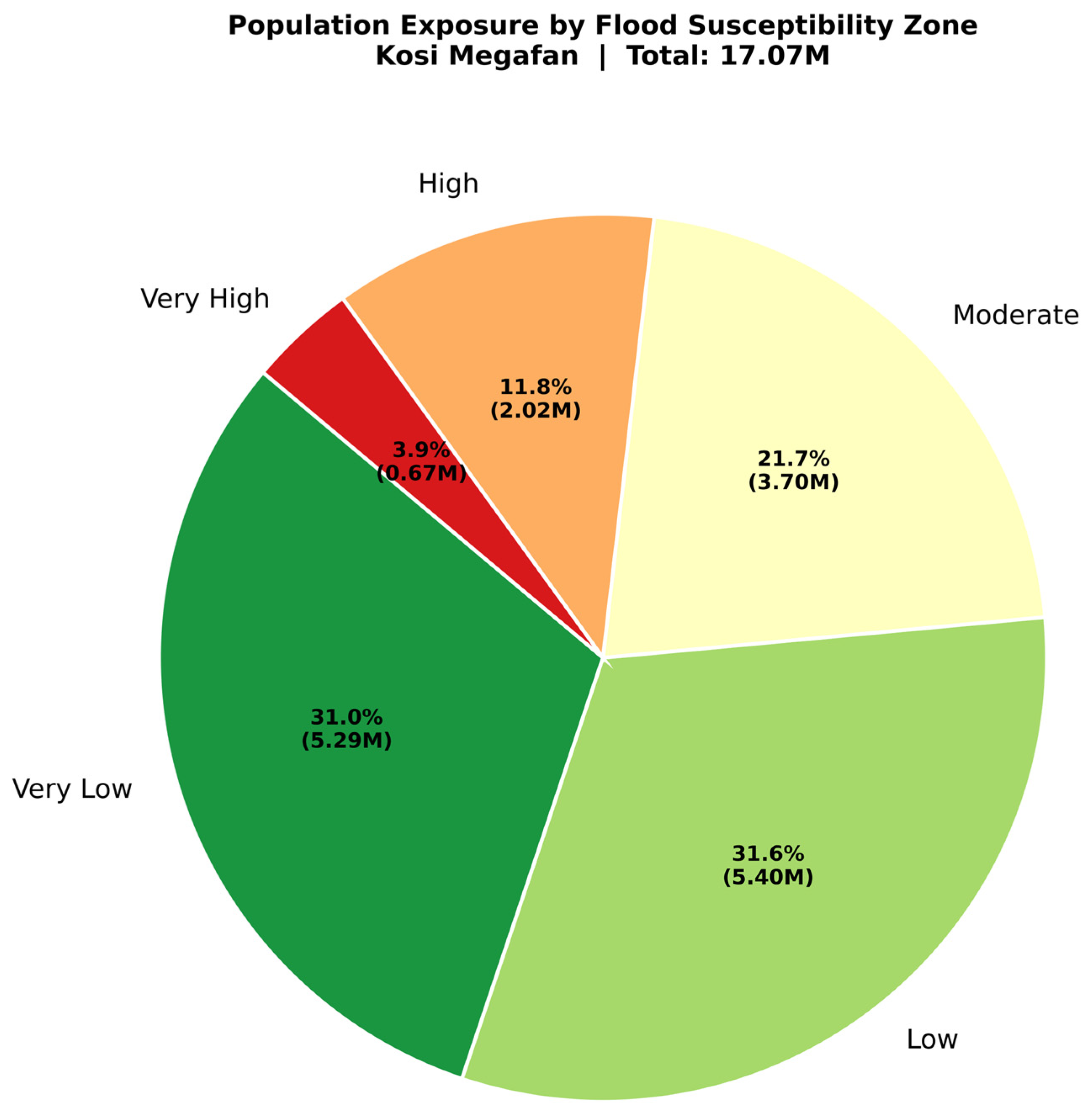 - Nearly 2.69 million people reside in high to very high susceptibility zones, emphasizing the need for better flood planning, risk reduction strategies, and community-based early warning systems in the Kosi Basin.