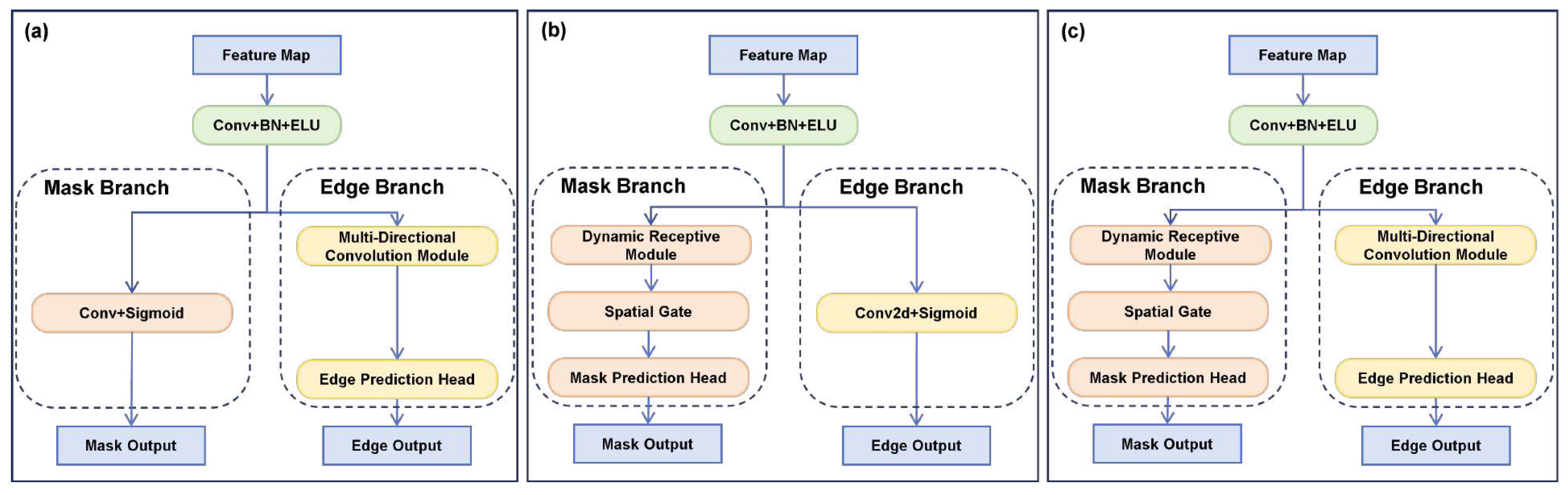 We first evaluated each branch of the dual-task decoder independently. Two ablated models were built: an edge-only branch (using baseline mask prediction,