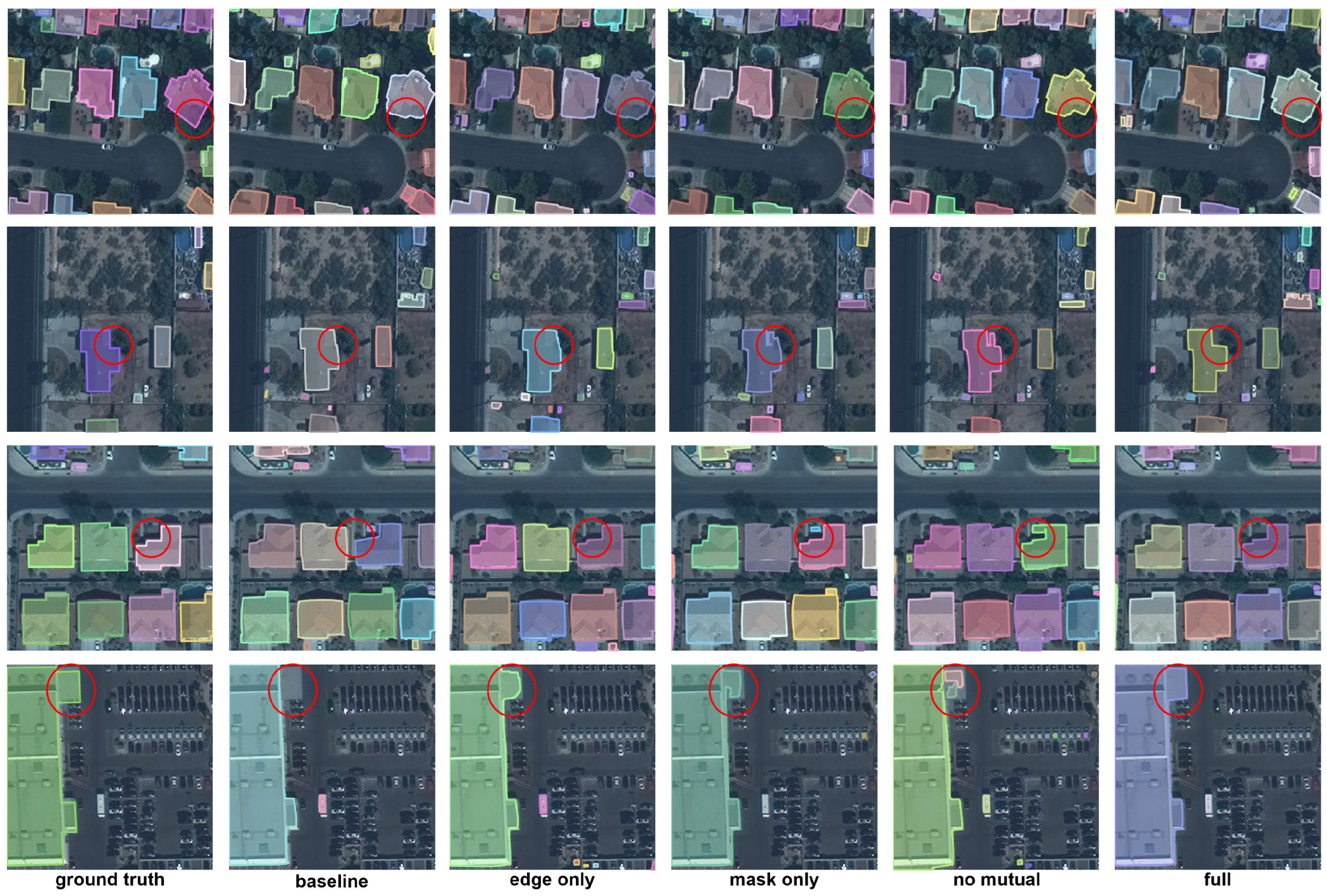 Figure 5 presents visual comparisons of different model variants across typical regions, with each row showing a scene and each column corresponding to a model configuration. Visually, the baseline model trained without any of the proposed modules exhibits contour blurring, edge discontinuities, and missed detections in complex or densely arranged buildings. Introducing an improved single branch helps enhance geometric consistency and sharpen edge details; for instance, in the first row, the “Only-Edge” model shows better contour closure than the dual-branch variant, reflecting its strength in localized detail refinement. Nevertheless, from an overall perspective, the dual-branch structure more comprehensively captures semantic shapes and geometric boundaries, producing clearer contours and more complete segmentation, with generally more regular predicted edges compared to single-branch alternatives. When the mutual guidance module is incorporated, inter-branch coordination is further strengthened, resulting in continuous boundaries, higher contour closure, and more regular shapes across most highlighted areas. This demonstrates stronger generalization, particularly in complex clusters or heavily occluded regions.