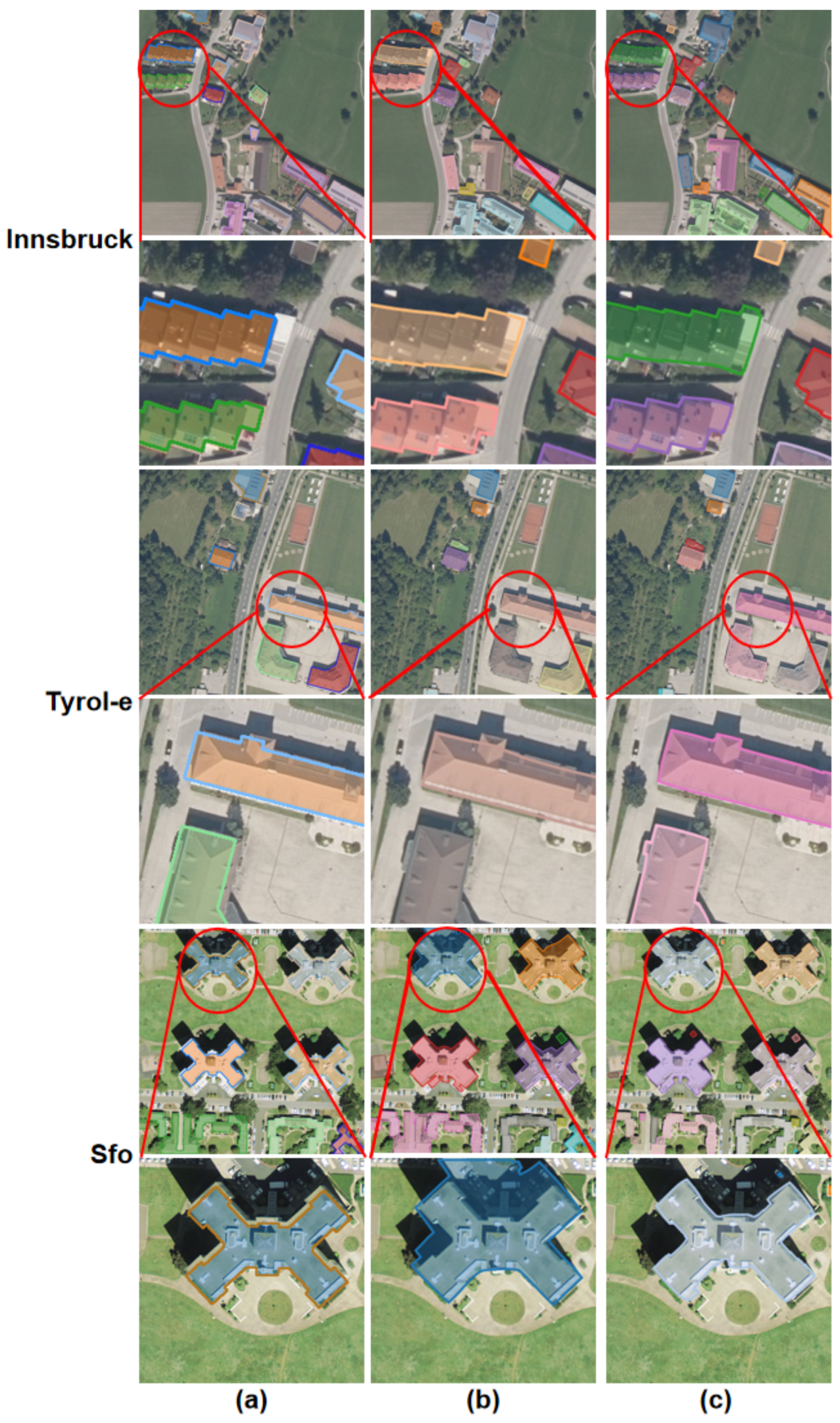 44] fused Digital Surface Models (DSMs) and RGB imagery, performing post-processing by comparing segmentation maps obtained from a U-Net with frame fields to derive regularized building polygons, which resulted in high-precision outputs. Xu et al. [