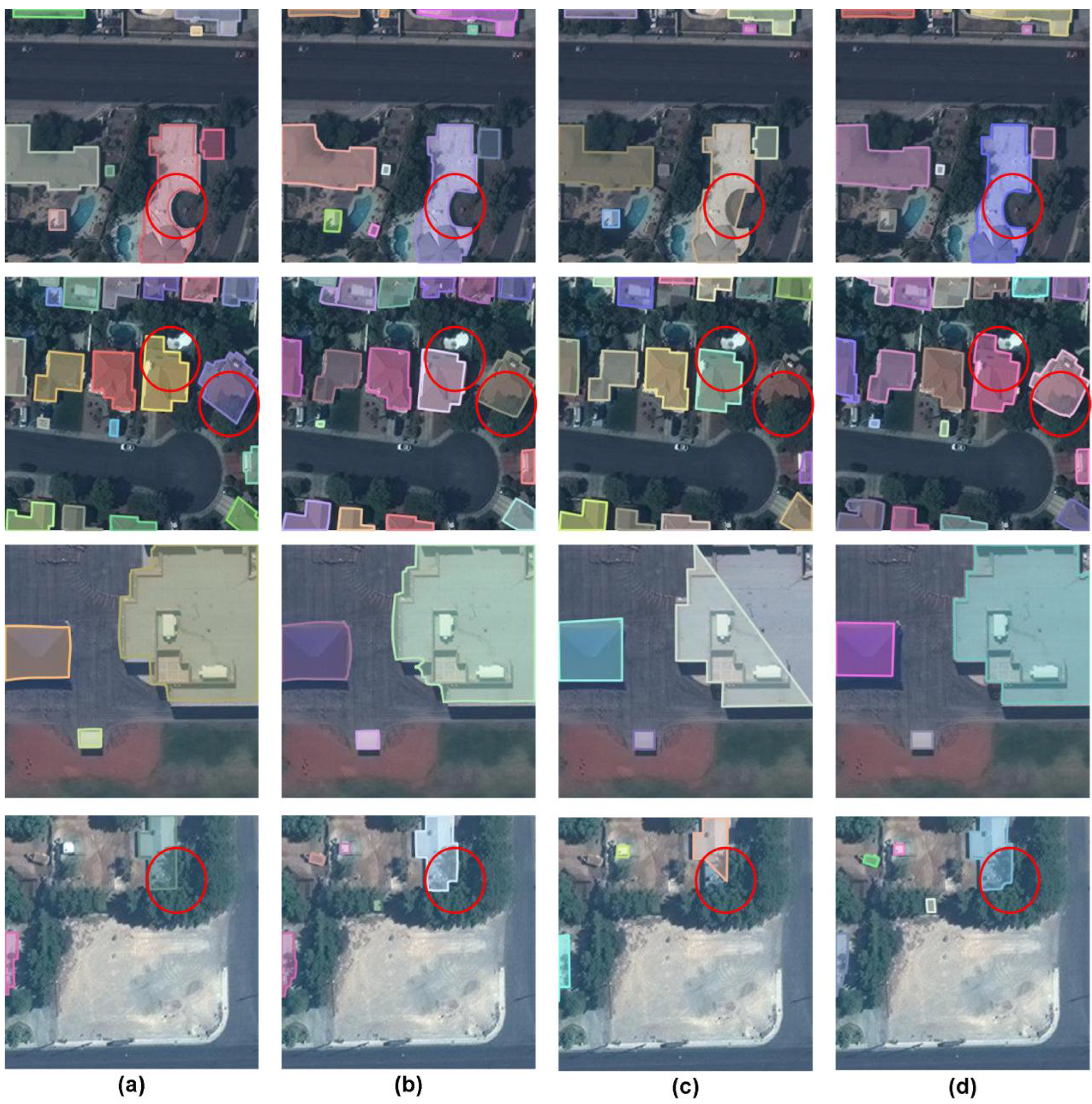 Figure 7 intuitively demonstrates the visual effect of our method’s building polygon extraction in different scenarios, further confirming the quantitative analysis results. For irregular or complex buildings, original FrameField and PolyWorld often show overly smooth or distorted boundaries (red circles). EA-DBFFN precisely captures these fine geometric features, yielding polygon boundaries that better align with ground-truth contours and sharper edges, consistent with our lower MTA and higher