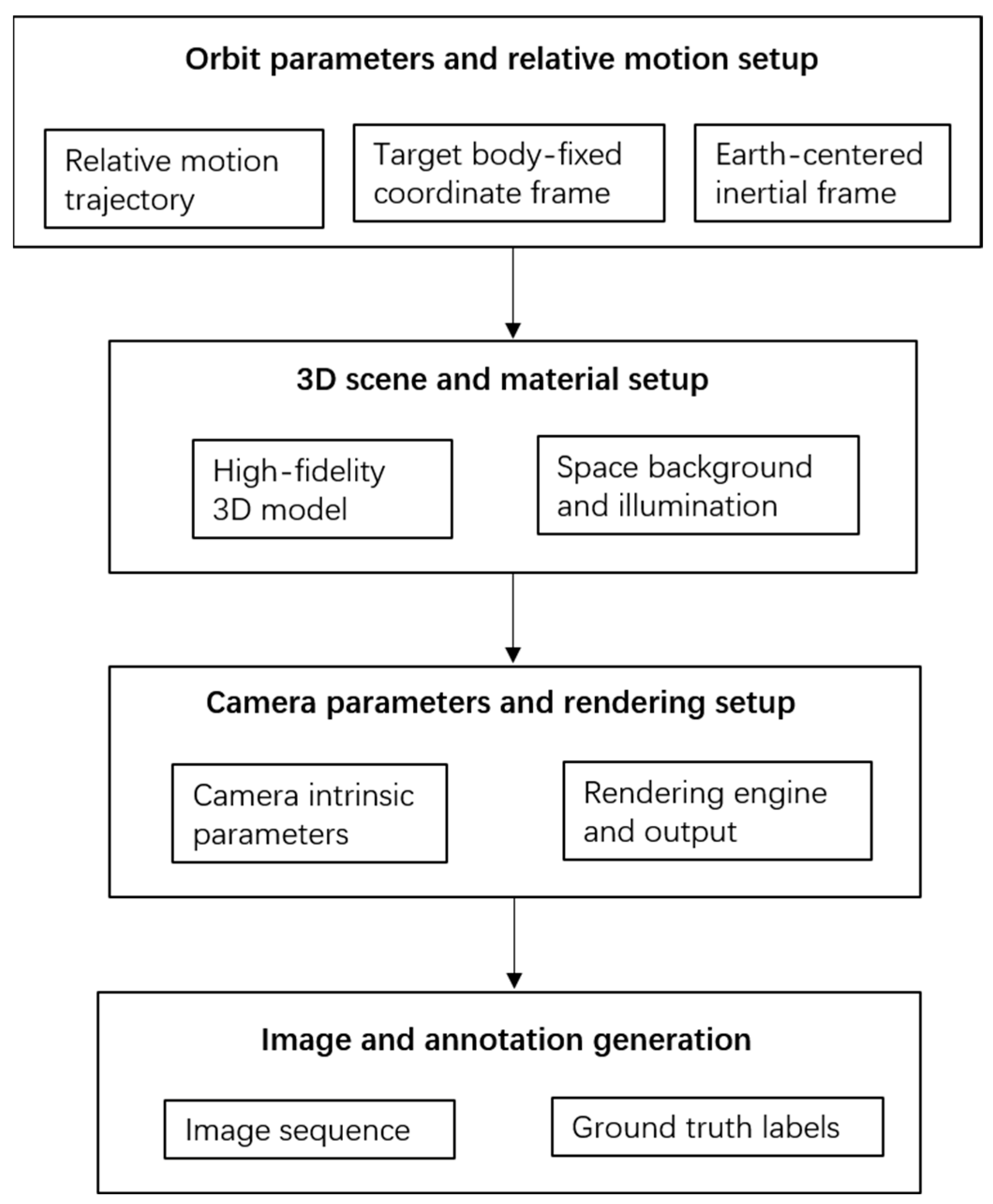 - Relative motion modeling with orbital constraints: Orbital dynamics equations are integrated into the data generation pipeline to construct physically plausible relative motion trajectories, ensuring the kinematic realism of simulated scenarios.