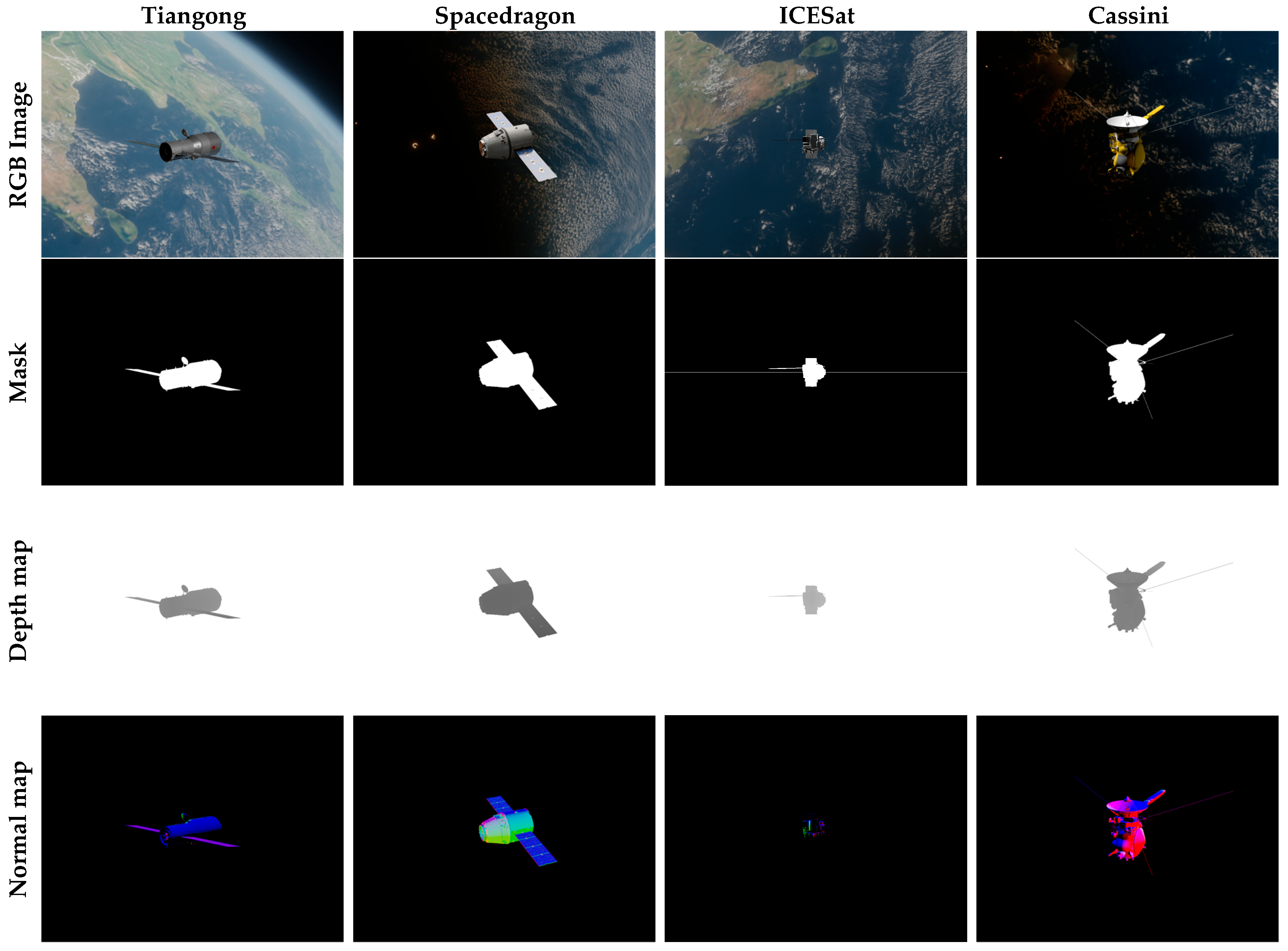 - Multi-source spacecraft ground truth data generation: RGB images, instance segmentation masks, depth maps, and surface normal maps are rendered synchronously, accompanied by precise 6-DoF pose ground truth, establishing a benchmark for related algorithm research.