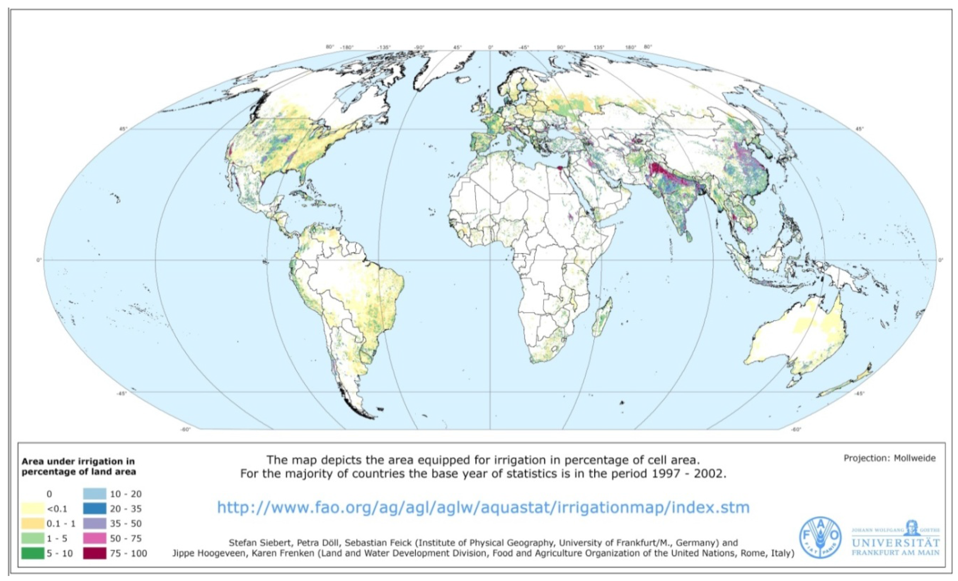 Both of these are crucial for water use assessments and practical applications of the data including food security planning. In addition to cropland maps and statistics, there are two premier global irrigated area maps and statistics. These are:
