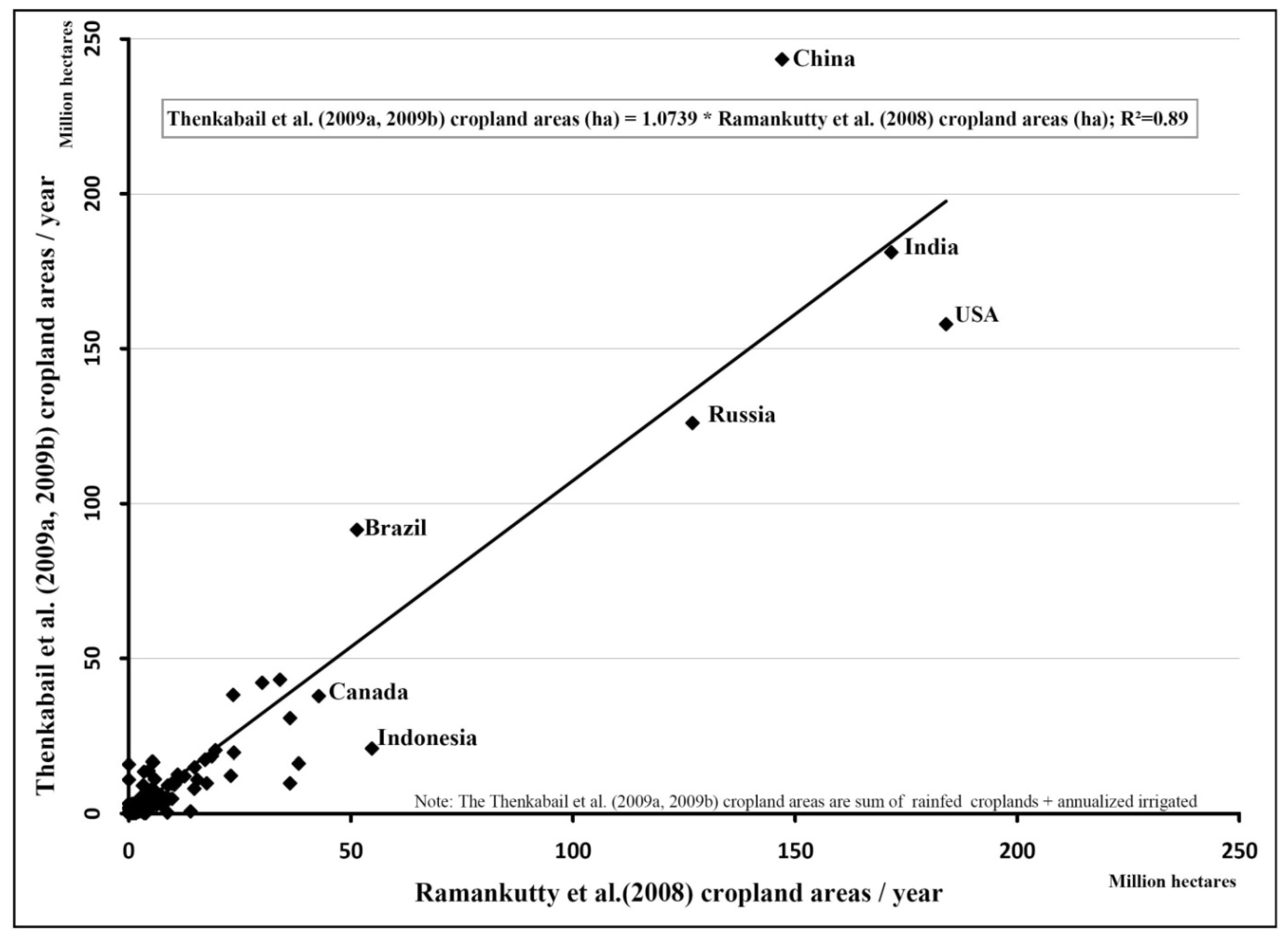 Cropland areas per year (annualized) compared for 197 countries [1,2, versus 40]. Cropland areas include irrigated and rainfed crops as well as permanent crops. Ramankutty et al. [40] used national agricultural statistics fused with remote sensing data whereas Thenkabail et al. [1,2] used advanced remote sensing approaches. There is remarkably high correlation (R2 value of 0.89) for the 1:1 line for comparison, at countries scale, of cropland areas between the two approaches. However, large differences in areas for some countries are clear. Reasons for the differences are discussed in the paper.