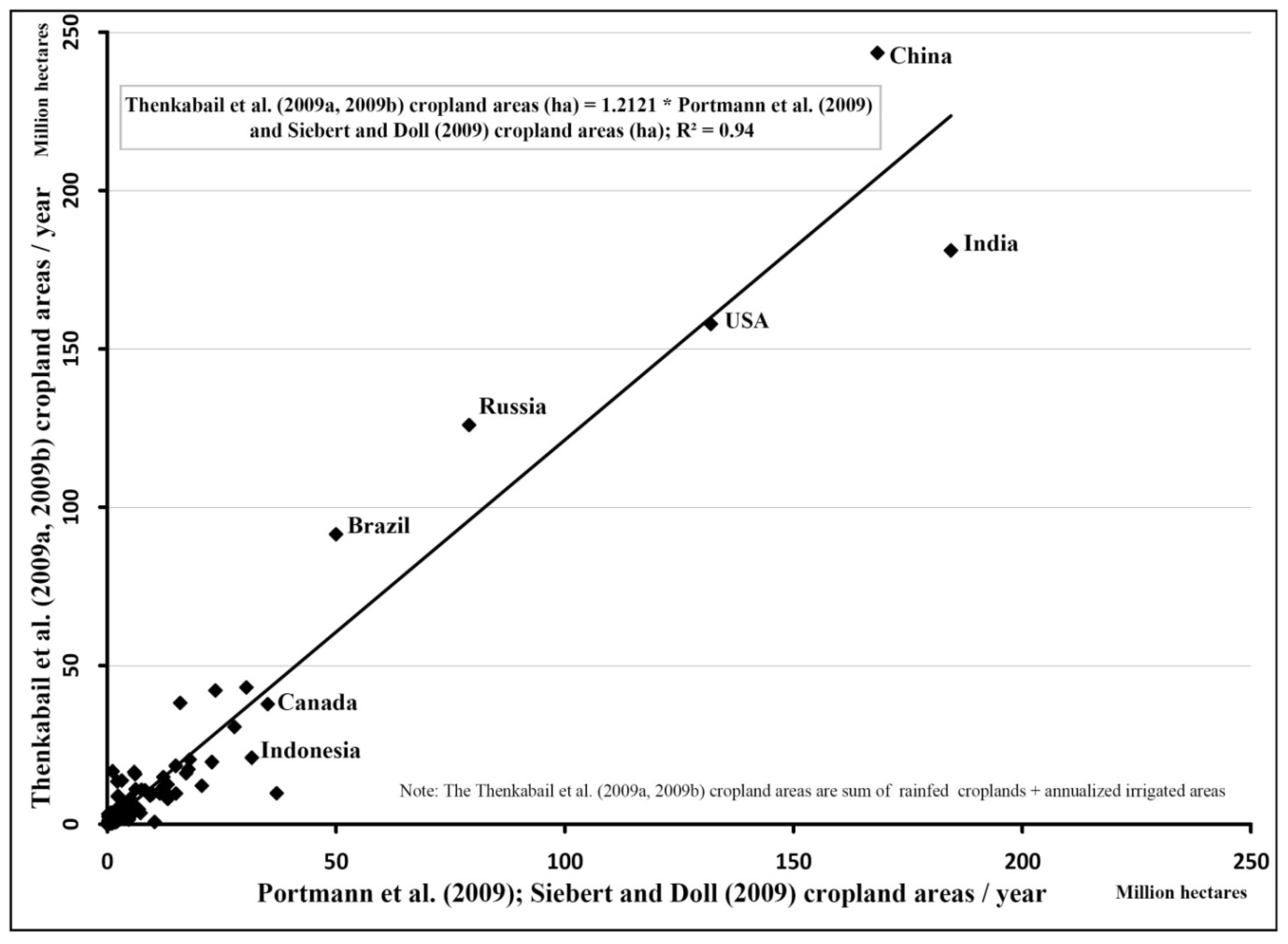 Cropland areas per year (annualized) for 197 countries [1,2, versus 41,49]. Cropland areas include irrigated plus rainfed crops per year as well as permanent crops. Portmann et al. [41] and Siebert and Döll [49] use national agricultural statistics and geographic information systems (GIS) whereas Thenkabail et al. [1,2] use remote sensing approaches. There is remarkably high correlation (R2 value of 0.94) for the 1:1 line for a country-by-country comparison of cropland areas between the two approaches. However, large differences in areas for some countries are clear. Reasons for differences are discussed in the paper.