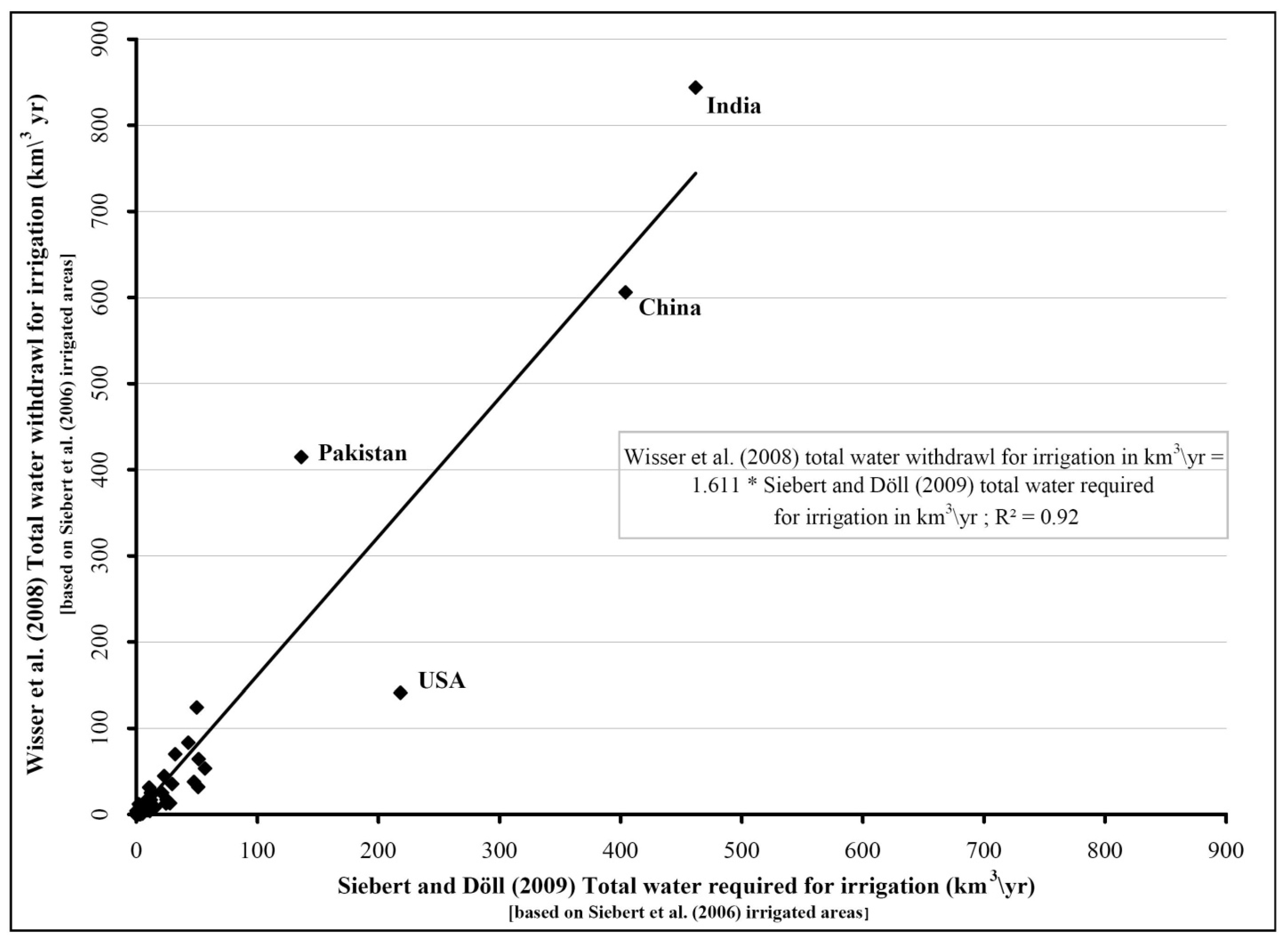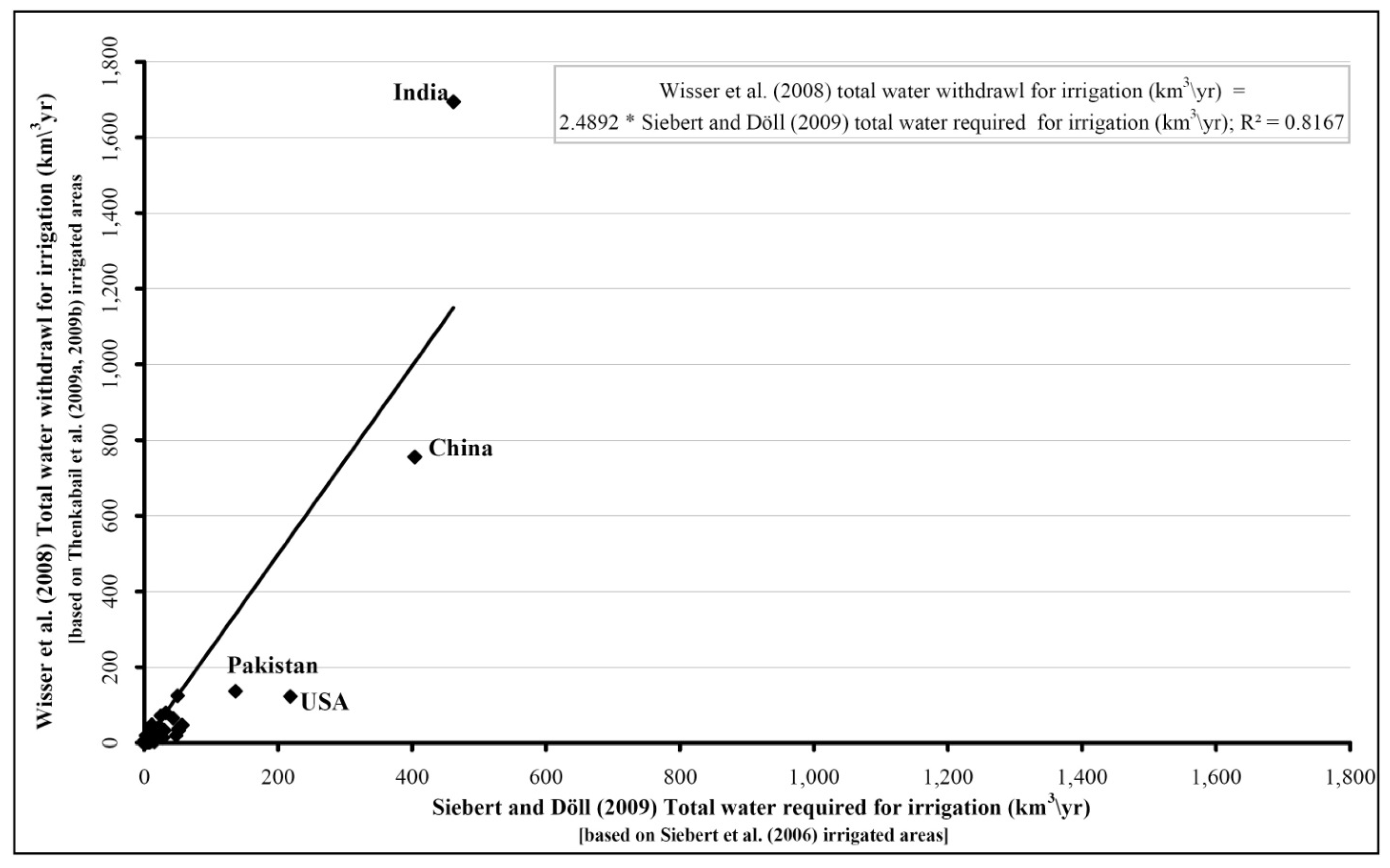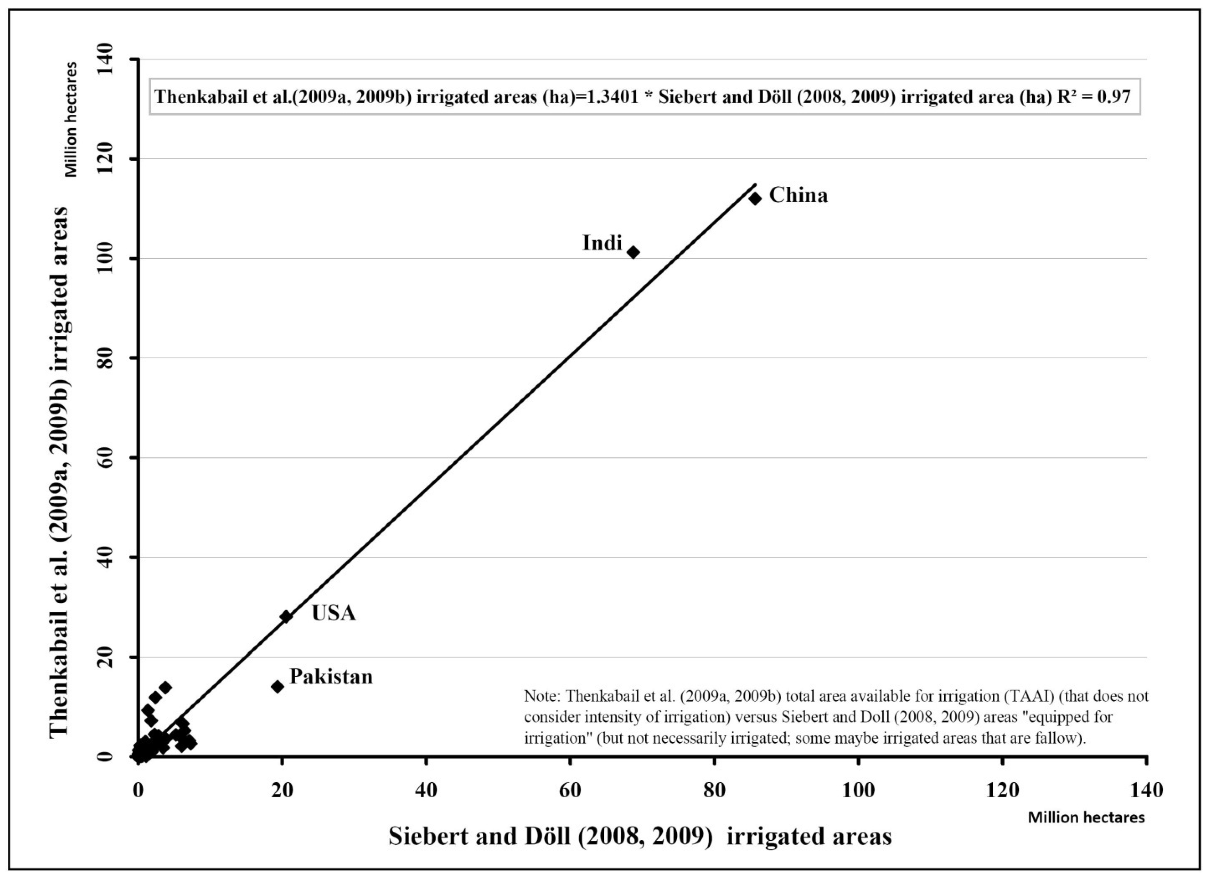 Comparison of irrigated areas. Irrigated areas derived by Siebert and Döll [49] and national statistics provided by Ministry of Agriculture [68] based primarily on remote sensing approaches. The Thenkabail et al. [69] estimates were significantly higher than Siebert et al. [52] mainly as a result of the huge differences for India and China. Overall, there is remarkably high correlation (R2 value of 0.97) for the 1:1 line for a country-by-country comparison of irrigated cropland areas between the two approaches. However, the differences are lower than Figure 6a mainly due to revised irrigated areas reported for China and India by Siebert and Döll [49] compared to Siebert et al. [52]. Reasons for differences are discussed in the paper.