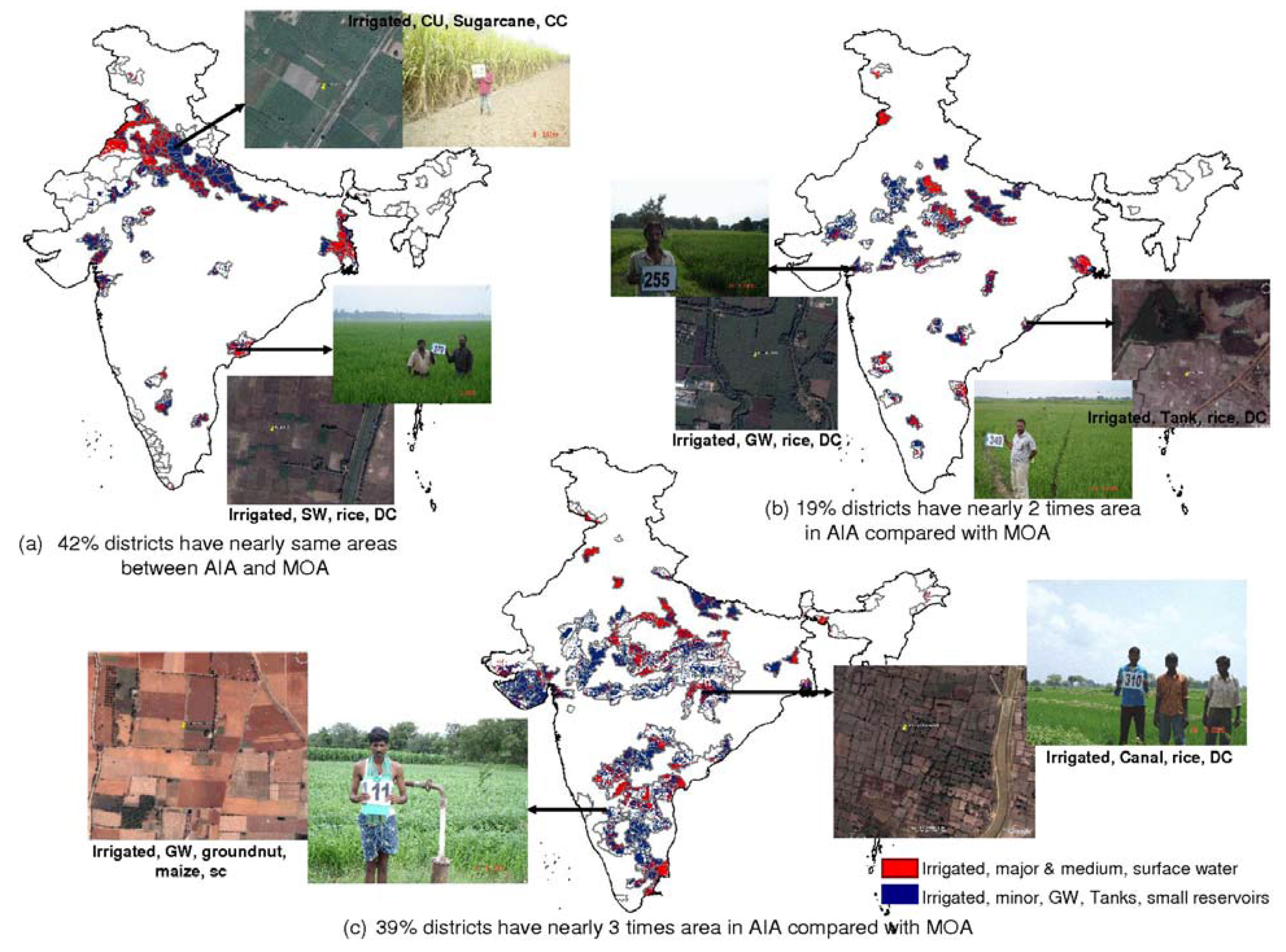 Uncertainties in irrigated areas illustrated with an example of India (Dheeravath, 2009). A district-wise spatial comparison between the remotely sensed irrigated areas derived using MODIS 500m data [69] and national statistics provided by Ministry of Agriculture [68] in India. The 42% of the districts where there was near 1:1 match in areas were mainly irrigated from large reservoirs. In the areas where minor irrigation (groundwater, small reservoirs, and tanks) dominated, remote sensing based estimates [69] were either twice or thrice than those reported by MOA. This was mainly because minor irrigation is inadequately reported in MOA census data.
