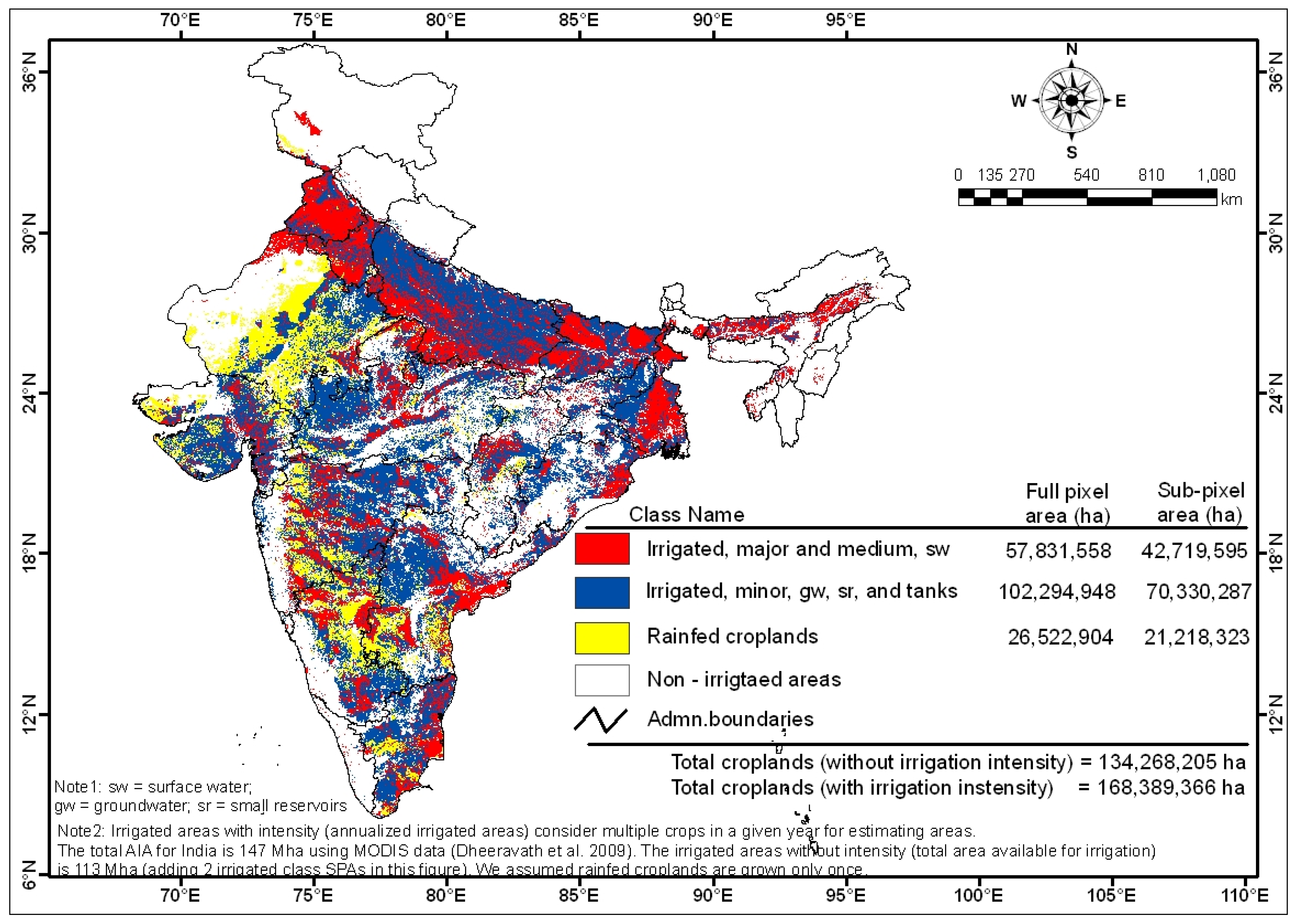 The advanced and finer irrigated and rainfed croplands products at 30 m will: (1) define more precisely the actual area and spatial distribution of irrigated and rainfed cropland areas of the world; (2) develop methods and techniques for consistent and unbiased estimates of irrigated and rainfed cropland areas over space and time for the entire world; (3) elaborate on the extent of multiple cropping over a year, particularly in Asia, where two or three crops may be grown in one year, but where cropping intensities are not accurately known or recorded in secondary statistics; and (4) account for: (a) irrigation and rainfed cropping intensity; (b) irrigation source; (c) irrigated and rainfed crop types; and (d) precise location of irrigated and rainfed cropland areas. This will be a significant advance since irrigated and rainfed cropping intensity and their crop types have a huge influence on the quantum of water consumed by crops and associated indicators of agricultural productivity, crop diversification and food security. The irrigation and rainfed source is a must to determine patterns of land and water use and environmental impacts from factors such as major versus minor irrigation, and in determining the quantum of groundwater use and its overdraft issues that are critical to the food security and wellbeing of millions around the world, particularly in India and China. These two countries are home to largest number of poor and food insecure people worldwide; they are also the countries that encounter greatest gaps in data on cropping intensity and precise location of irrigated versus rainfed croplands. Precise and finer delineation of crop types, irrigation types and cropping intensities can greatly support global food security assessment and planning.