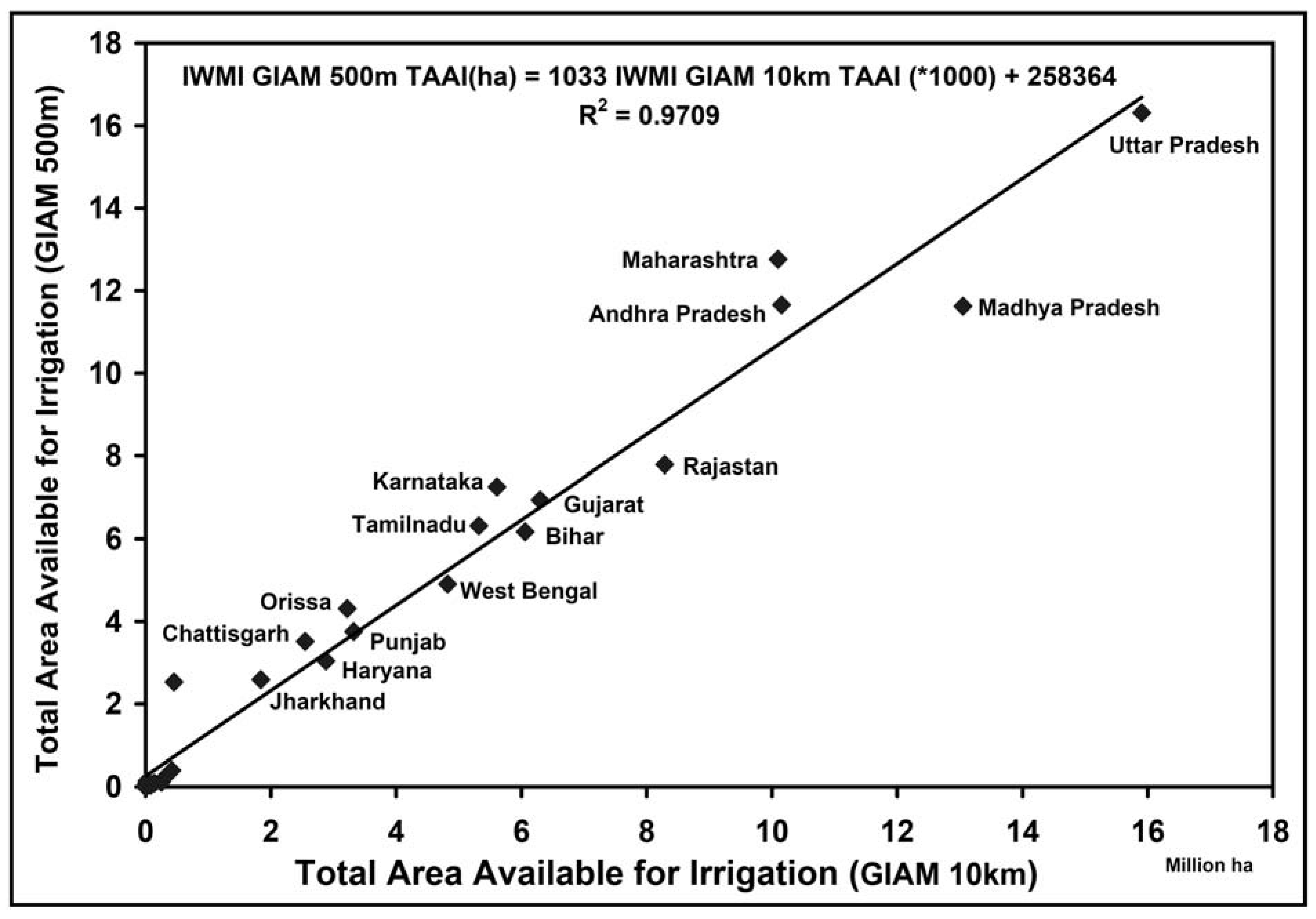 Irrigated croplands at two resolutions in India [63]. There is a remarkable correlation (R2 value of 0.97) in irrigated areas mapped at nominal 10-km [1,2] versus irrigated areas mapped at MODIS 500 m [63]. However, areas estimated by MODIS 500 m were significantly higher for a few Indian states. This resulted in higher area estimates from MODIS 500 m data compared to the 10km product. Using MODIS 500 m, the total area available for irrigation or TAAI (the intensity not considered) was 113 Mha whereas the annualized irrigated areas or AIA (the intensity considered) was 147 Mha. These figures are significantly higher than Thenkabail et al. [1,2] estimated figures at 10-km of TAAI at 101 Mha and AIA at 132 Mha.