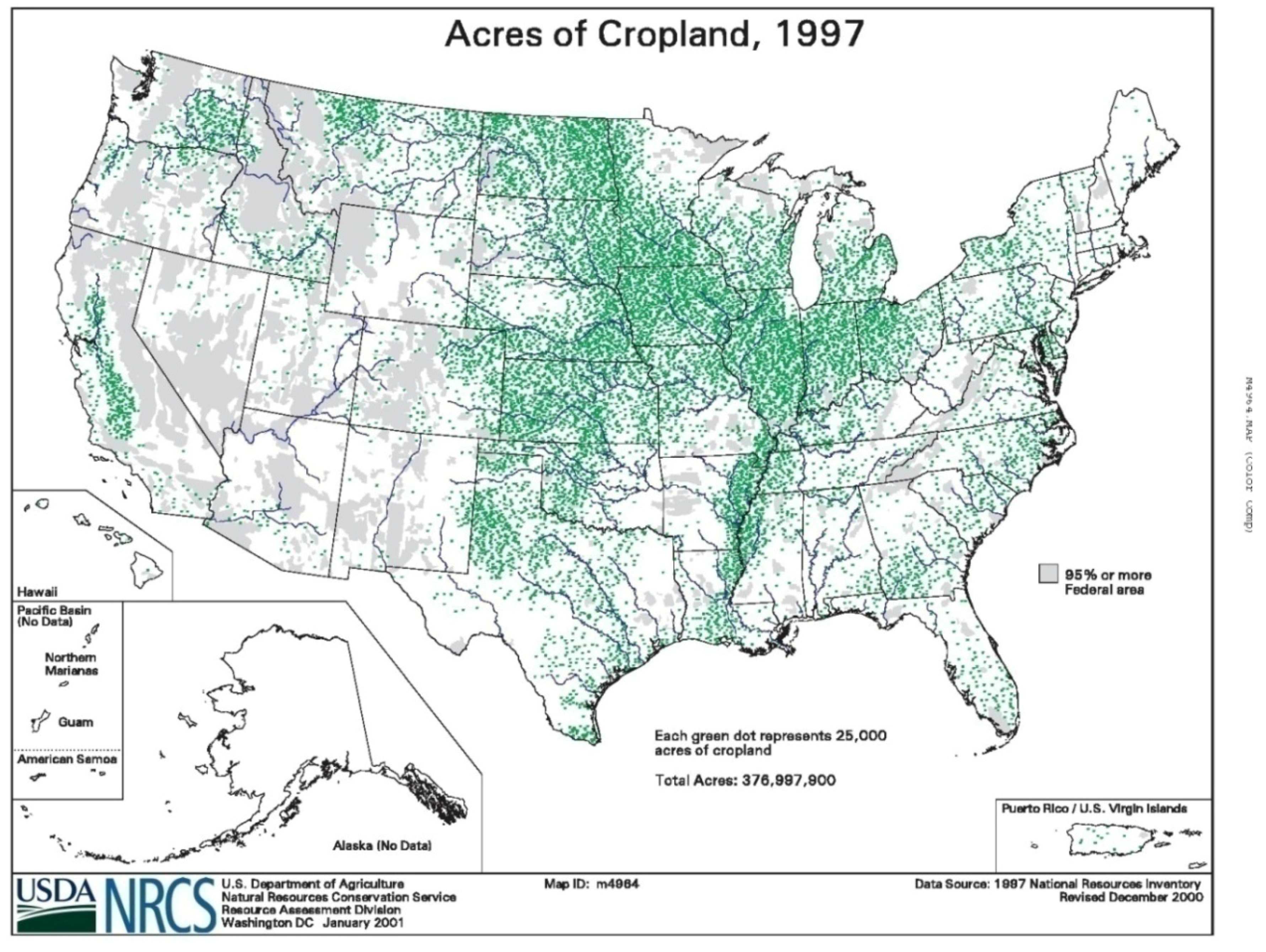 Cropland areas using non-remote sensing approaches with each dot representing 25,000 acres [74]. Cropland areas of USA are determined using various statistical data by NRI. Total cropland areas of USA is 152.56 Mha [74]. Thus about 15.86% of USA’s geographic area (963.1 Mha) are croplands around the year 2000. Thenkabail et al. [1,2] estimates 161.6 Mha. Irrigation intensity actually reduces this area to 157.8 Mha because there is overwhelmingly only one irrigated crop and during this period some of the land is left fallow. Map available at: http://www.nrcs.usda.gov/technical/nri/maps/meta/ m4964.html.