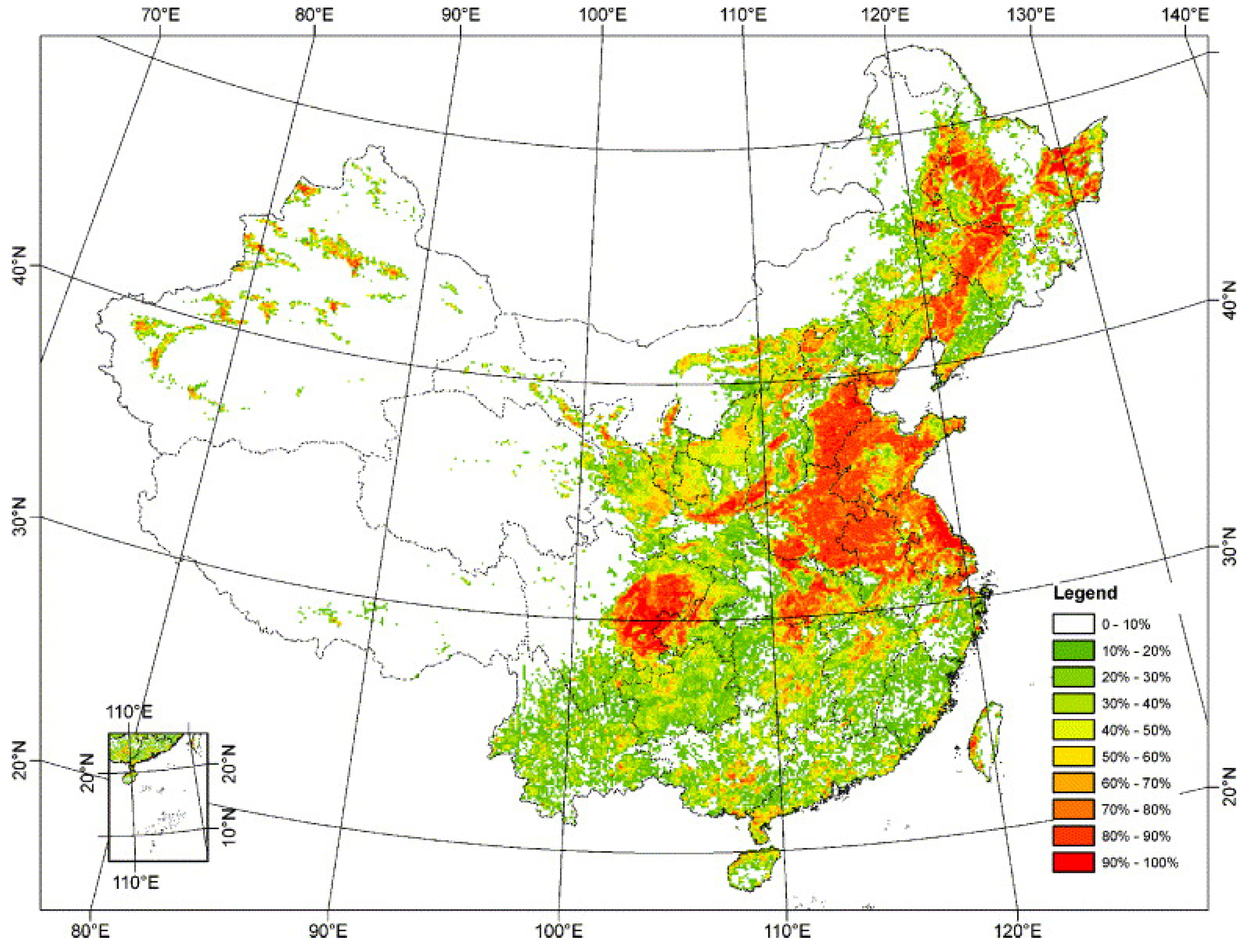 A cropland distribution map of China at 30 m resolution adopted from [58]. Cropland areas of China are determined using Landsat TM 30 m resolution data for 1990–2000. Total cropland areas of China is 141.1 Mha [58]. Thus about 14.35% of China’s geographic area (982.6 Mha) are croplands around the year 2000. This estimate by Liu et al. [58] is lower than 203.8 Mha estimated by Thenkabail et al. [1,2]. This does not include the intensity of irrigated areas which will add an additional 40 Mha [1,2].