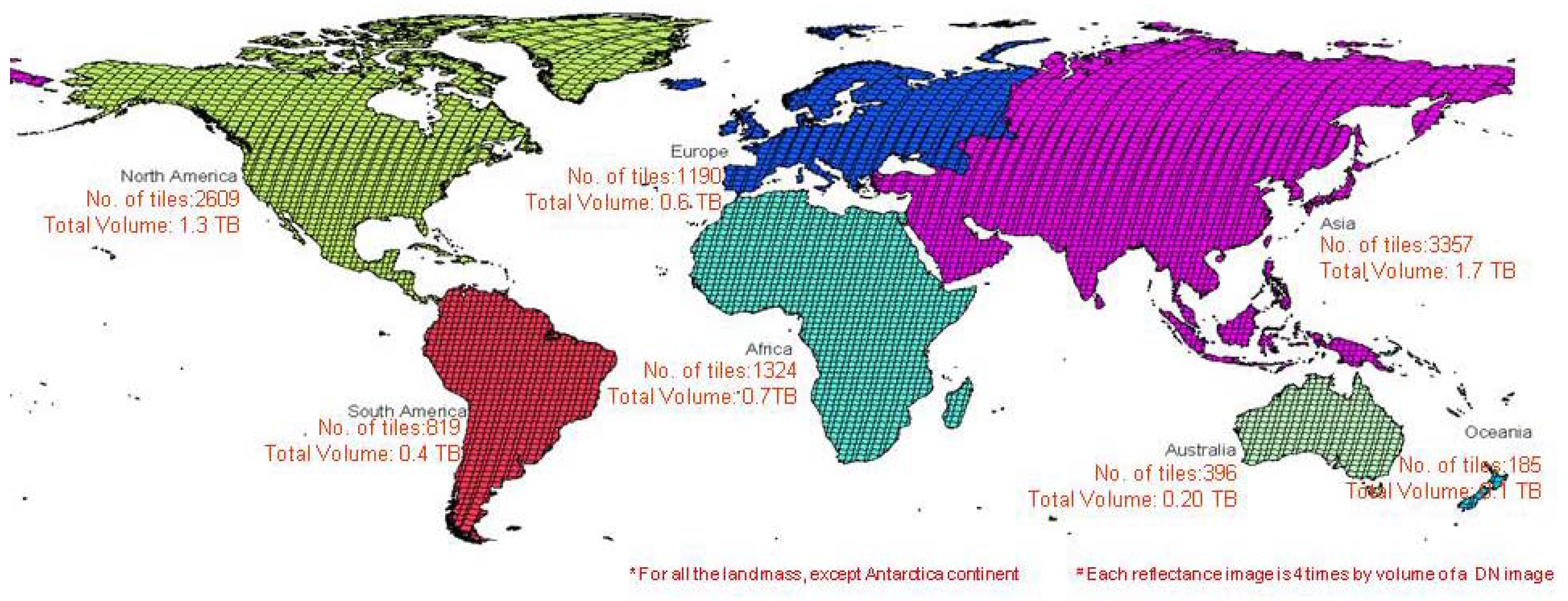 Illustrating the challenges of global mapping at higher spatial resolution. Distribution of Landsat 30 m images for the world. About 9,500 images are required to cover the terrestrial world, with a total data volume of about 20 TB. With advanced compression techniques this can be reduced to about 4 TB. Yet, single shot Landsat images need to be fused with time-series imagery such as MODIS 250 m or 500 m for a realistic analysis of croplands or other land use. This further adds to data volume. Further, processing such high volume data brings its own challenges. This will require us to use super computer facilities. Image Credit: Mr. Manohar Velpuri, South Dakota State University, South Dakota, USA.