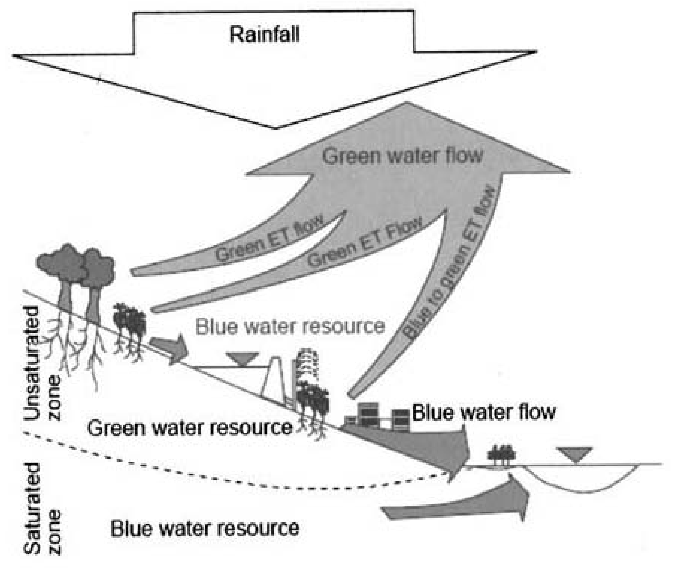 Green water (productive green water or effective rainfall): water in the soil moisture that transpirates through crops and vegetation is termed “green water” since this water is available for crop productivity and vegetation. This water is in the unsaturated zone and readily available for consumptive use by crops. Green water is typically associated with crop production under rainfed conditions and constitutes bulk (70%) of the water used by croplands. The lesser the “green water” used for producing food and fiber crops the greater will be the water productivity. Strategies that improve green water management offer potential to enhance food production even in places with serious water scarcity issues [93].