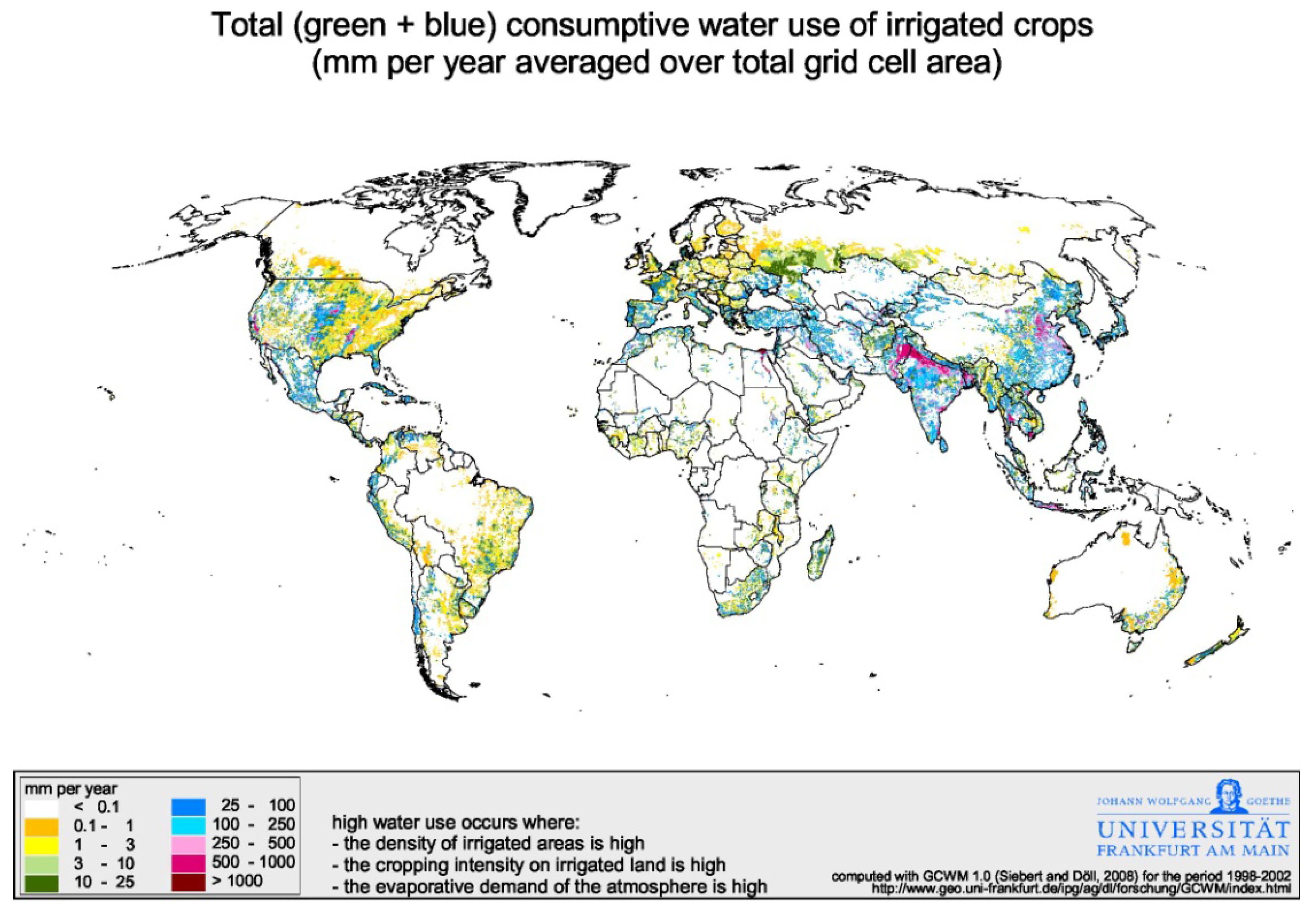 Water required by crops [49,97]. Water required by irrigated croplands shown here includes green water (direct precipitation over the irrigated areas) plus additional blue water required (water from lakes, rivers, reservoirs, and ground water from aquifers) for sustaining crops. The highest water use (500 mm or more) is in the Ganges basin (India), Indus basin (Pakistan), areas near Beijing (China), and California valley (USA). High water use occurs in areas with high irrigation density, cropping intensity, and evaporative demand as noted in the figure. The irrigated areas used to compute water required are from MIRCA2000 data set (www.geo.uni-frankfurt.de/ipg/ag/dl/forschung/MIRCA/index. html) which is derived from Siebert et al. [52].