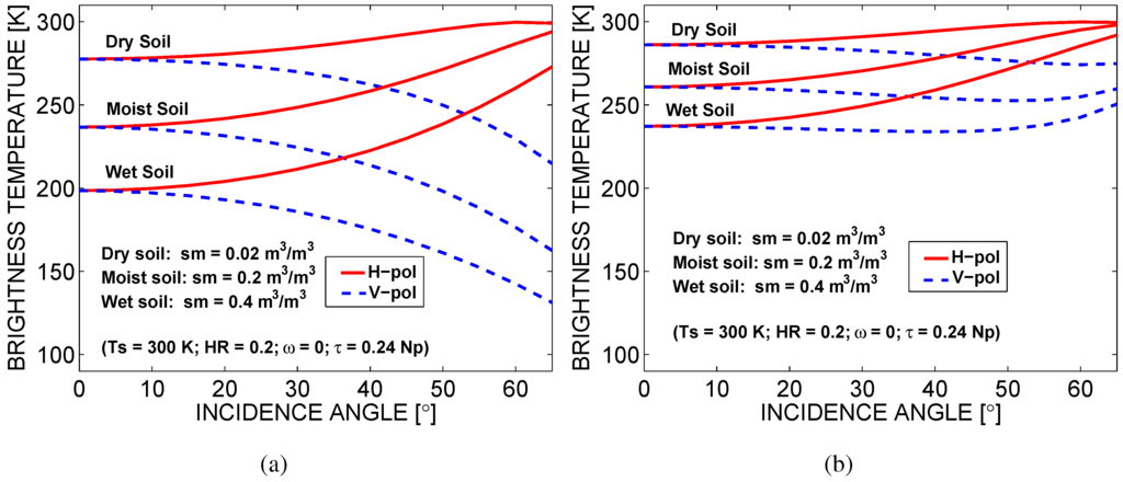 Figure 1 shows the dependence of brightness temperature with incidence angle and polarization for the six scenarios studied, from (1). In the bare soil scenarios on Figure 1(a), it can be seen that H-pol increases with the incidence angle, whereas V-pol decreases with increasing incidence angle. Figure 1 (b) shows that vegetation increases the soil emissivity, and decreases the difference between the vertically and horizontally polarized brightness temperatures, and between the dry and wet soil conditions. This indicates that correction for the effects of vegetation is necessary to obtain accurate soil moisture estimates. Furthermore, retrievals become increasingly unreliable as the opacity of the vegetation layer increases [41]. Figure 1 also illustrates that the emissivity of dry soils is greater than the emissivity of wet soils, with a soil brightness temperature variation at nadir of ∼ 80 K in the bare soil scenarios and of ∼ 40 K in the vegetation-covered scenarios. In the two cases, this variation is much larger than the noise sensitivity threshold of a microwave radiometer (typically < 1 K), so that a large signal-to-noise ratio is obtained. This is a major advantage of the passive microwave technique for soil moisture remote sensing. Likewise, the SMOS mission was defined to make full use of dual-polarized multi-angular L-band acquisitions: by registering a lot of independent information of each pixel, it is expected that soil and vegetation contributions could nicely be separated [9].