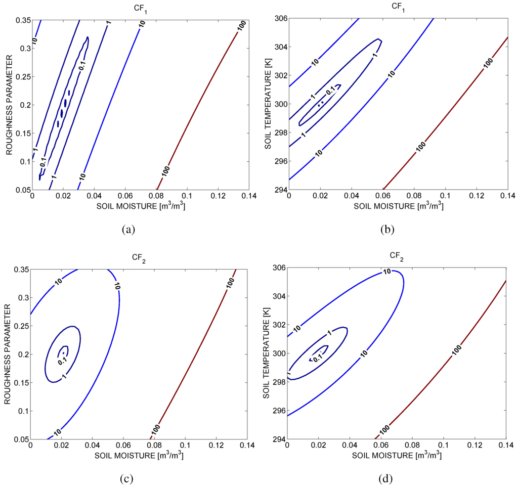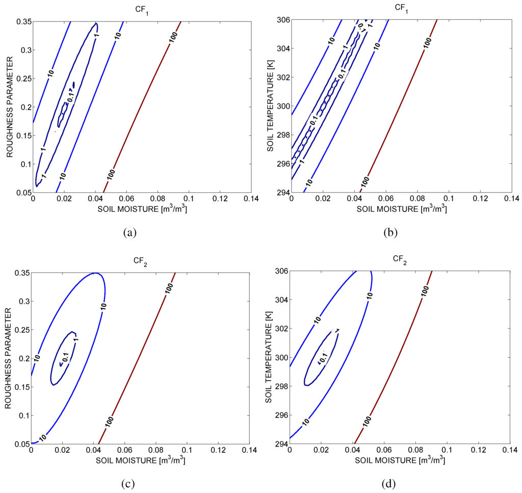 Cost functions formulated using over a vegetation-covered dry soil scenario. Contours of vs. (a) and vs (b), with no constraints on the cost function (). Contours of vs (c) and vs (d), adding constraints on all parameters, except for ().