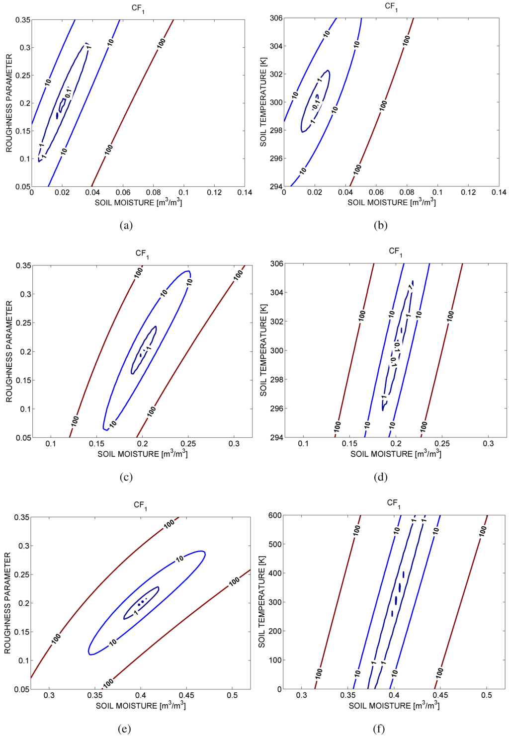 Cost functions formulated using with no constraints. Contours of vs. (a) and vs (b) over a bare dry soil scenario. Contours of vs. (c) and vs (d) over a bare moist soil scenario. Contours of vs. (e) and vs (f) over a bare wet soil scenario.