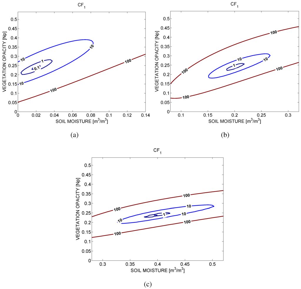 The presence of a sparse vegetation layer is examined in Figure 3. It can be noticed that the contours plotted are clearly widened if compared to those on Figure 2, which indicates a higher uncertainty in the soil moisture retrievals over vegetation-covered surfaces, as expected. The vegetation canopy attenuates the soil emission and diminishes the forward model sensitivity to ; as the observed soil emissivity decreases with an increase in vegetation biomass, the soil moisture information contained in the microwave signal decreases [6].