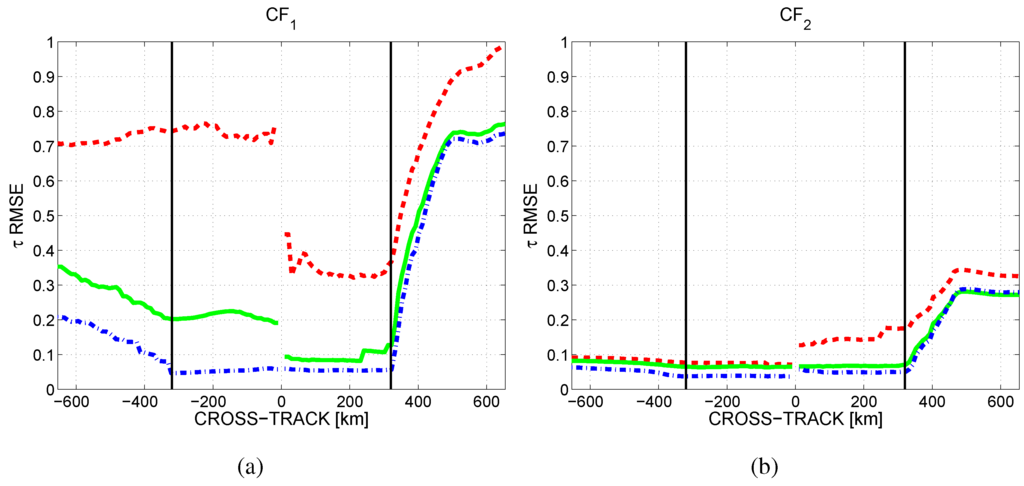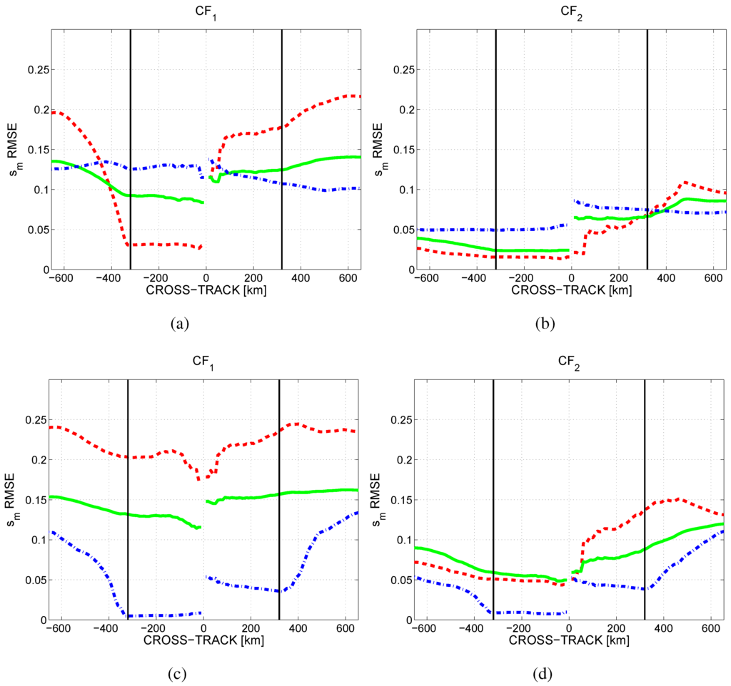 It must be remarked that in the results presented on Table 3, Table 4, and Table 5, all pixels in the SMOS field-of-view (FOV) are considered, regardless of the number of measurements on each pixel. However, due to the SMOS observation geometry, all pixels in the FOV do not have the same properties: as the pixel’s distance to the ground-track increases, the pixel is imaged fewer times, its angular variation is reduced and the instrument’s noise increases [15]. This fact indicates that better accuracies should be expected if only the central part of the FOV—the so-called Narrow Swath (640-km) [50]—is considered. However, note that the use of Narrow Swath implicates a temporal resolution of 7 days, which will limit the applicability of the data. Still, the possibility of increasing the accuracy of the retrievals by considering a narrower swath should not be neglected. Hence, the retrieval performance has been explored further in Figure 6 and Figure 7, as a function of the ground-track distance.