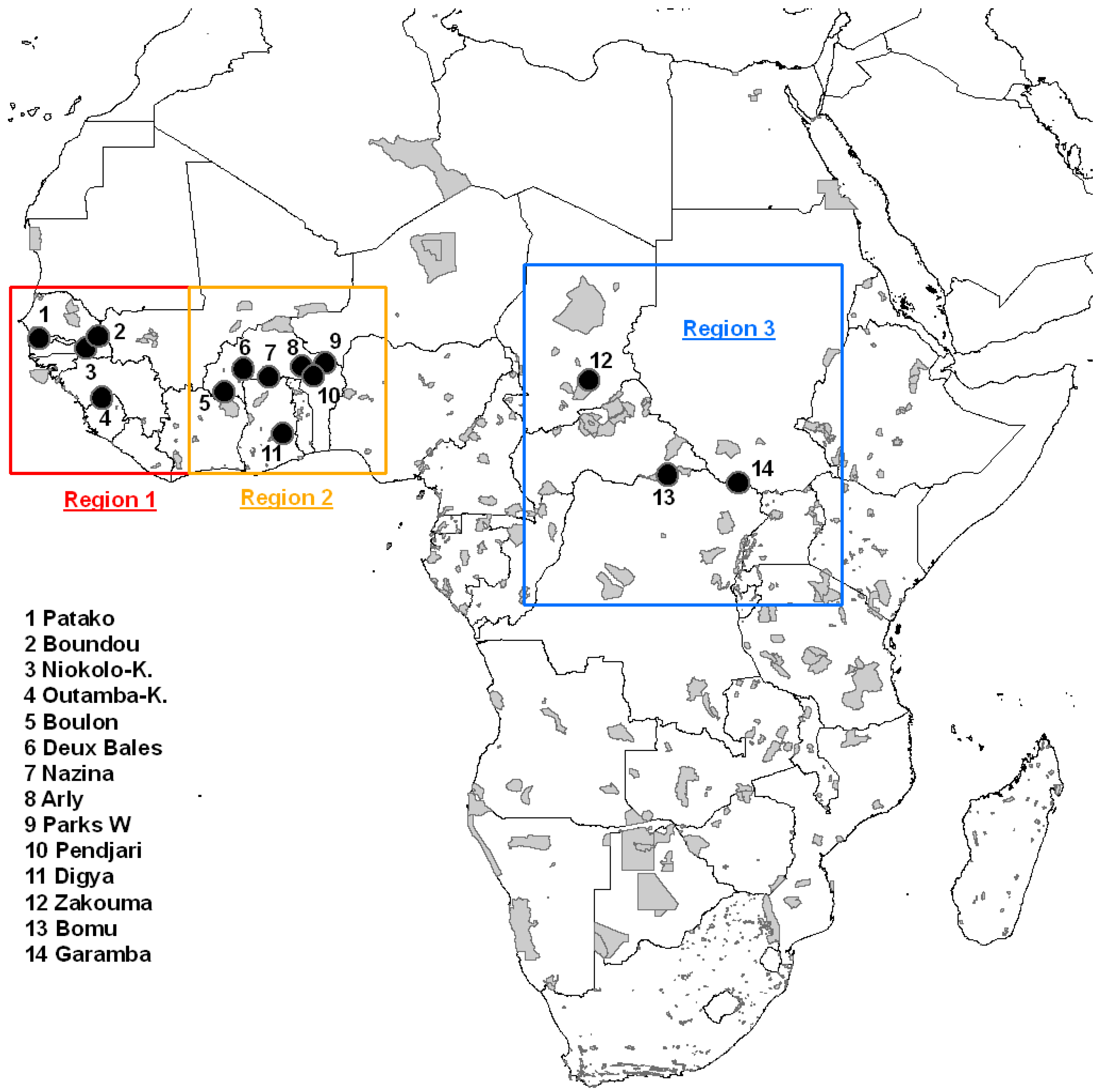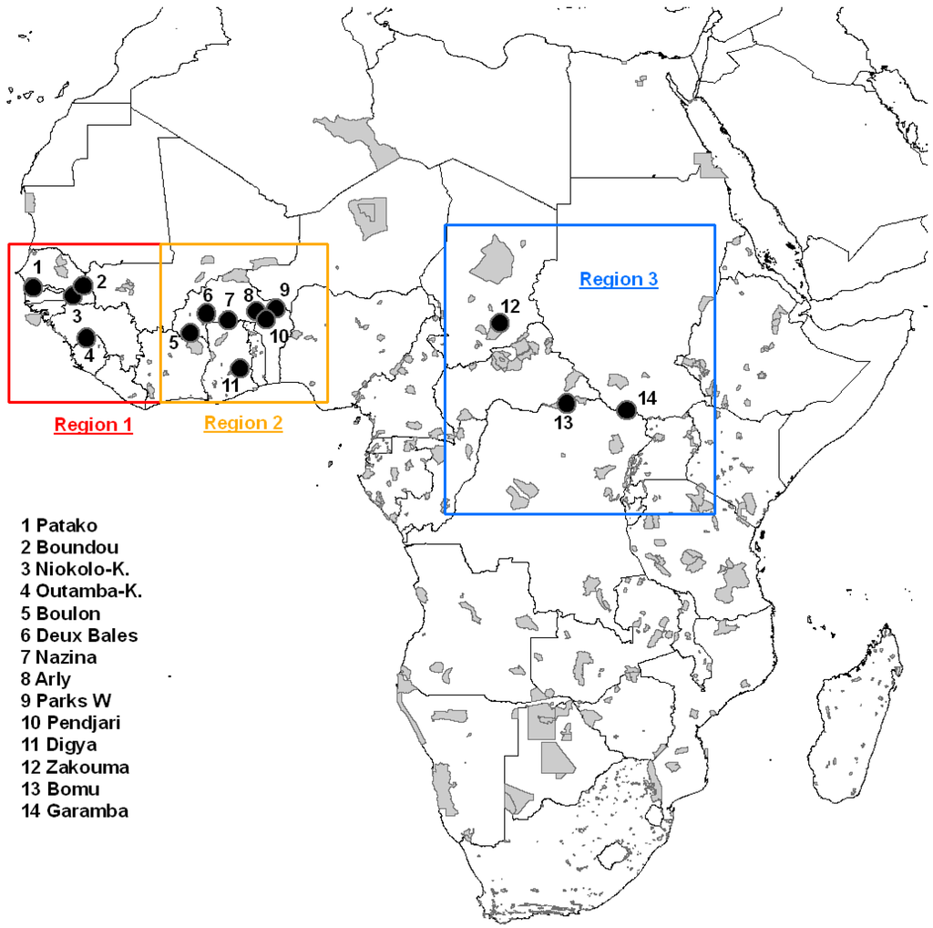 The transboundary Park W is made up of three national parks: the Park W-Benin, Park W-Burkina and Park W-Niger. Together with a set of five other protected areas, Park W forms the ecological complex known as the WAP which extends over about 30,000 km2: the faunal reserves of Arly and Singou, in Burkina Faso; the National Park Boucle de la Pendjari, in Benin; and the partial reserves of Kourtiagou and Pama, in Burkina Faso. Park W has the peculiarity to be in the transition zone between the Sudanian and Sahelian ecoregions [1]. Since November 2002, the Park W is a Transboundary Biosphere Reserve. The Patako classified forest in Senegal belongs to the Fatick administrative region, in the South of the country. It covers an area of 6,043 ha, on the border with Gambia, in the transition zone between the Guinea-Congolia/Sudanian and the Sudanian ecoregions. The Boulon classified forest in Burkina Faso is part of the Comoé province, in the SW of the country, in the border region with Côte d’Ivoire. It covers 13,523 ha in the Sudanian ecoregion.