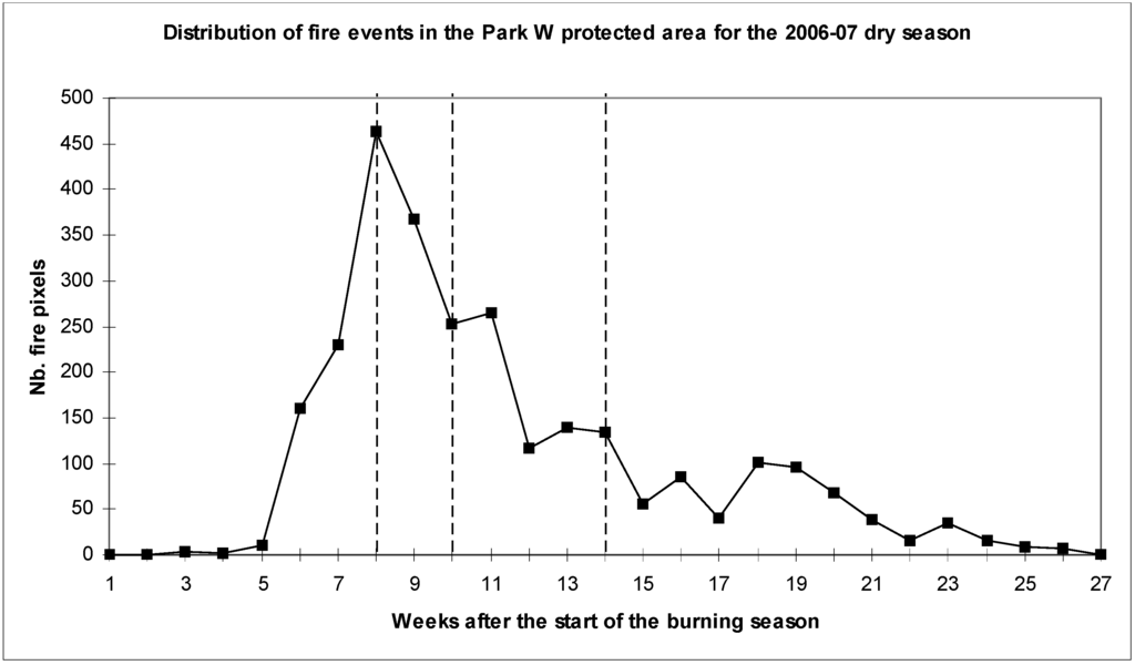 One could say that the assumption of the potential burning season starting during the first week of October might not reflect totally the reality on the field. The observations done during the five dry seasons considered here show that this hypothesis is quite acceptable. In fact, the cumulative number of fire pixels detected during the 1st week of October over the five year period (Table 2) is 0 for 10 PAs out of 16, less or equal to 3 for four PAs and 5 and 11 for the last two PAs. However, this assumption might not remain valid for ever. Modifications of the length of the rainy season, driven by the ongoing climate change, might in the future change the temporal characteristics of the burning seasons. Time series of satellite data should allow to detect such changes, if they become reality.